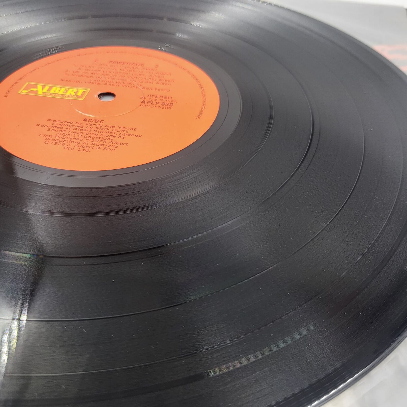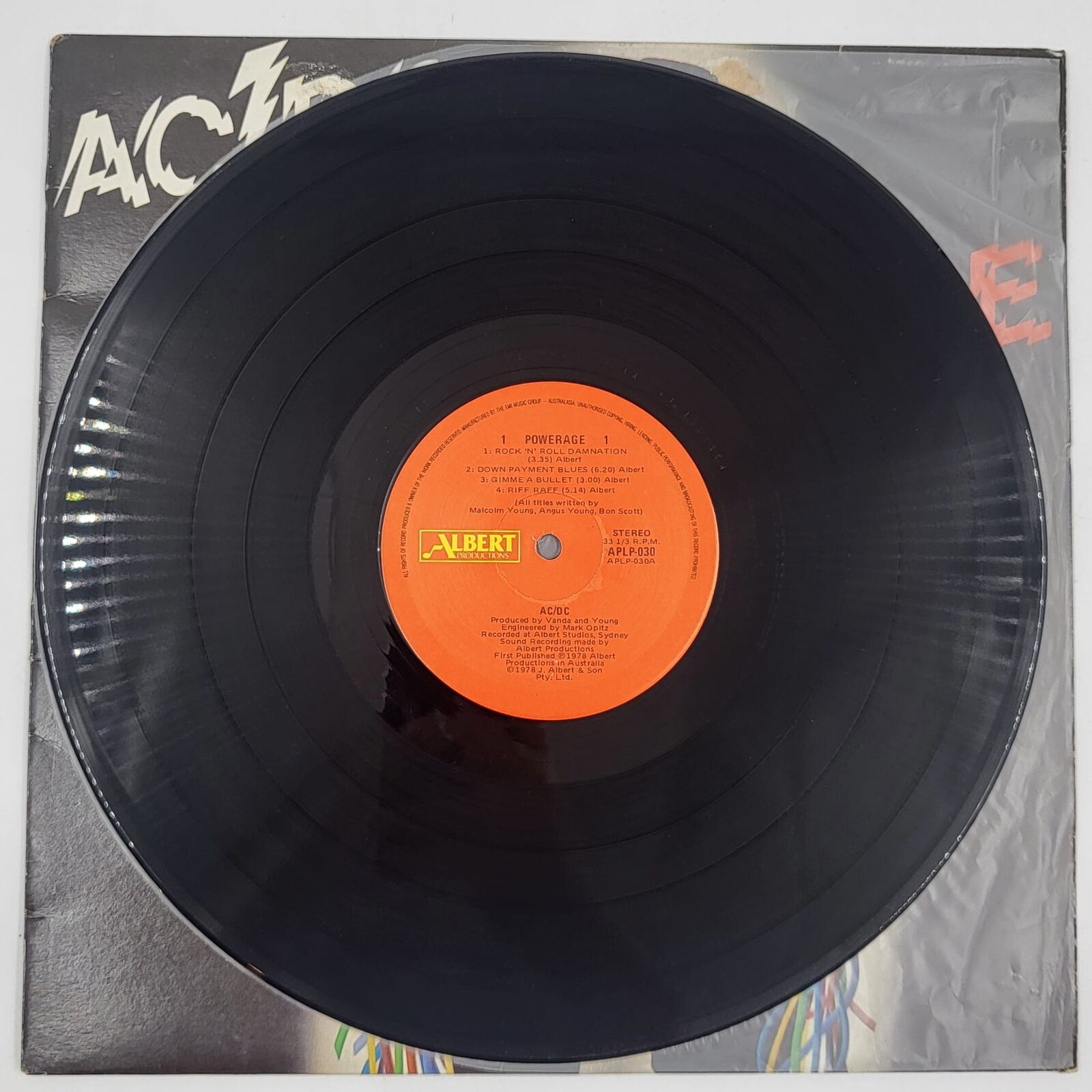 This is the sought-after 1987 Australian pressing of AC/DC’s studio album, Powerage. Released under the Albert Productions label (Catalog: APLP.030), this reissue features the distinctive red center labels.