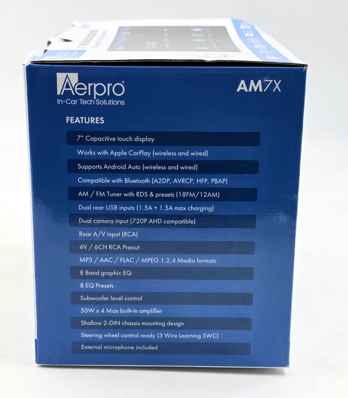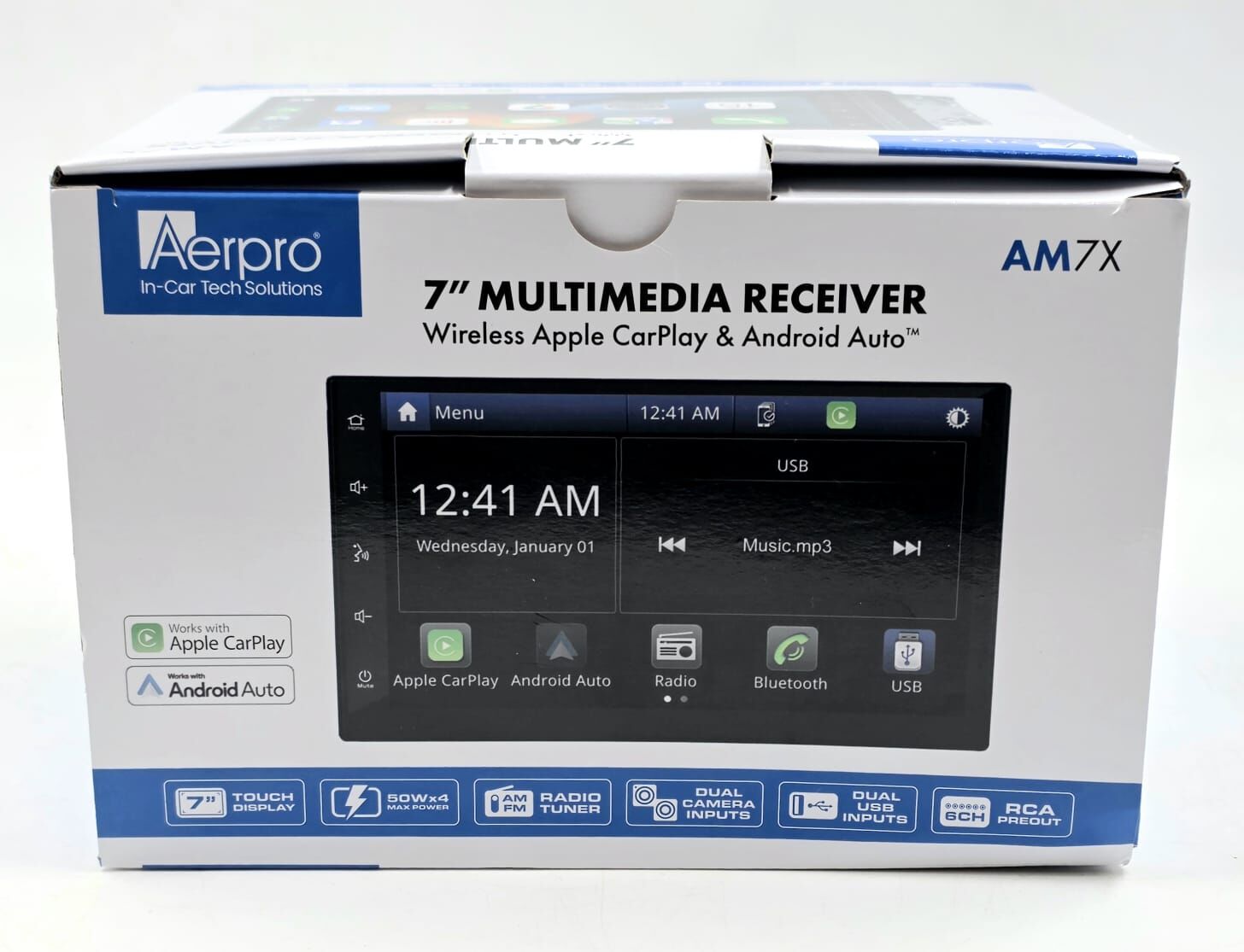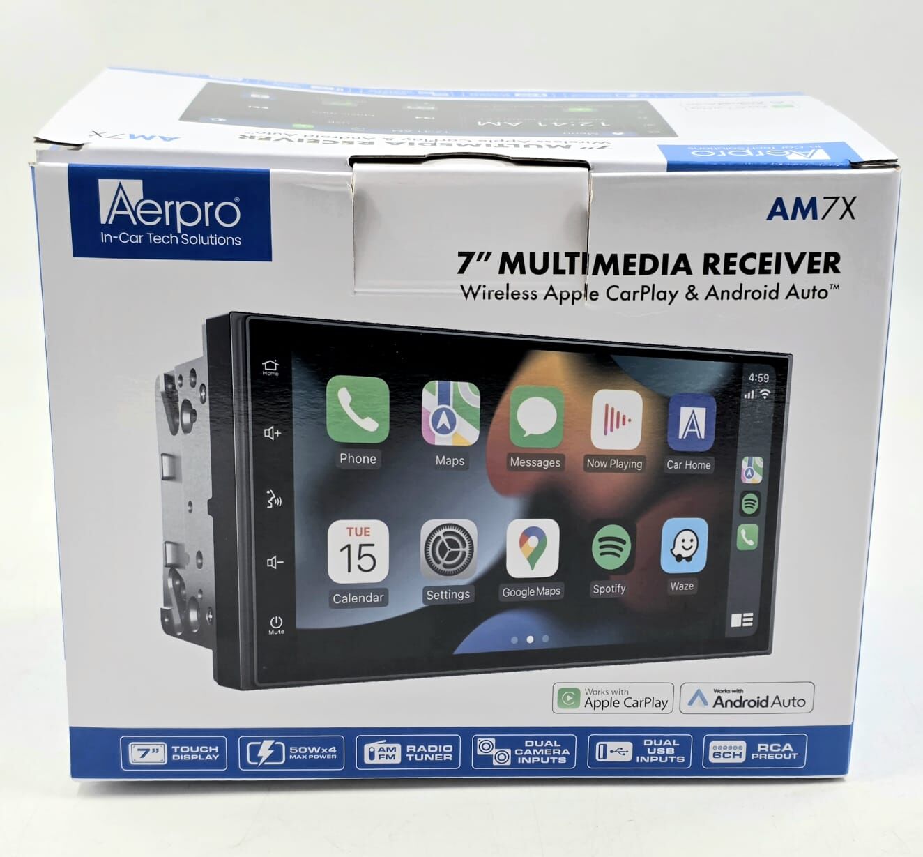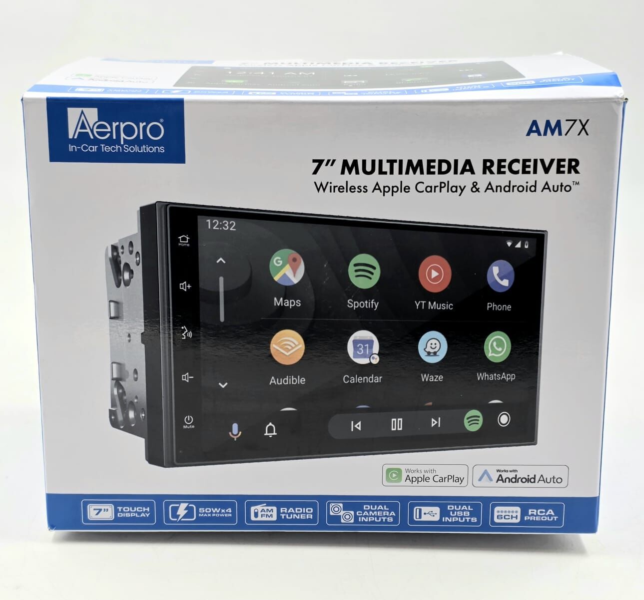 Elevate your driving experience with the Aerpro AM7X 7-inch multimedia receiver, a double DIN headunit featuring wireless and wired Apple CarPlay and Android Auto compatibility. This unit includes a capacitive touch display, built-in Bluetooth for hands-free calls and streaming (A2DP, AVRCP, HFP, PBAP), and an AM/FM tuner with RDS and presets (18 FM/12 AM). Additional features encompass dual rear USB inputs, dual 720P AHD camera inputs, 4V/6CH RCA preouts, 8-band EQ, and a 45W x 4 amplifier for superior audio. Its shallow 2-DIN chassis simplifies installation while supporting steering wheel controls.
