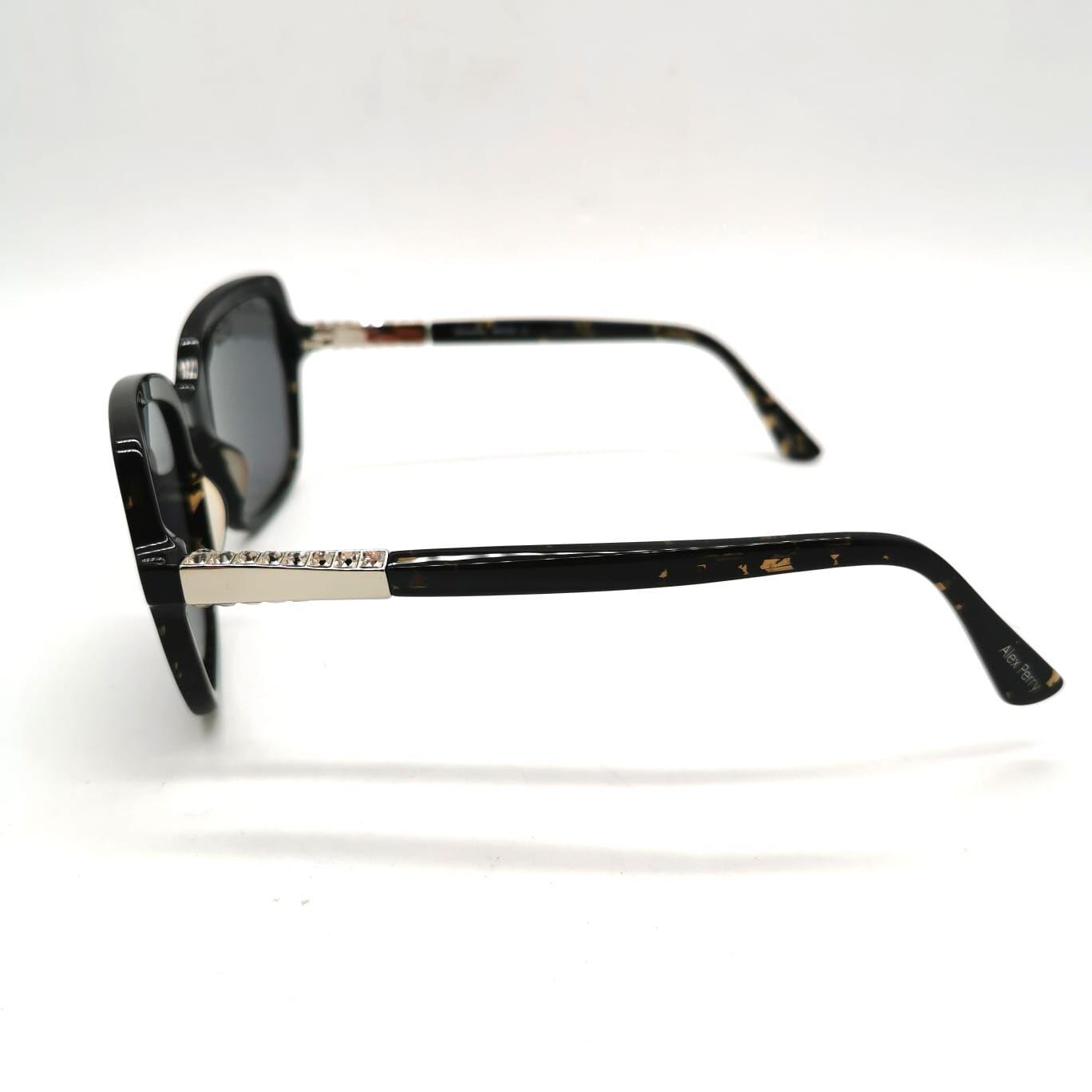 The Alex Perry AP Sun Rx 45 sunglasses (30746442) feature an oversized square/butterfly frame made from black acetate with an amber and gold fleck pattern. These ladies sunglasses include grey tinted lenses and silver tone metal temples with inset clear crystals. Technical specifications consist of a 58mm eye size, a 17mm bridge width, and a 145mm temple length. The Alex Perry brand name is marked on the inner temple tips, with additional technical details printed on the inner temples.