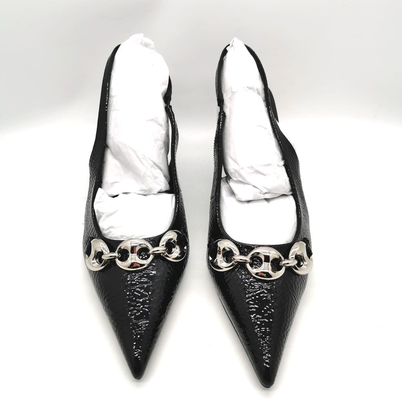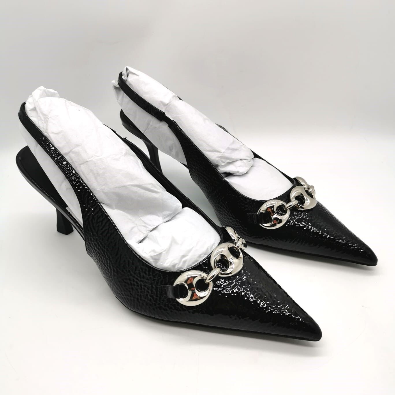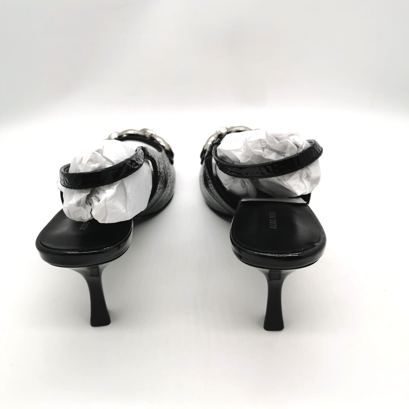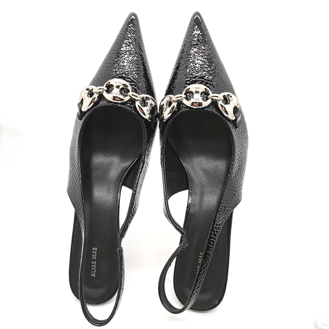 Step out in style with these Alias Mae Amber shoes featuring a sleek pointed toe slingback design. Crafted from 100% genuine leather upper and lining, they offer luxury and comfort. The eye-catching chunky chain link metallic detail adds an edgy touch, while the approximately 7.5cm heel height gives an elegant lift. Perfect for dressing up or casual wear, these black crinkle patent shoes combine modern fashion with timeless quality.