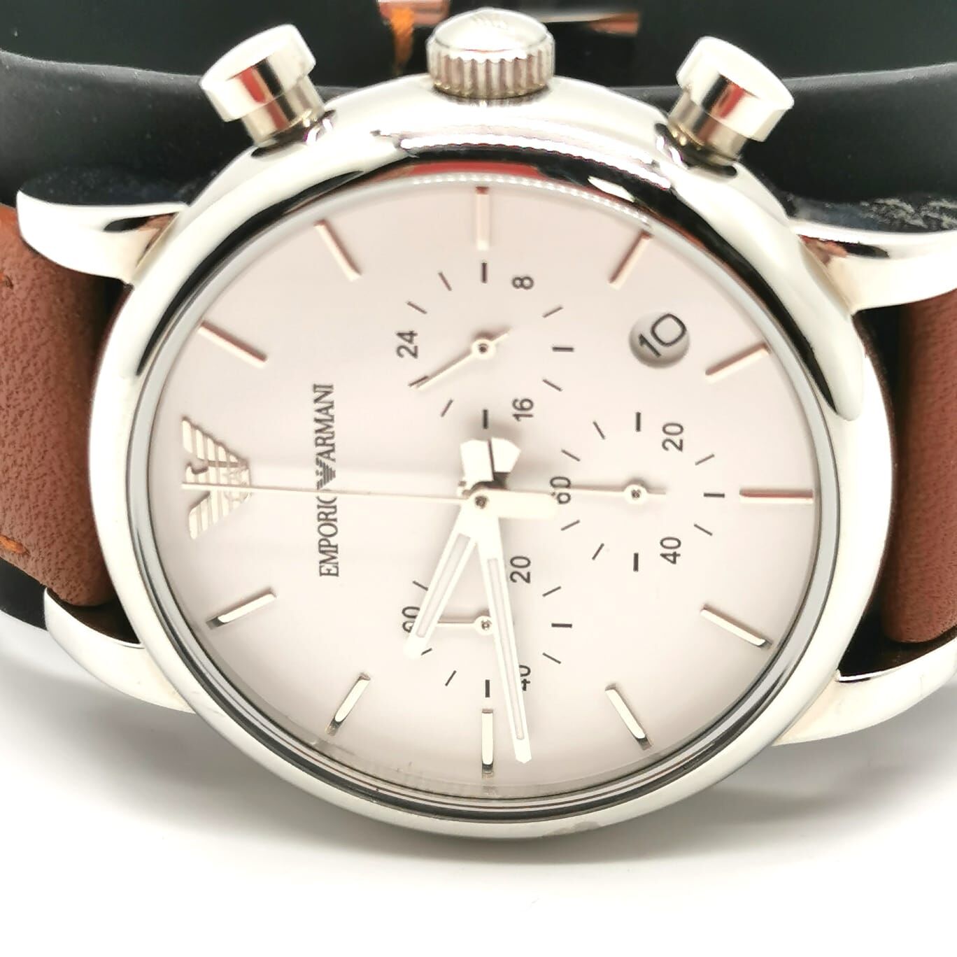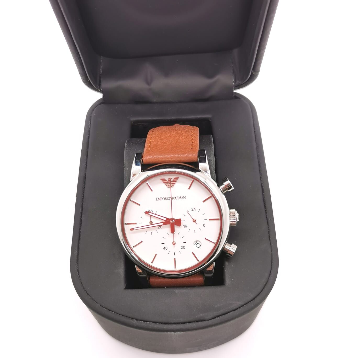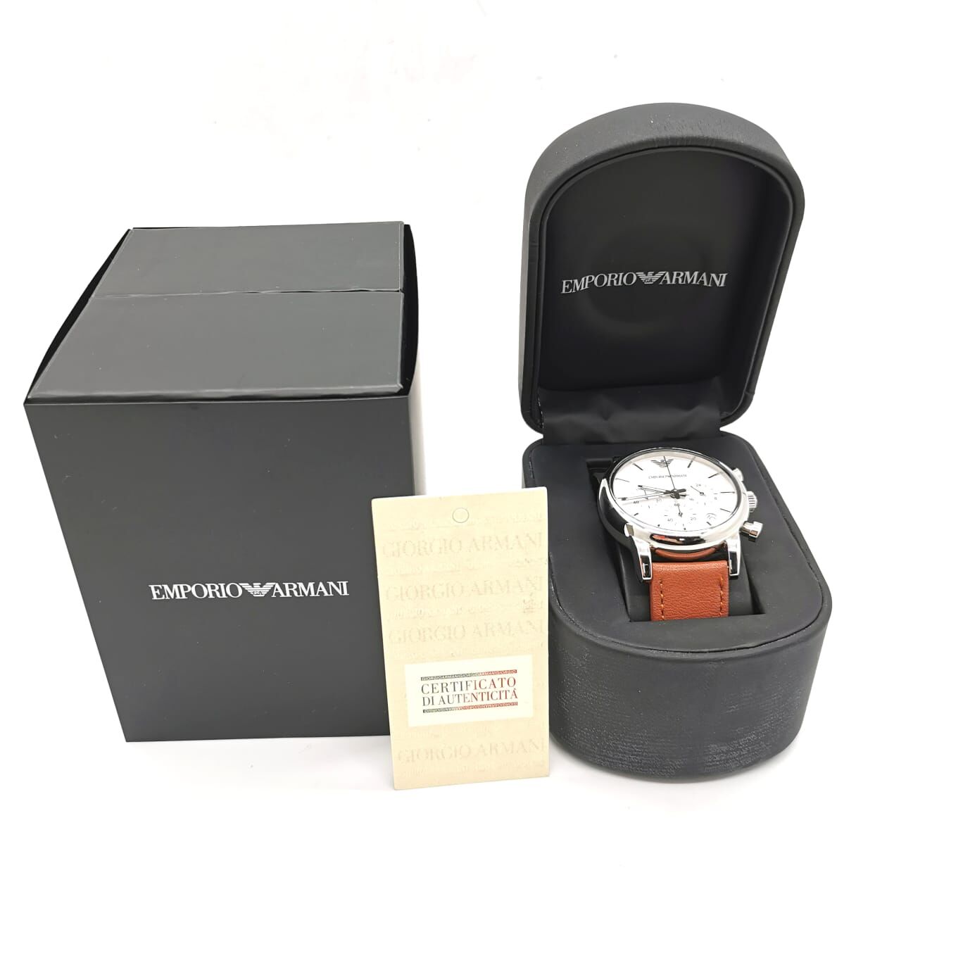 Armani Emporio White Dial Brown Leather Chronograph Mens Watch with Box