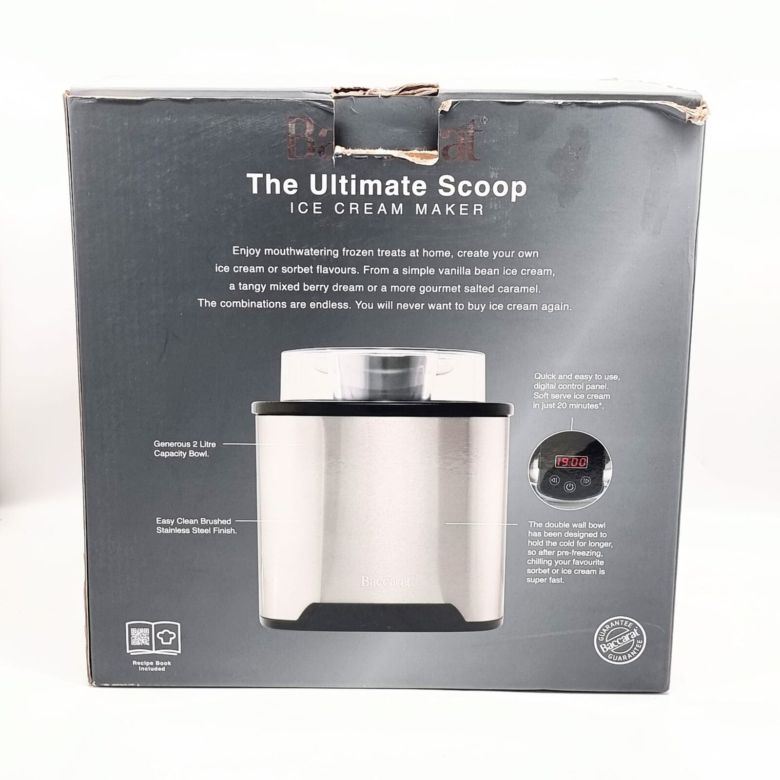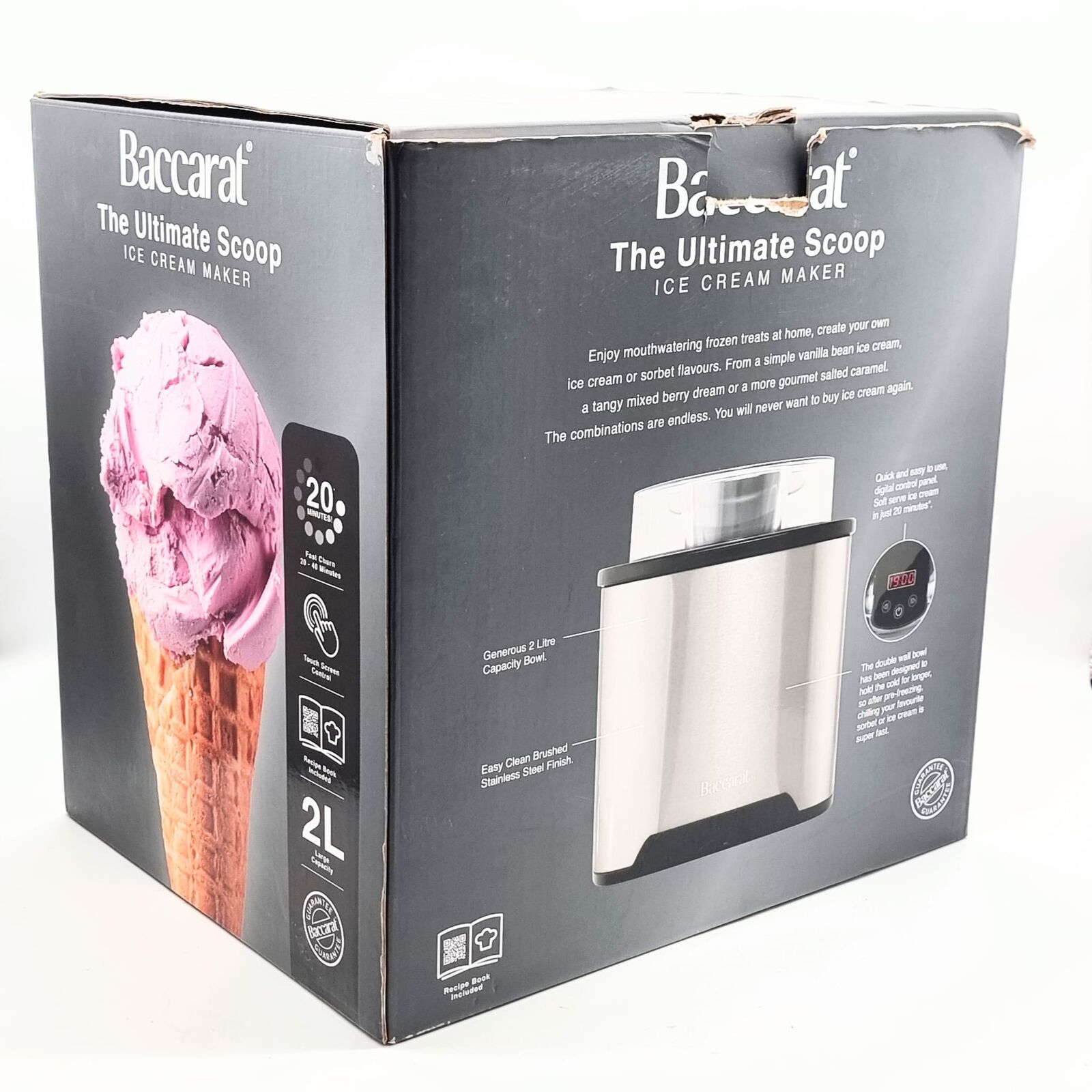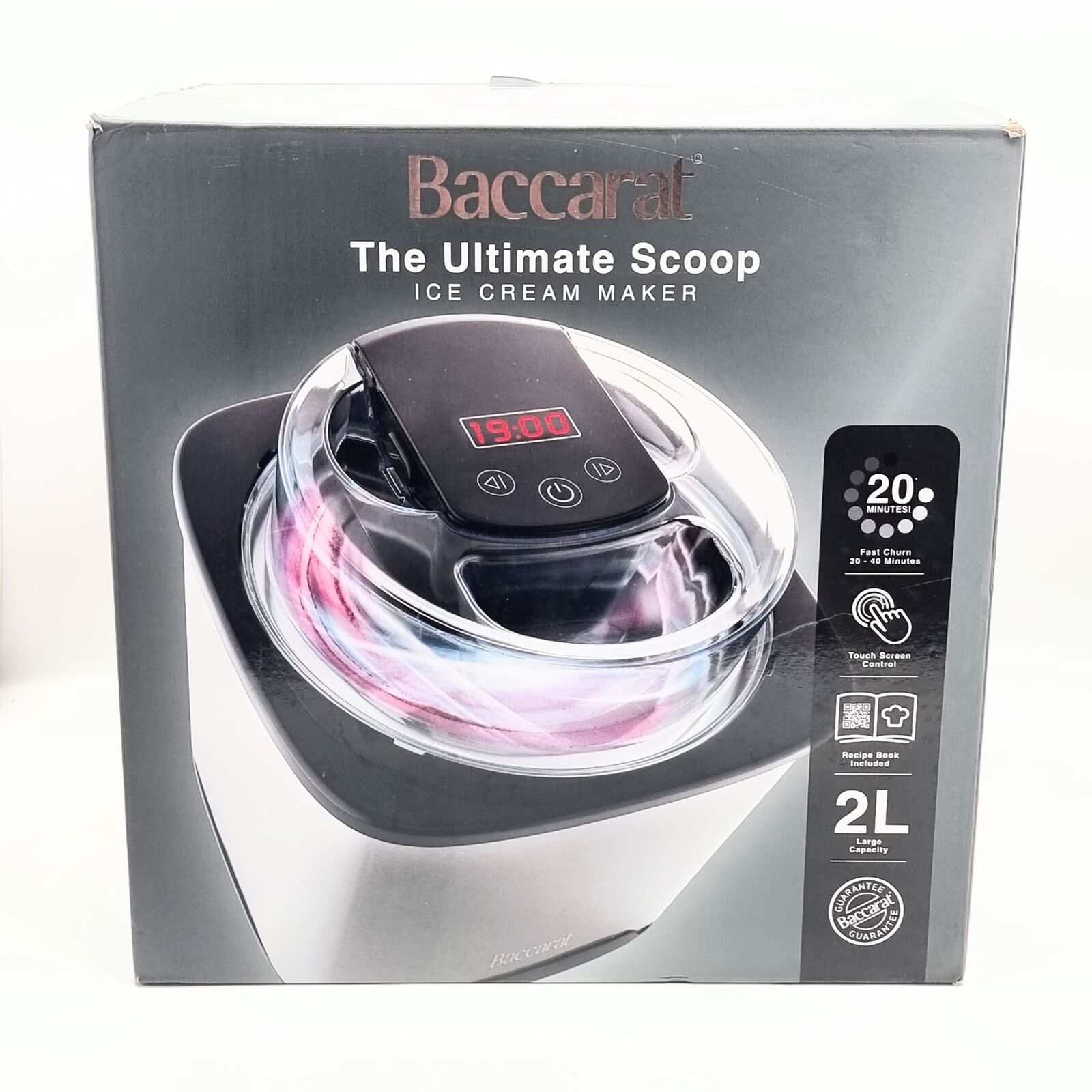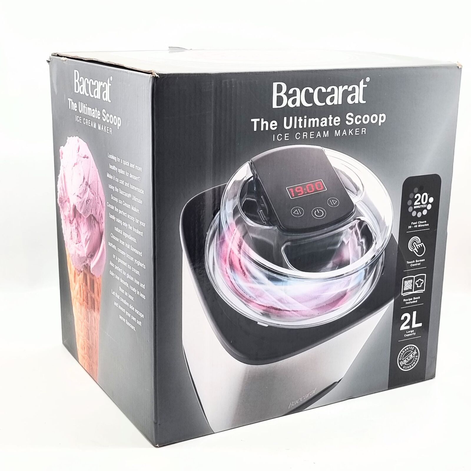 Create delicious homemade frozen treats with the Baccarat The Ultimate Scoop Ice Cream Maker. Designed for convenience and performance, this frozen dessert maker allows you to effortlessly produce smooth, creamy ice cream, sorbet, and frozen yogurt from the comfort of your kitchen, with a 2 L bowl that typically churns soft‑serve‑style results in around 20 minutes after pre‑freezing.