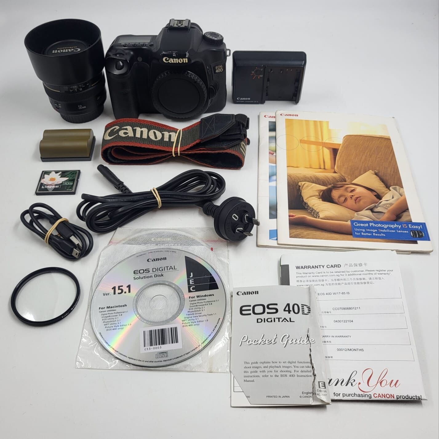 Capture stunning photos with this Canon EOS 40D DSLR Camera Kit, perfect for photography enthusiasts and professionals alike. This kit includes everything you need to start shooting immediately, including the highly regarded Canon EF 50mm f/1.4 lens, battery, charger, memory storage, and protective accessories.