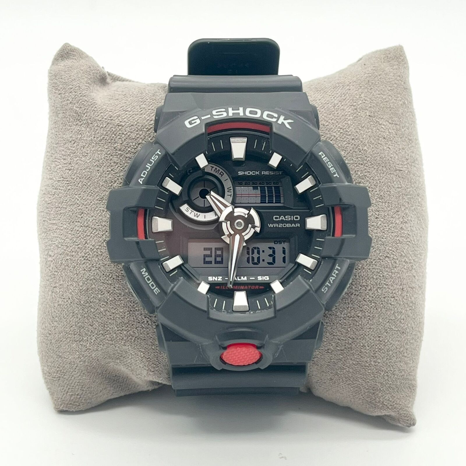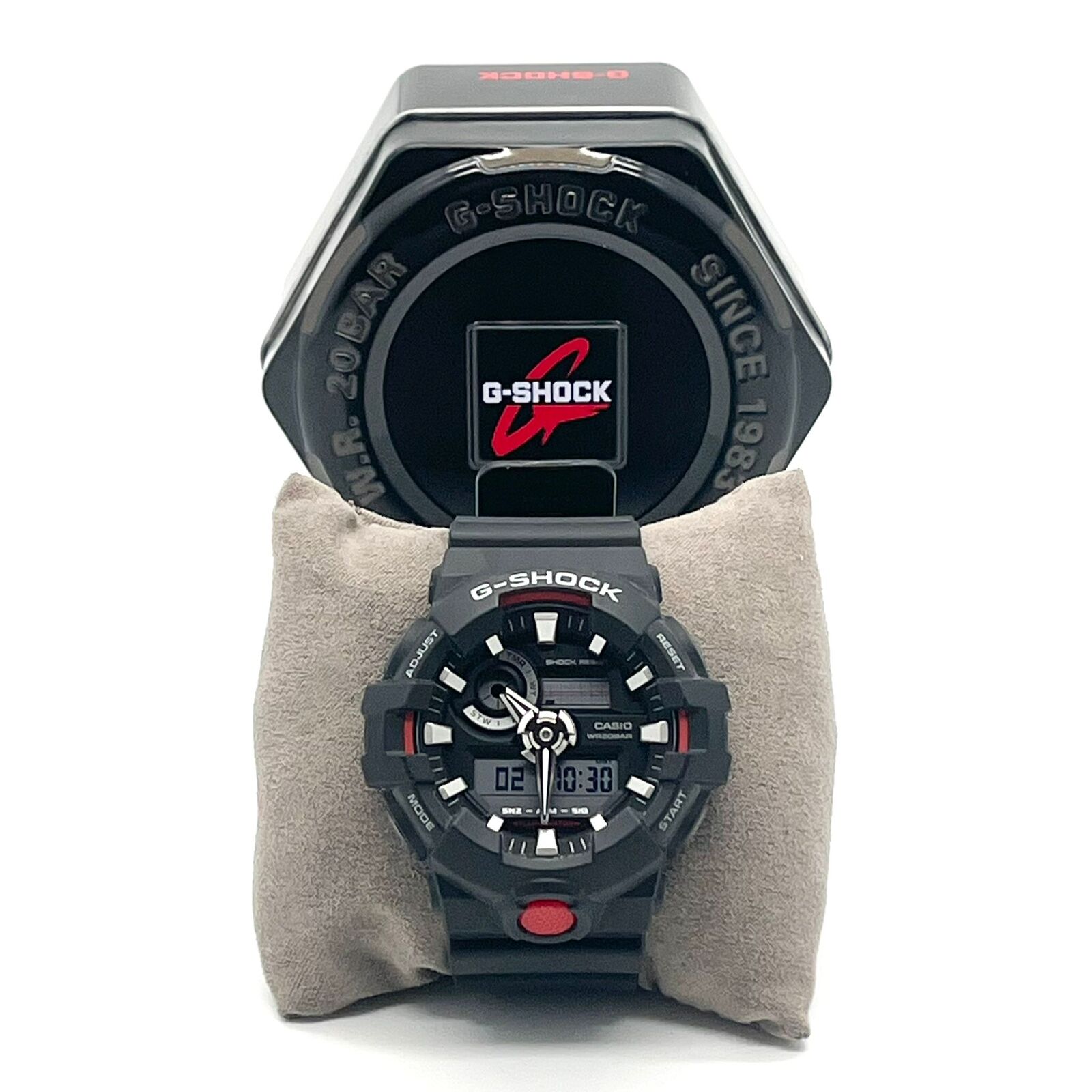 The Casio G-Shock GA-700-1A is built like a tank for everyday toughness, with G-Shock's legendary shock resistance that shrugs off impacts. This black analog-digital watch combines bold oversized case design, high-contrast hands, and a Super Illuminator LED backlight for easy readability day or night.