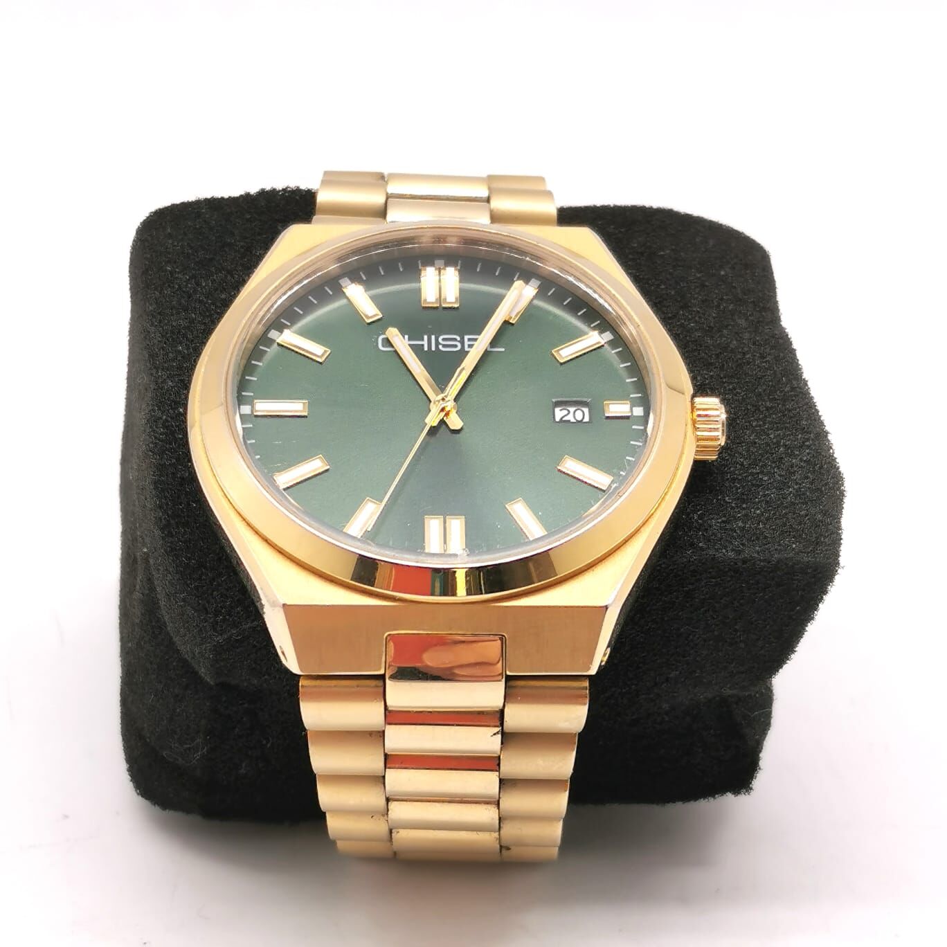 The Chisel 5821044 is a men’s analog watch featuring a sunray green dial housed in a gold-tone stainless steel case. The dial includes gold-tone indices and a date window at the 3 o’clock position. It is fitted with a matching gold-tone stainless steel link bracelet and a secure folding deployment clasp.