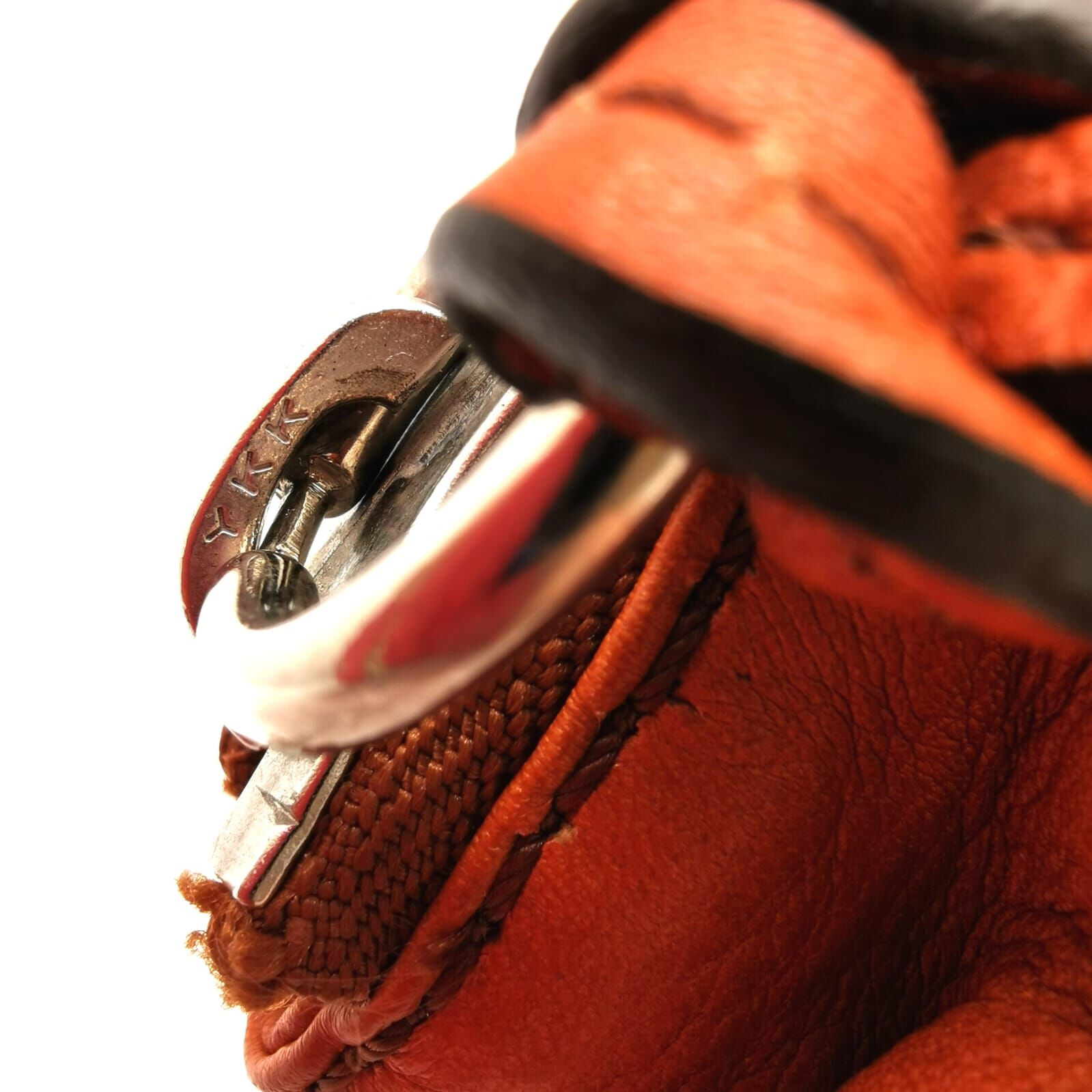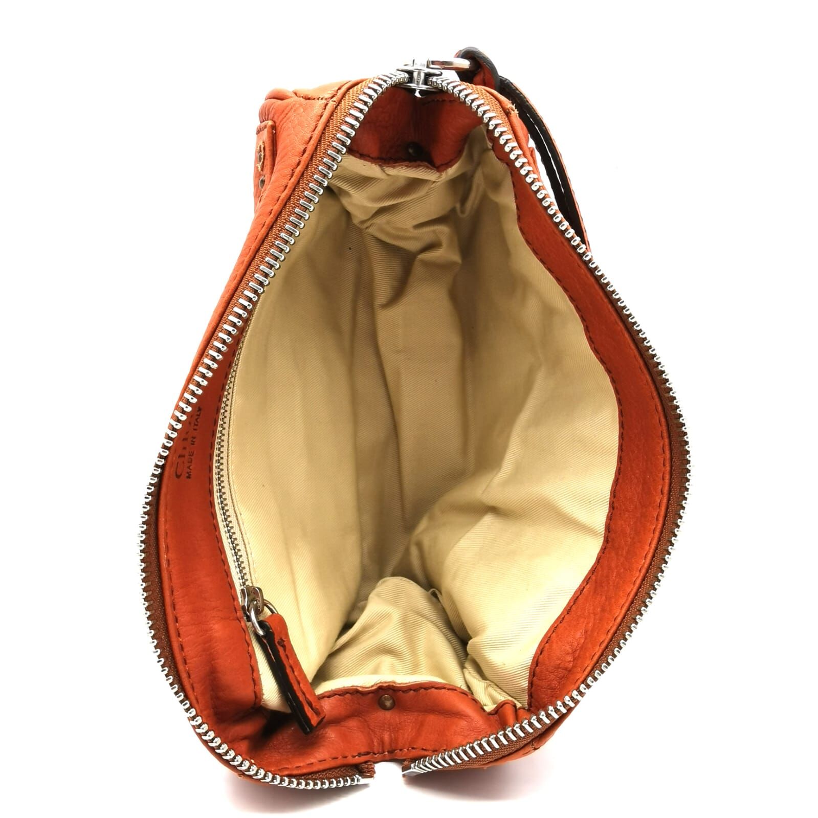 - Closure: Top zip with integrated leather wristlet pull strap
