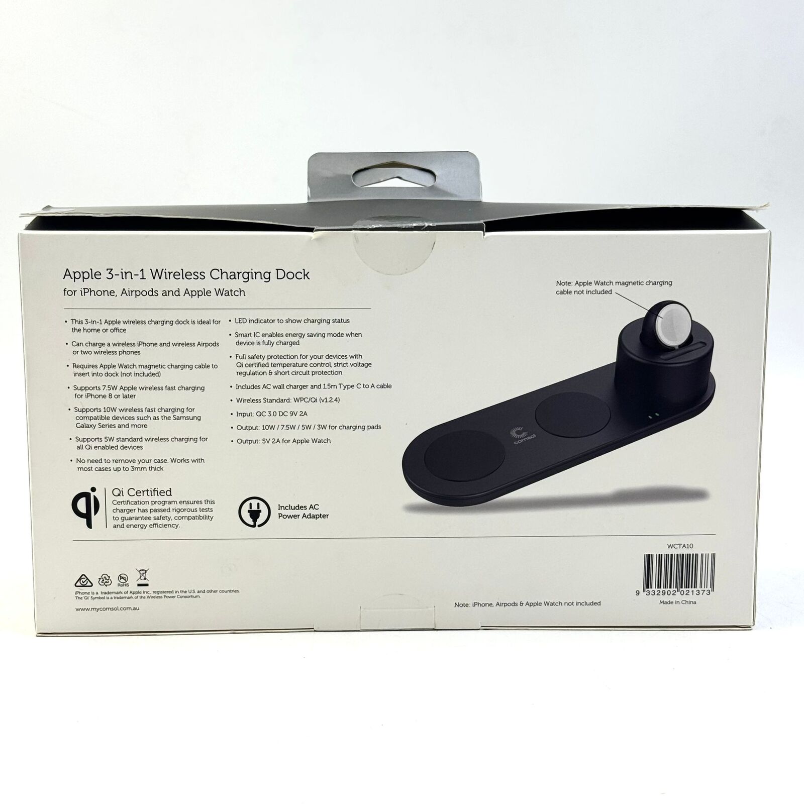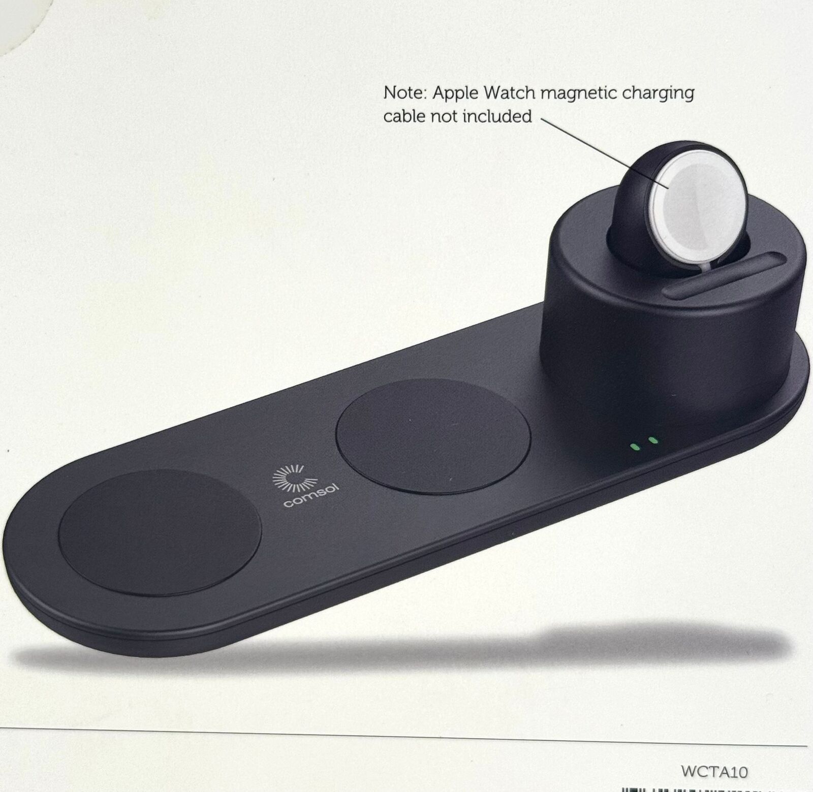 Elevate your charging setup with the Comsol WCTA10 3-in-1 Wireless Charging Dock, perfect for home or office use. This Qi-certified station simultaneously powers your Apple ecosystem: a wireless iPhone (7.5W fast charging for iPhone 8+), AirPods or a second phone (up to 10W for Samsung Galaxy and compatible devices), and Apple Watch (magnetic cable required, not included). Enjoy hassle-free charging without removing cases up to 3mm thick. An LED indicator shows status, while smart IC tech activates energy-saving mode when full. Full safety features include temperature control, voltage regulation, and short-circuit protection. Compact and reliable for daily use.