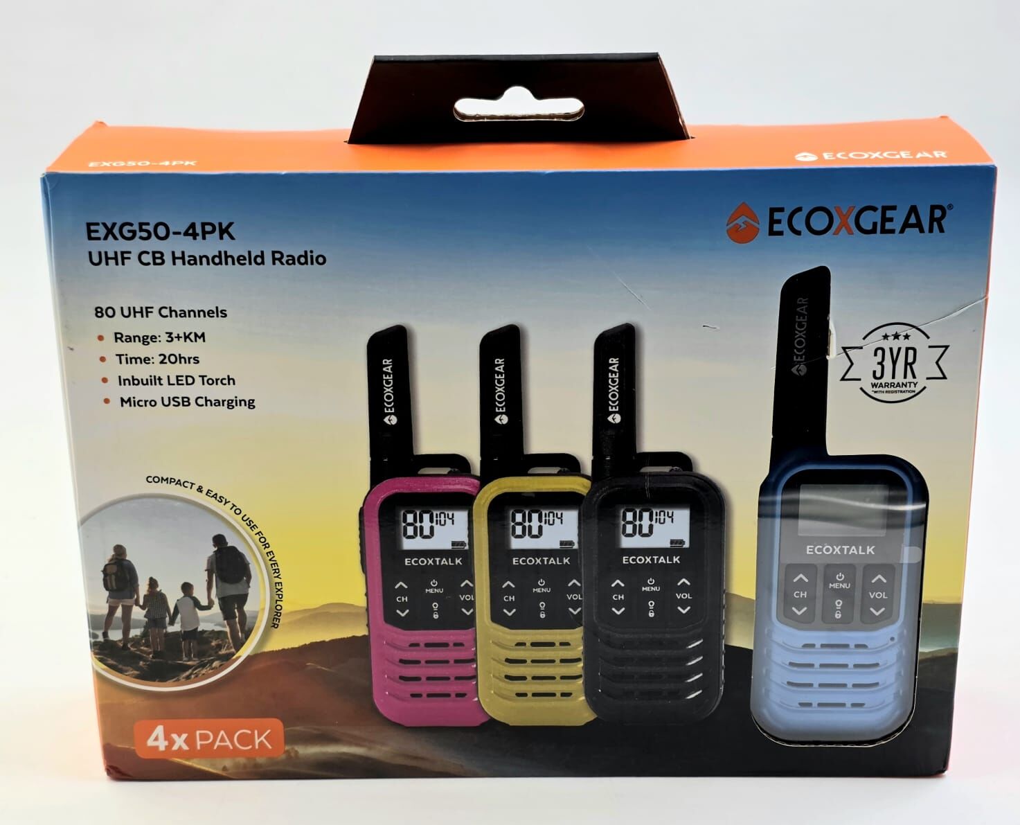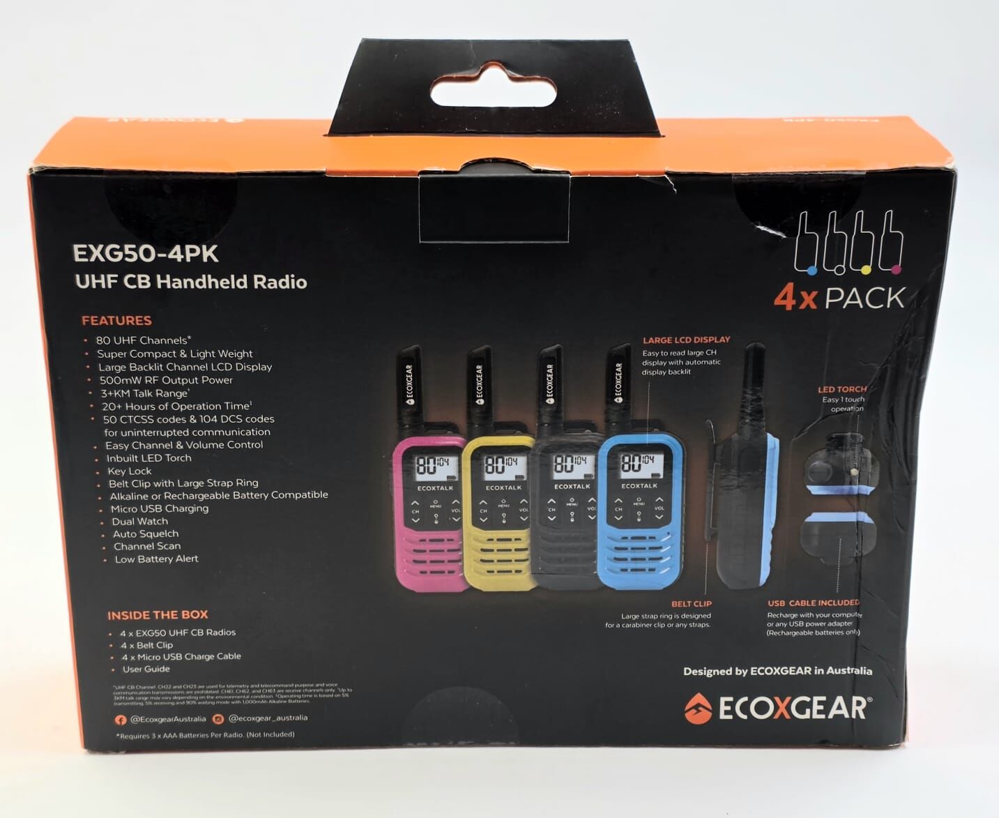 Stay connected wherever you go with the Ecoxgear EXG50 4-Pack UHF CB Handheld Radios. Designed for reliability and convenience, these compact and lightweight radios are ideal for outdoor activities, job sites, events, and emergency communication.