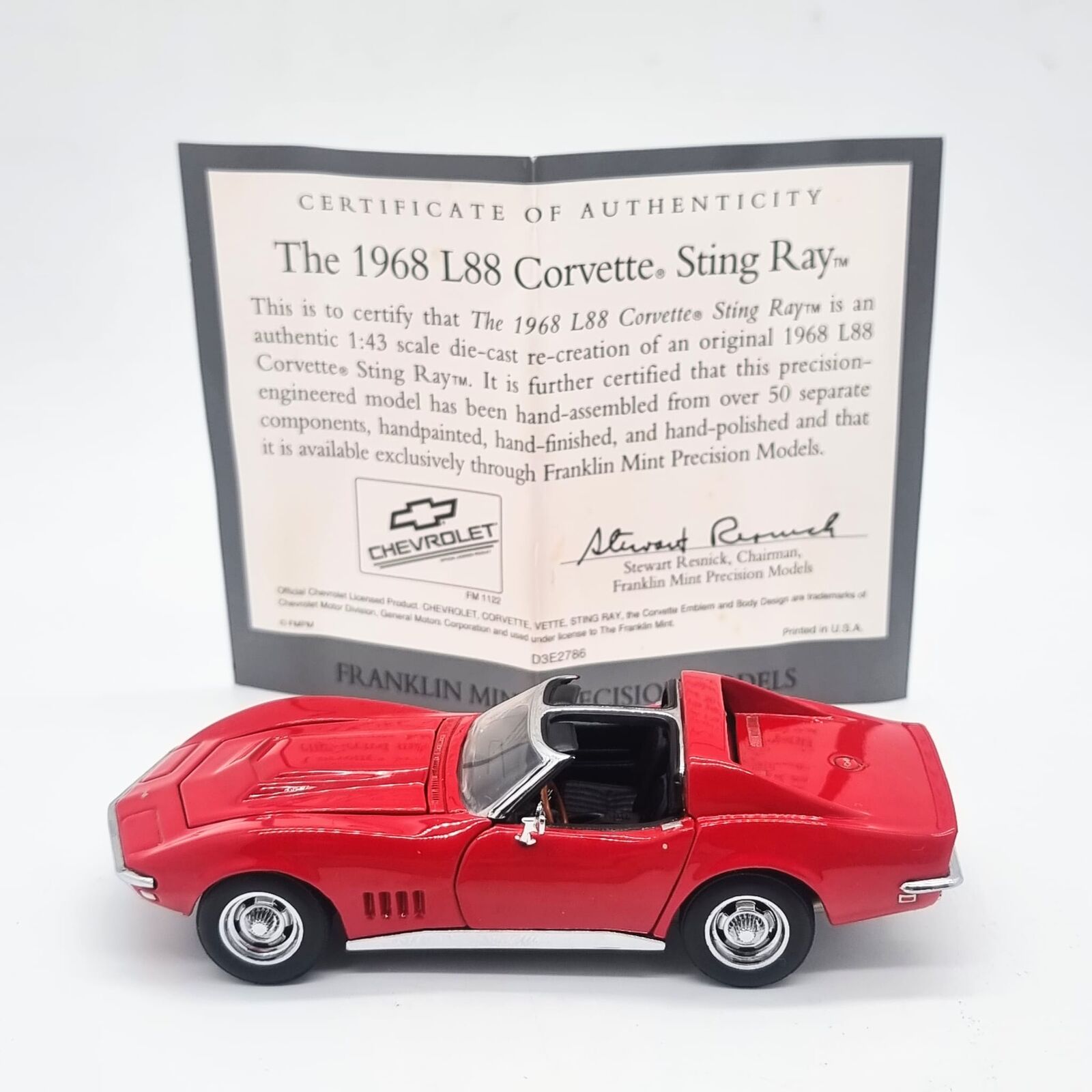 This Franklin Mint Precision Models 1968 L88 Corvette Sting Ray in 1:43 scale is a finely crafted collectible diecast model, finished in a striking red colour.