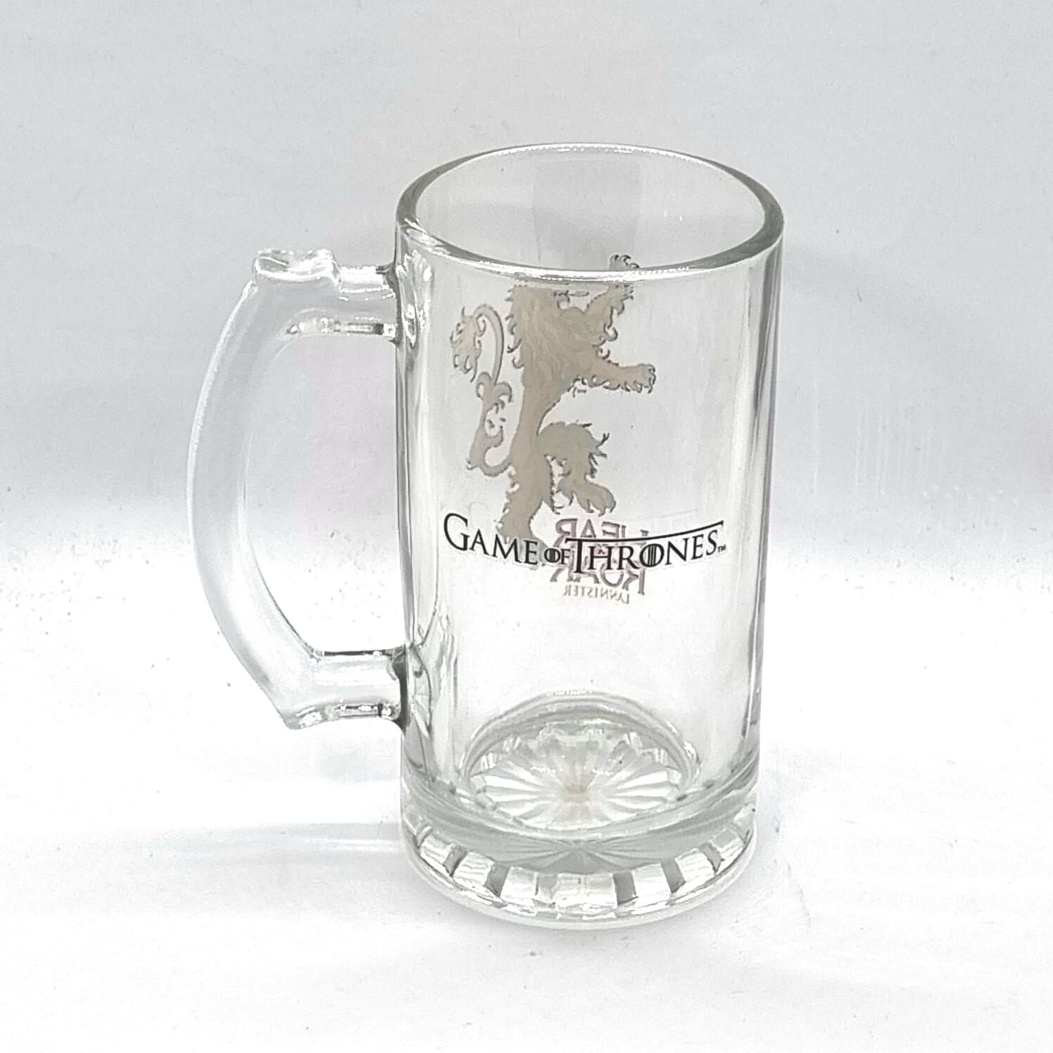 - Bold Lannister lion sigil artwork on clear glass