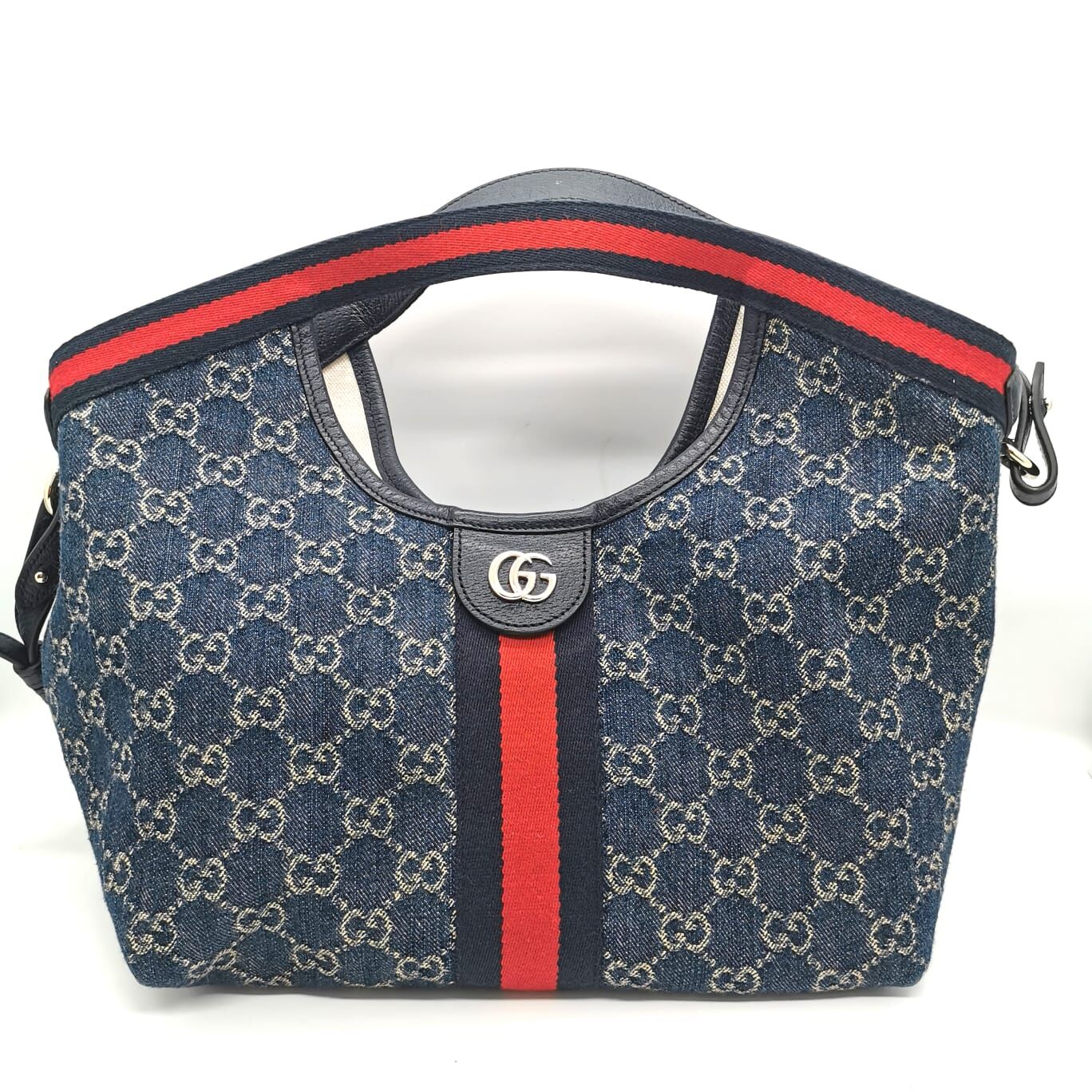 Elevate your everyday style with this authentic Gucci Giglio Tote in blue and white GG denim, paired with Tea leather trim for that signature luxury vibe. Finished with classic blue and red Web canvas details and light gold-toned hardware, this tote blends iconic Gucci elements with modern practicality.