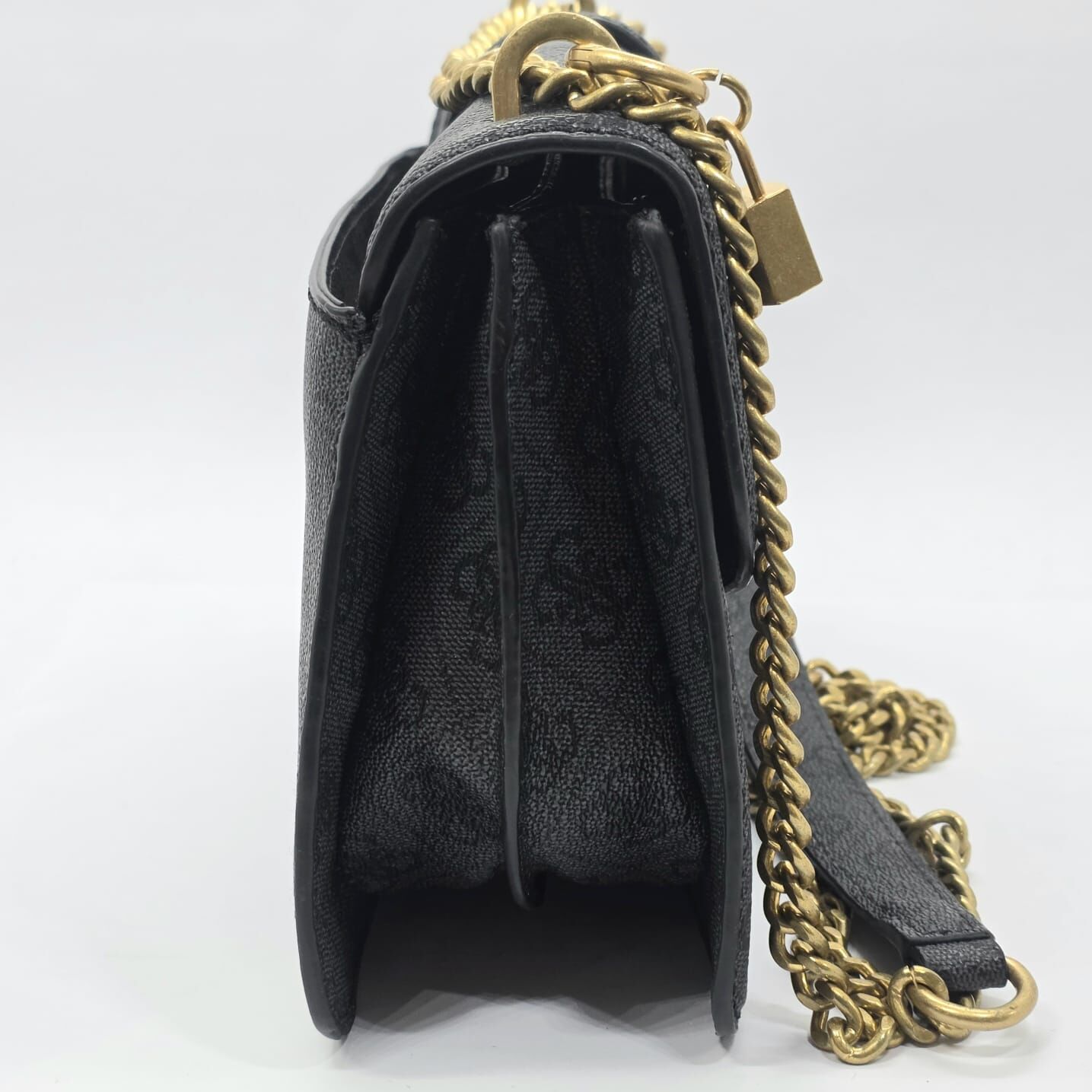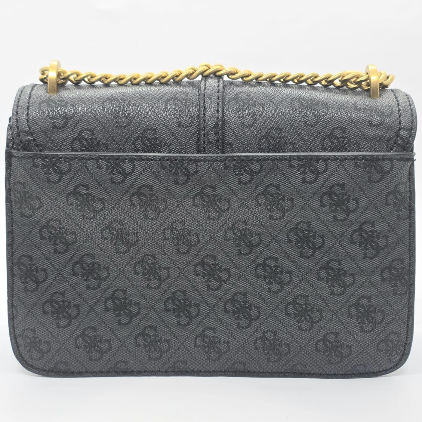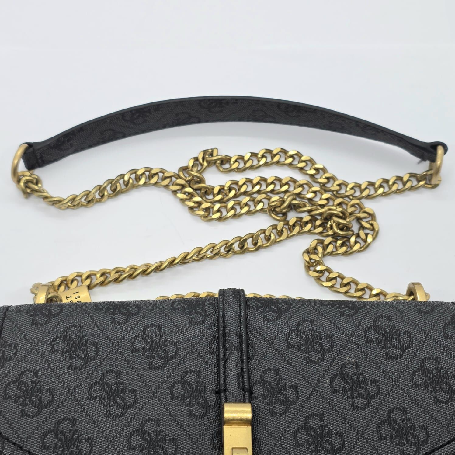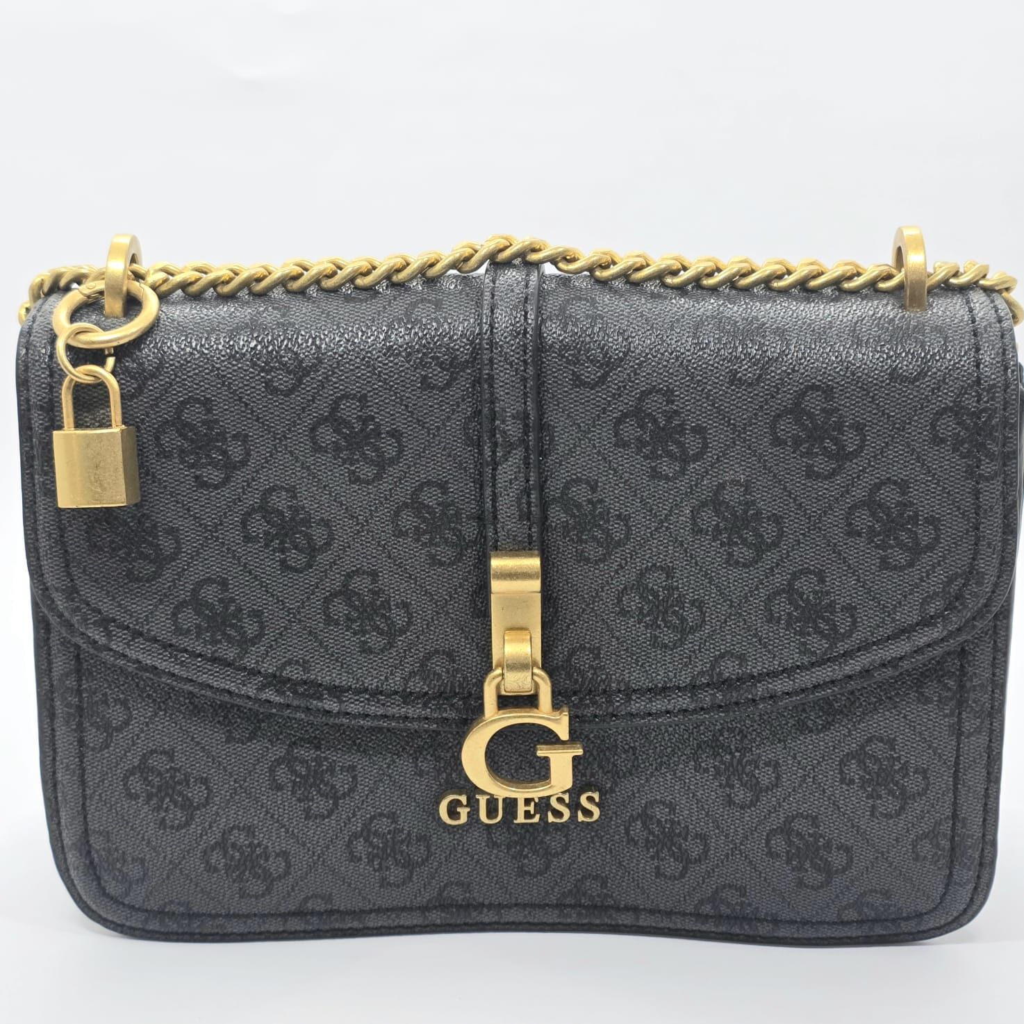 This GUESS convertible crossbody bag features an all-over debossed G-logo monogram design on a black synthetic exterior. The structured silhouette is complemented by polished gold-tone hardware, including a prominent front logo plaque and a decorative padlock charm. Designed for versatility, the sliding chain and faux-leather strap let the bag be worn as a long crossbody or doubled-up shoulder bag. The front flap secures with magnetic snap closures, opening to a dual-compartment interior lined with signature logo-print fabric. Internal storage includes one zippered pocket and one slip pocket for organisation.
