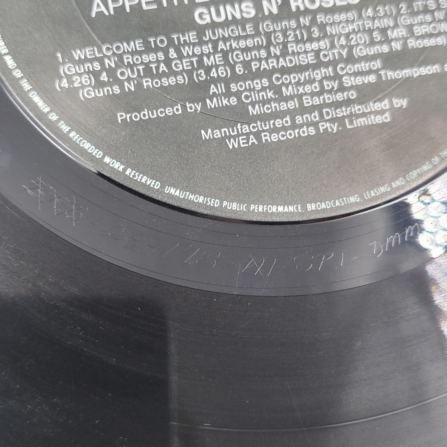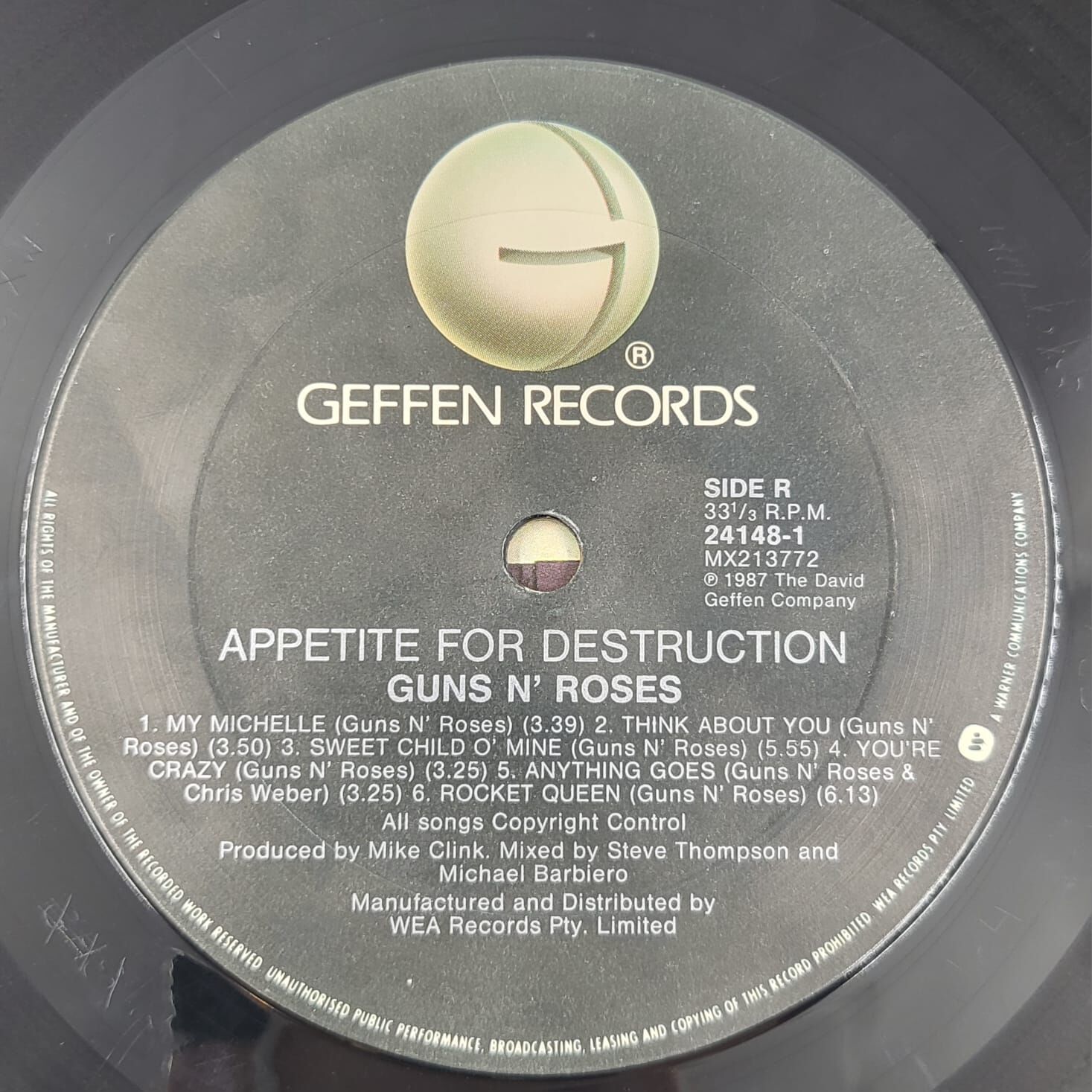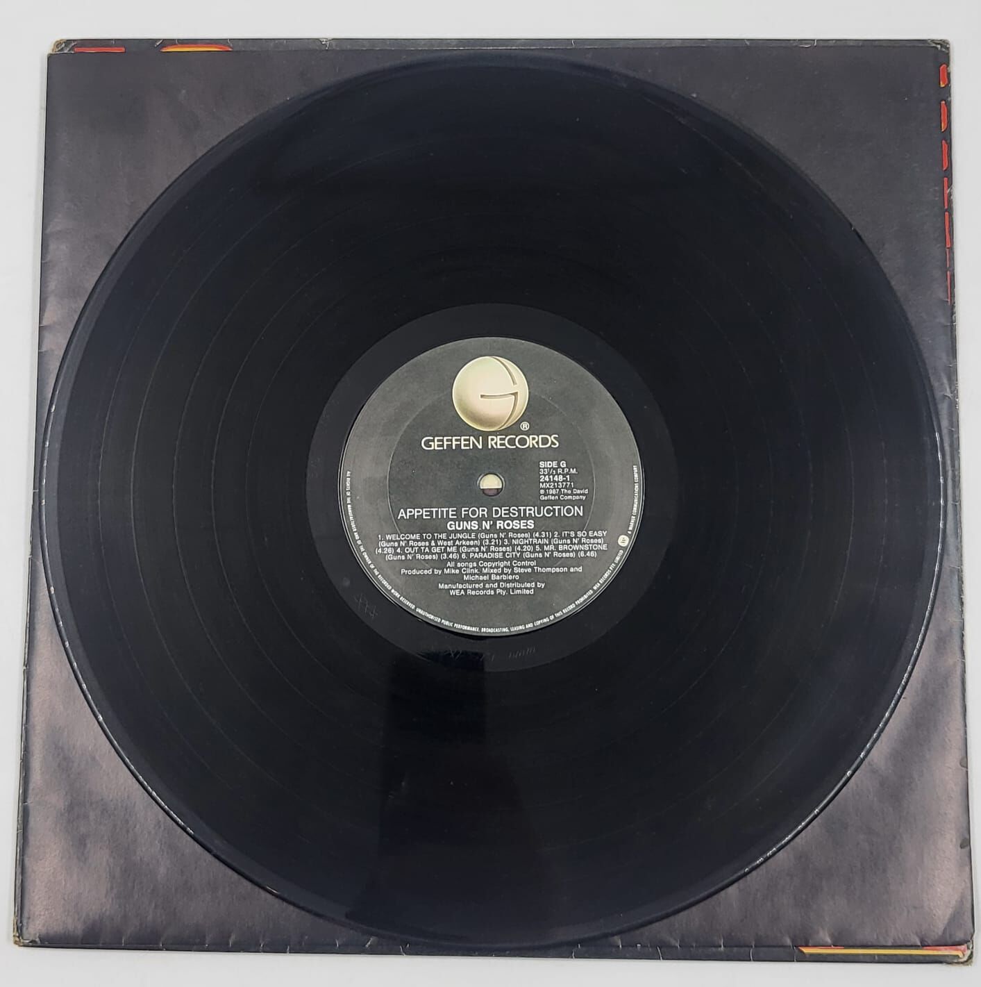 This is a 1987 Australian pressing of Guns N' Roses' legendary debut, Appetite for Destruction. This specific version was manufactured and distributed by WEA Records Pty. Limited (Catalog: 24148-1) and represents the 1980s release.