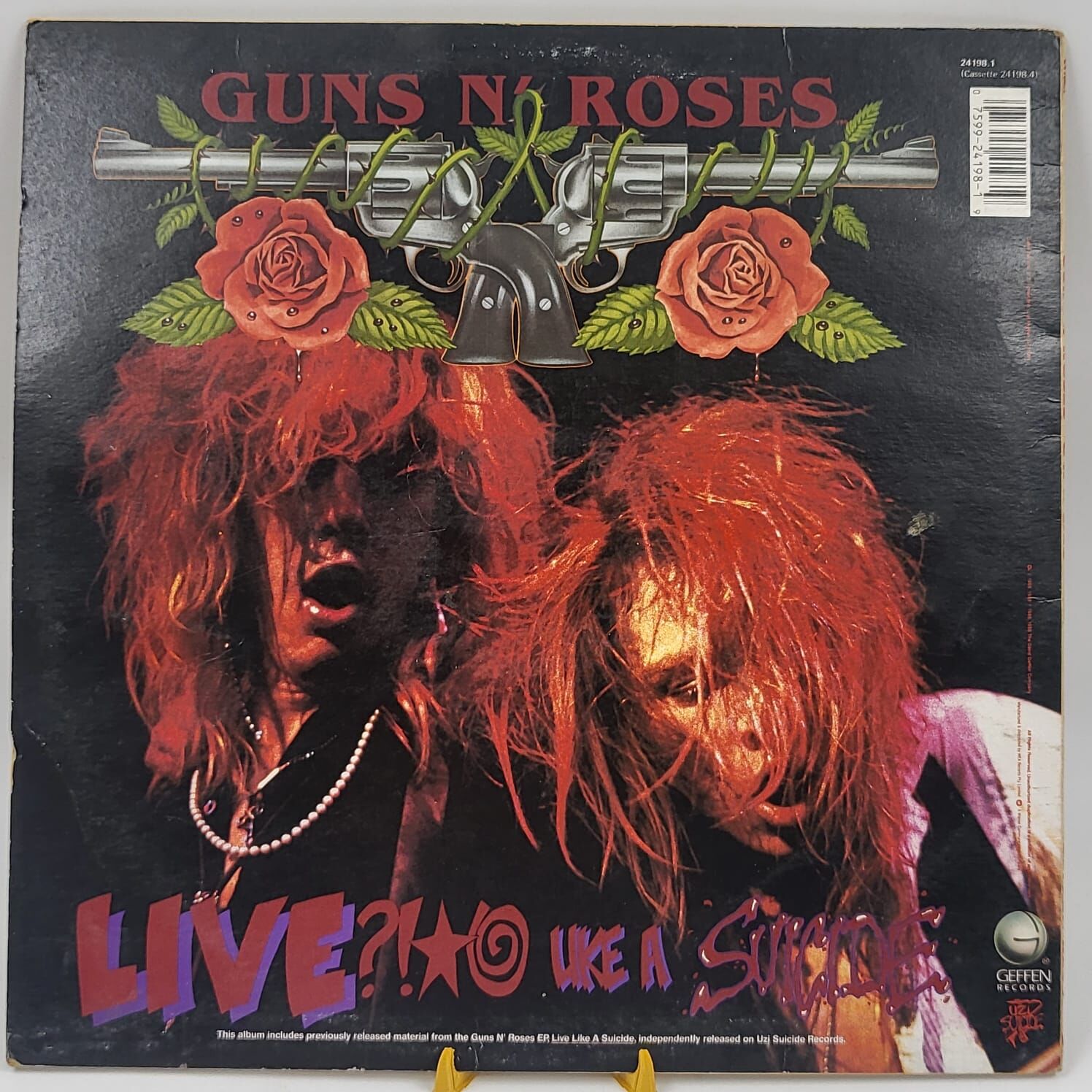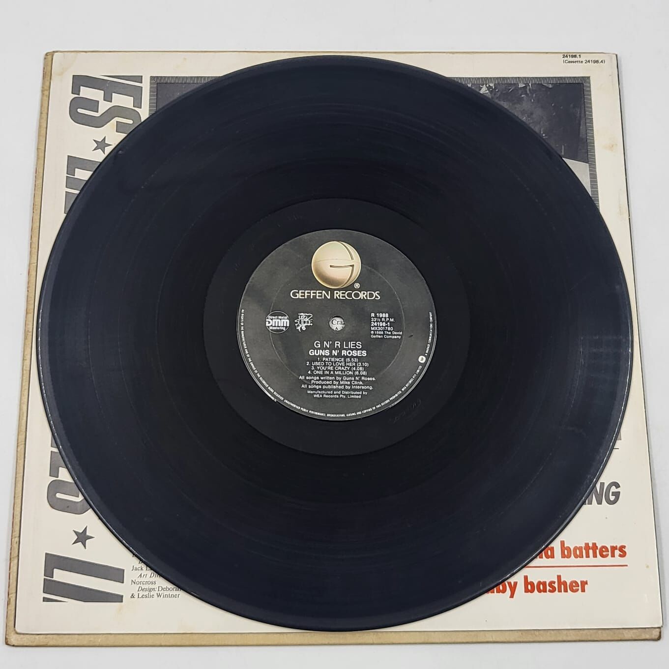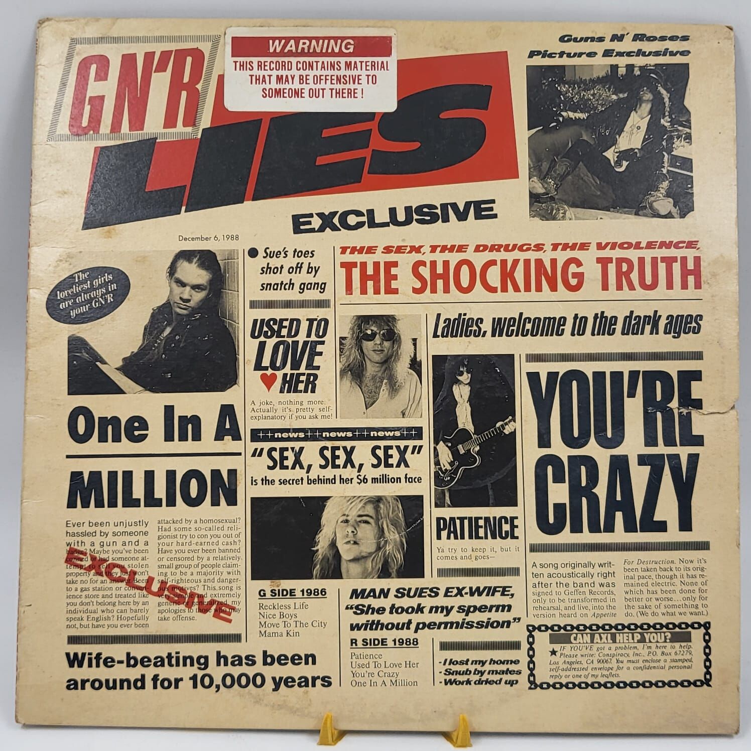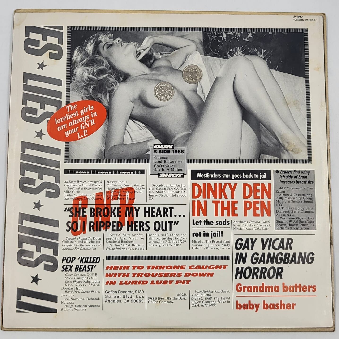 Pressed in Australia (Catalog #24198-1), this edition is a collector's gem. It includes the original tabloid-style headlines "Wife-beating has been around for 10,000 years" and "Ladies, welcome to the dark ages" that were removed from later releases. This is a must-have for vinyl enthusiasts, rock collectors, and Axl Rose fans alike. Own a piece of rock history with this hard-to-find, original Australian pressing of Lies.