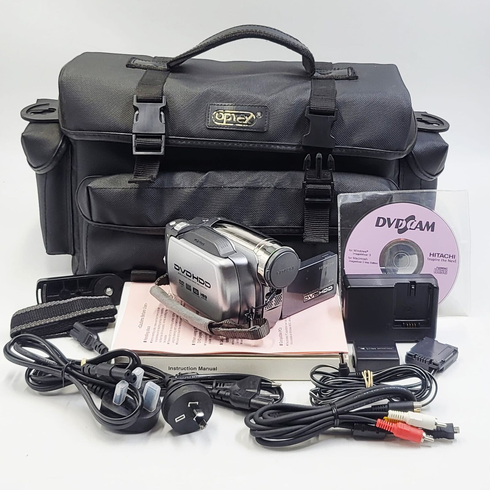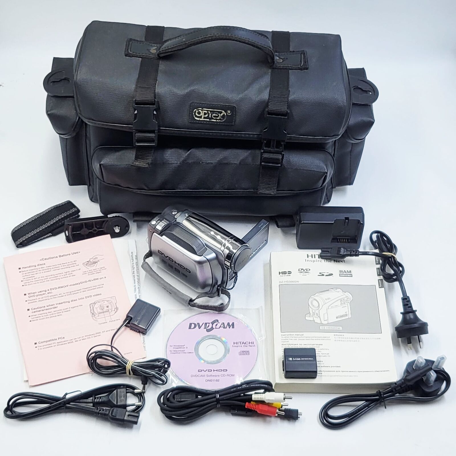 The Hitachi DZ-HS500SW is a hybrid digital camcorder that records video directly to both an internal hard disk drive and DVD discs. This dual recording system allows users to capture footage conveniently and archive recordings easily. The camcorder is designed for straightforward operation with a compact handheld form factor. Video can be stored on the internal HDD for longer recording sessions or written directly to DVD media for quick playback and sharing. The included accessories and carry bag make it easier to transport and use the camcorder for everyday recording.
