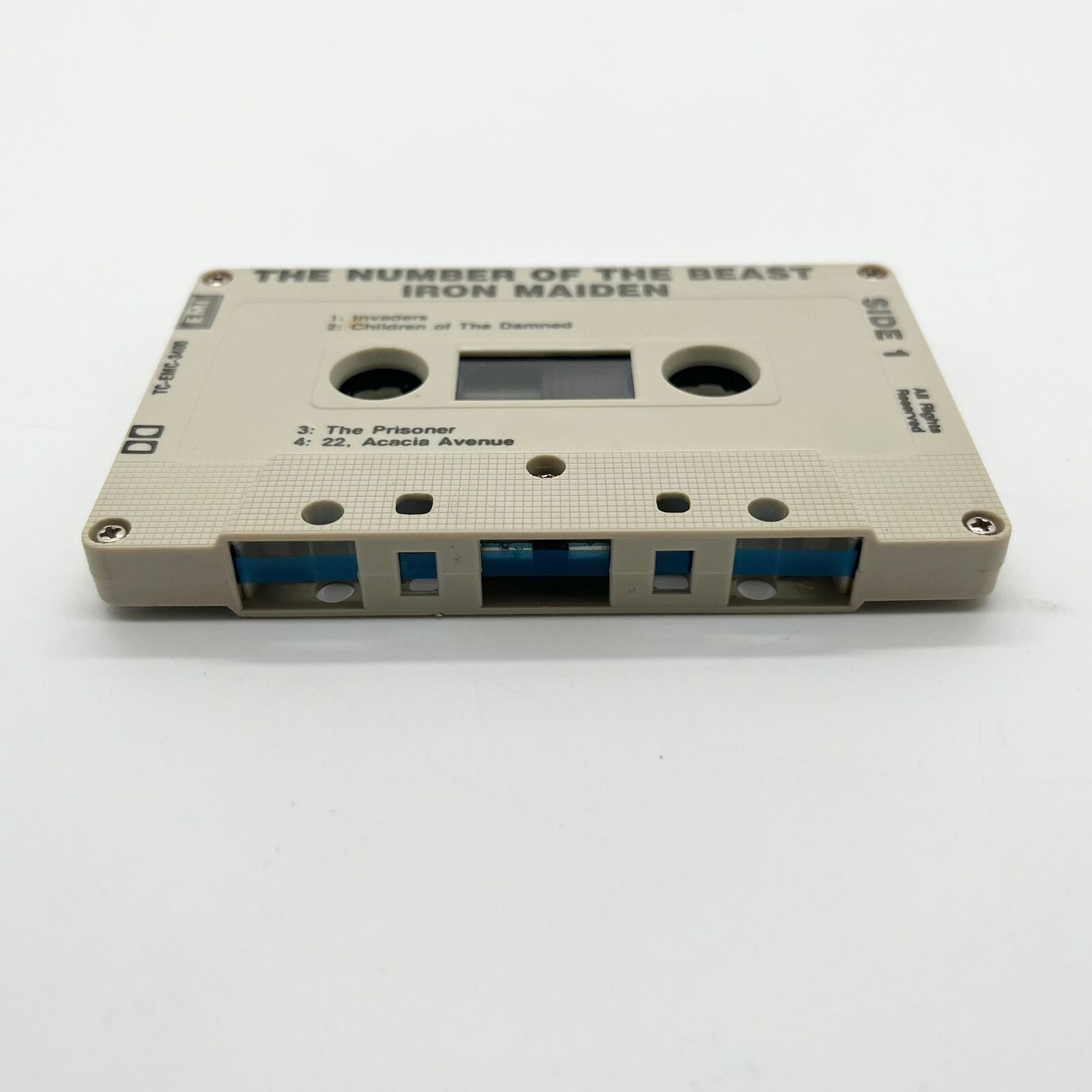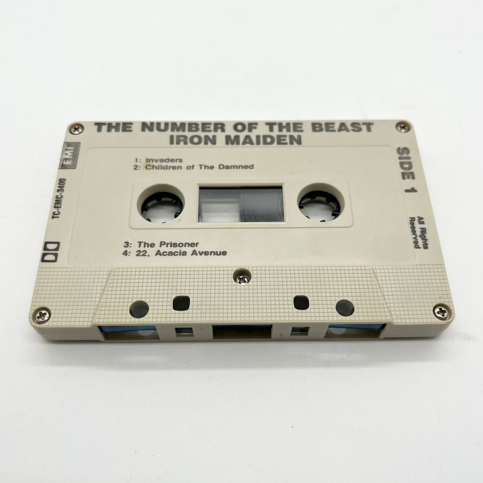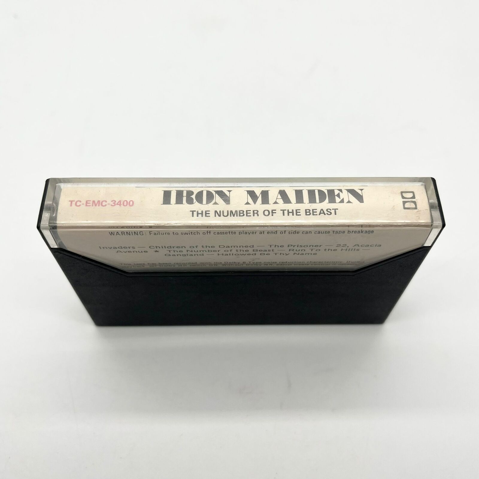 This vintage Iron Maiden cassette tape features the iconic album "The Number Of The Beast," pressed on EMI with catalog number TC-EMC-3400. The stereo cassette includes classic heavy metal tracks like "Run To The Hills" and "Hallowed Be Thy Name." It includes the original sleeve and tracklist. A collectible for Iron Maiden fans and cassette tape collectors.