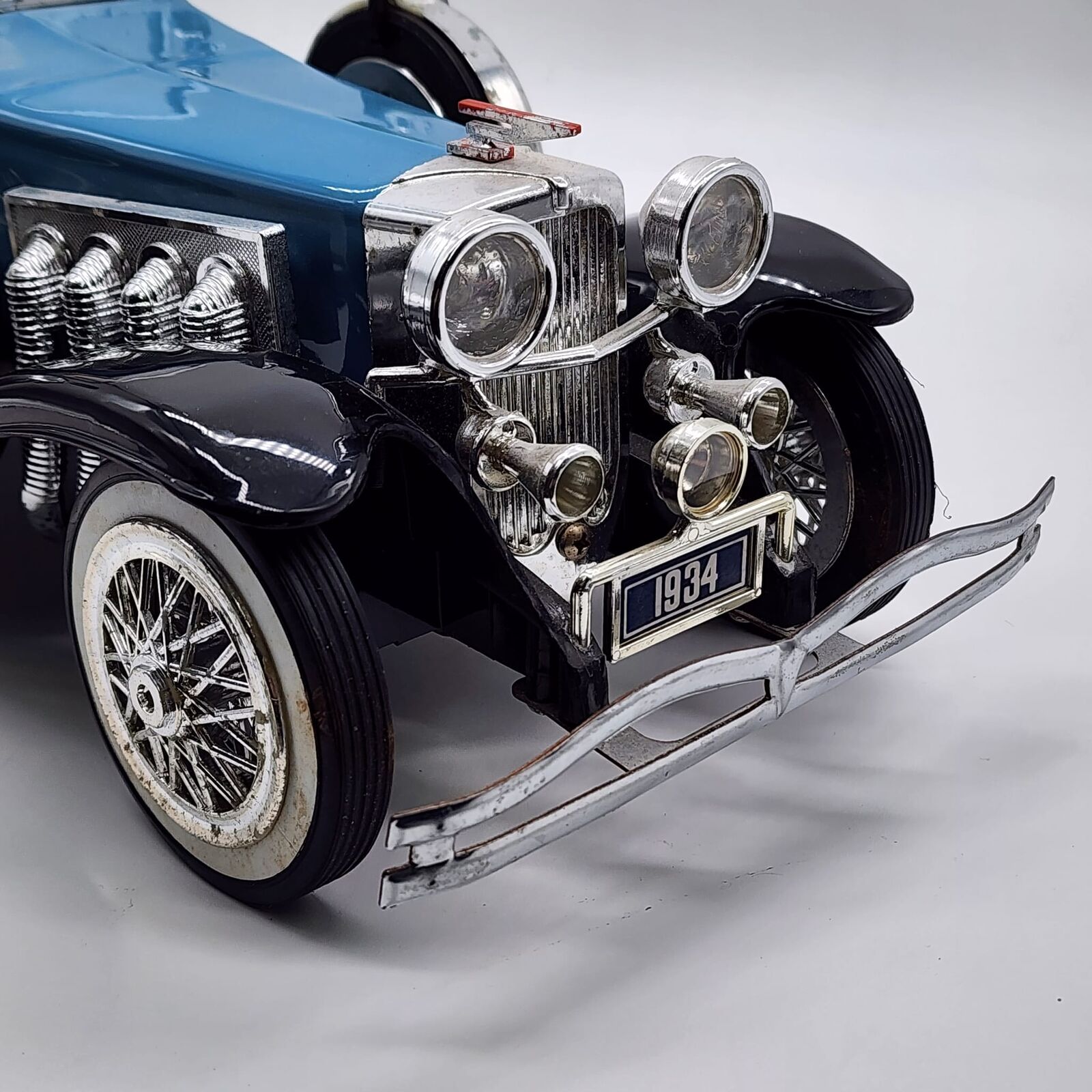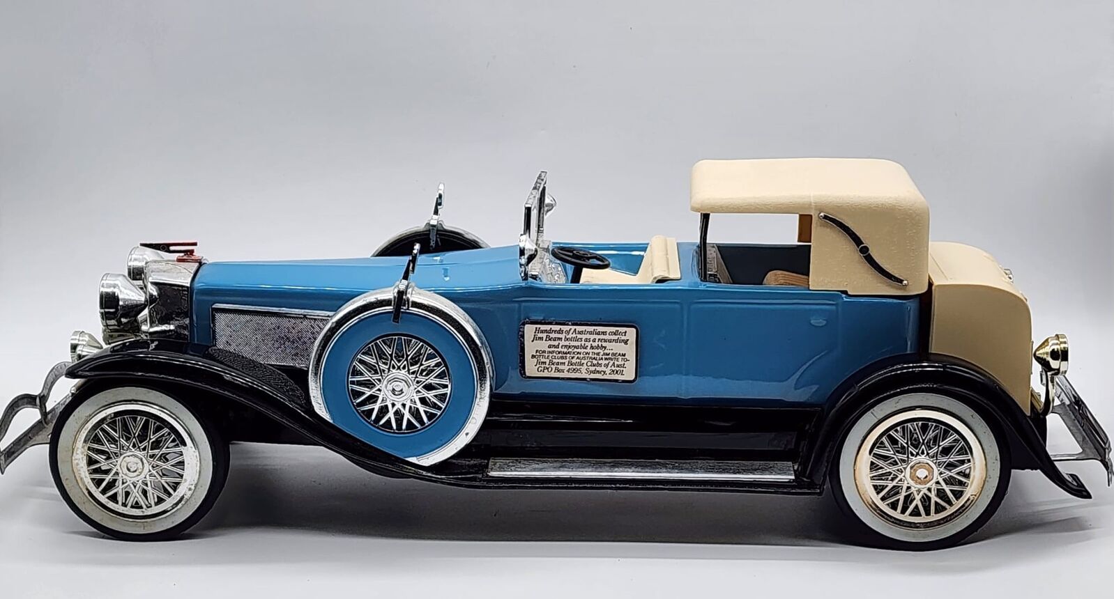 This collectible Jim Beam Duesenberg Model J car decanter is an authentic vintage piece produced during the 1980s, designed to commemorate the legendary 1934 Duesenberg Model J. Crafted with strong visual detail, this decanter features light blue body paint, black and chrome accents, whitewall tires, and silver spoke wheels, making it a standout display item for collectors of automotive memorabilia and Jim Beam decanters. Ideal for display in a bar, office, man cave, or collector's cabinet.