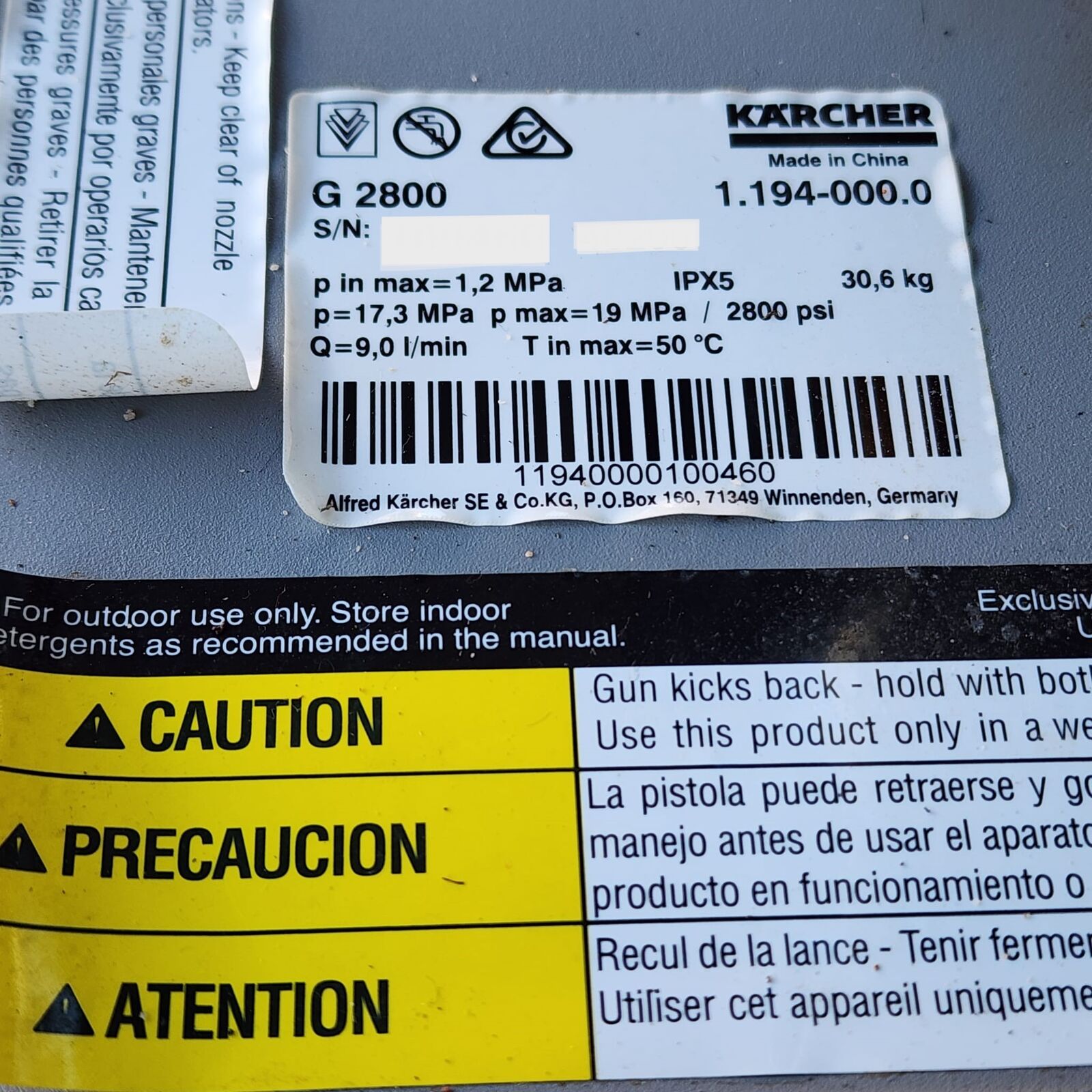 With a flow rate of 9.5 liters per minute, it ensures efficient cleaning of driveways, vehicles, patios, and outdoor surfaces. Built with durability and ease of use in mind, the G 2800 is ideal for users who require dependable performance and long-lasting operation.