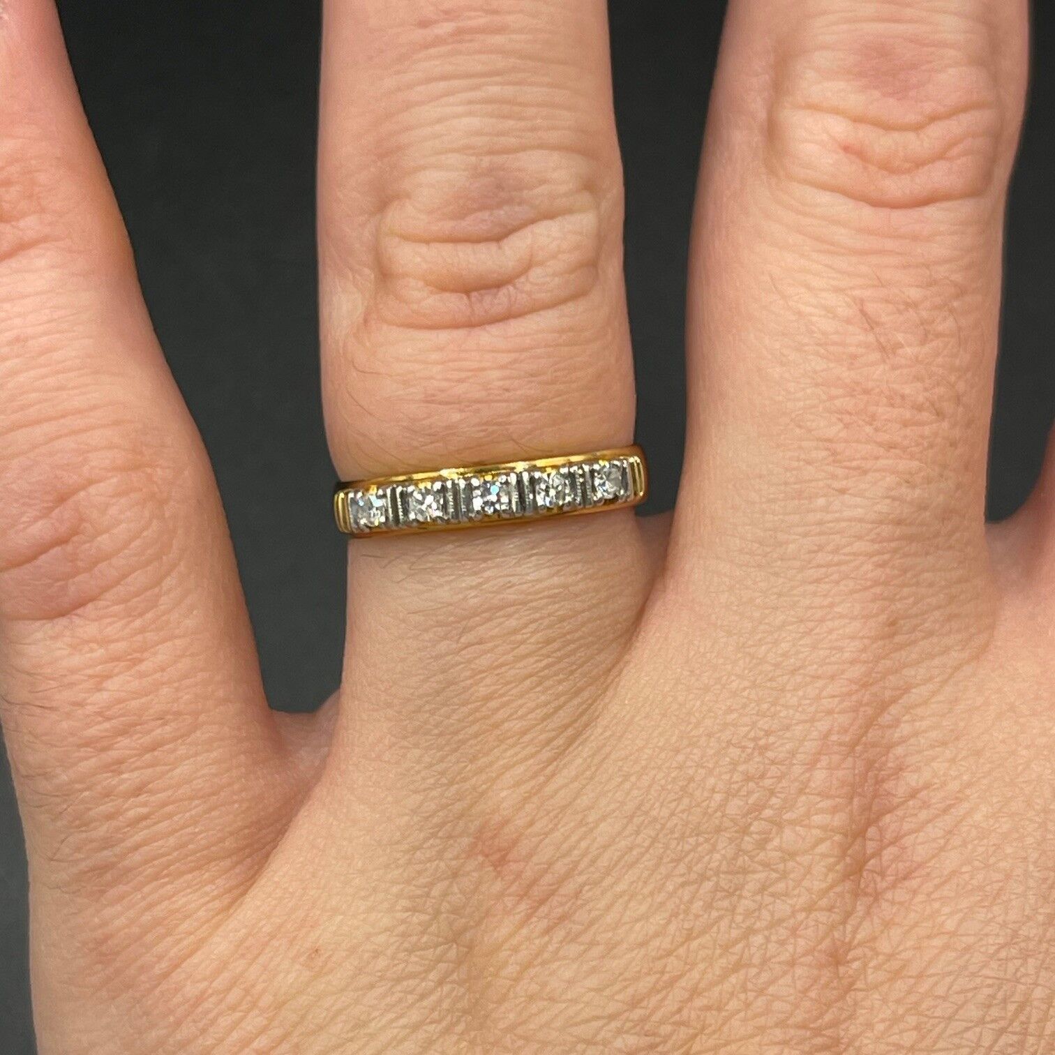 Turn heads with this stunning diamond band ring with 0.10 carat estimate total Diamond Weight of diamonds. Set in 18ct yellow gold, this ring features a cluster of diamonds set in white gold. This ring is sure to be admired by many.