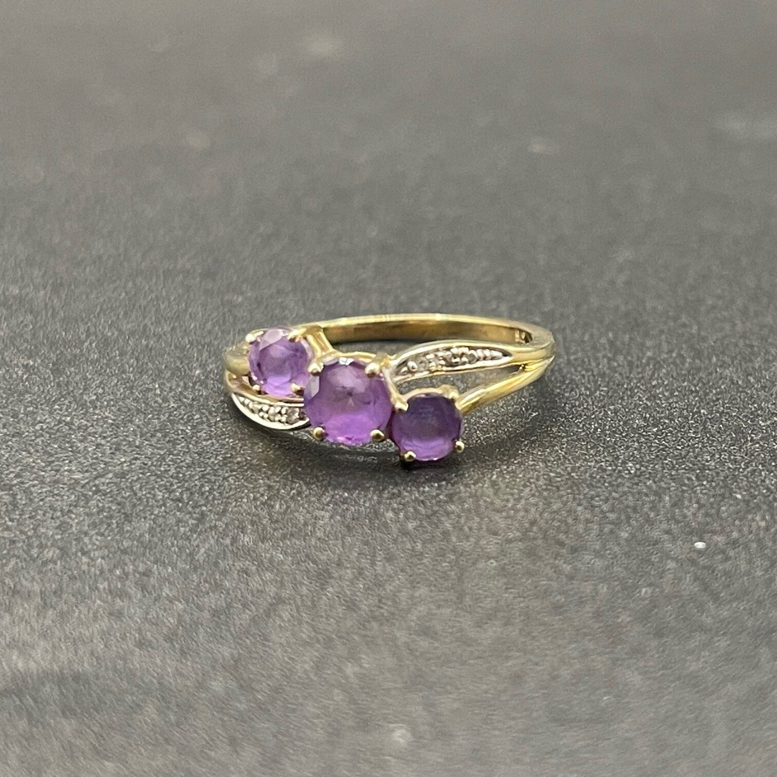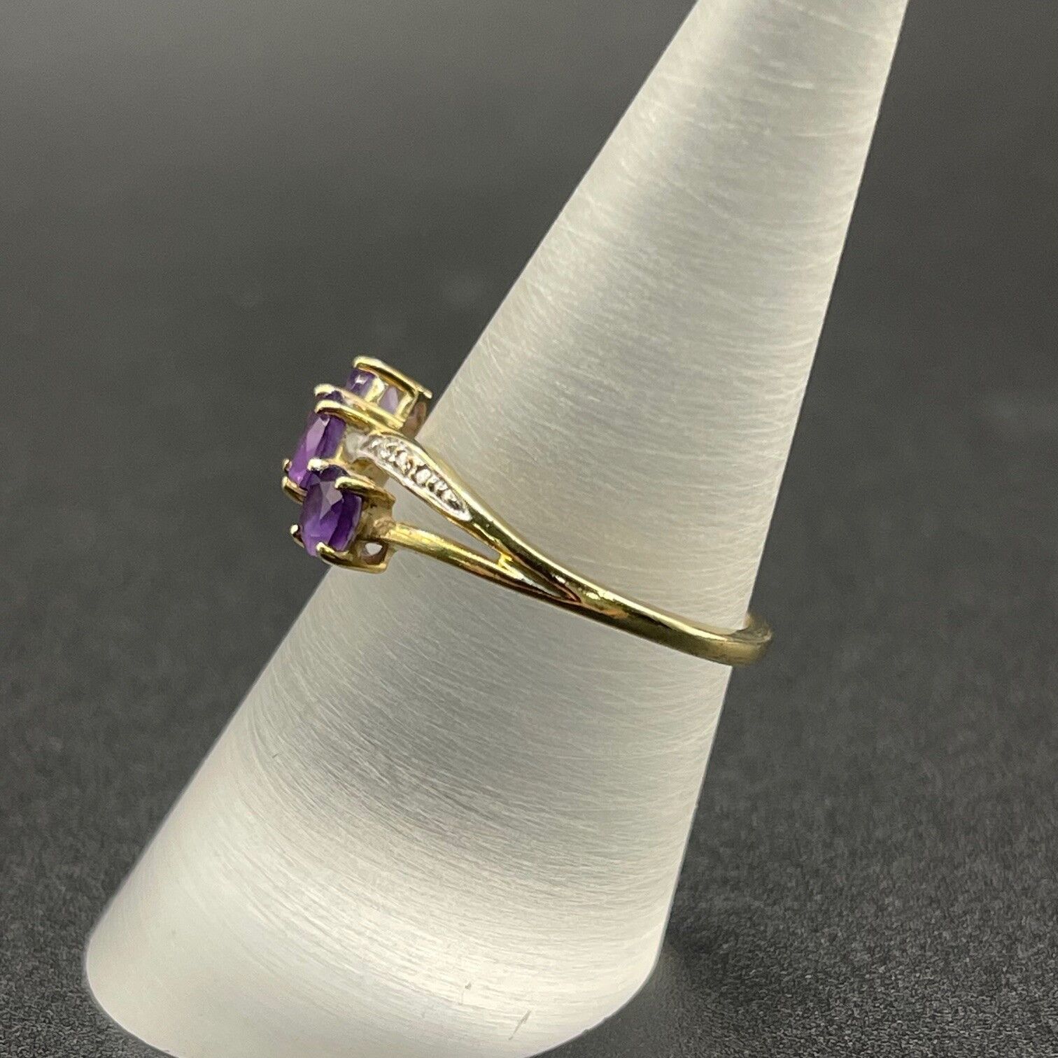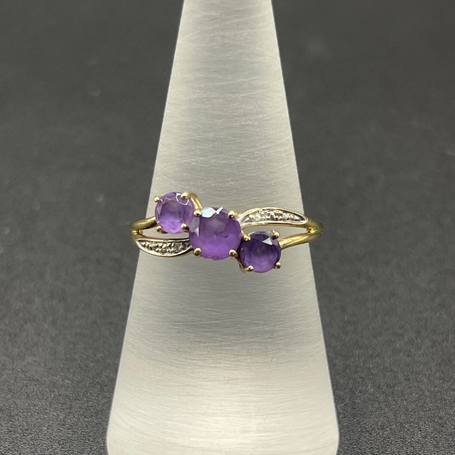 Simple and chic, this ring features purple gemstones with diamonds. Ring is crafted with 9ct yellow gold. Perfect for any occasion.