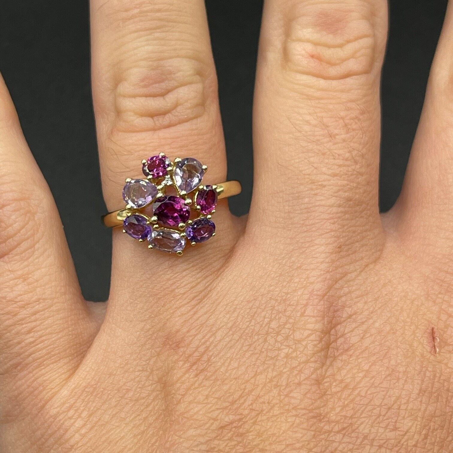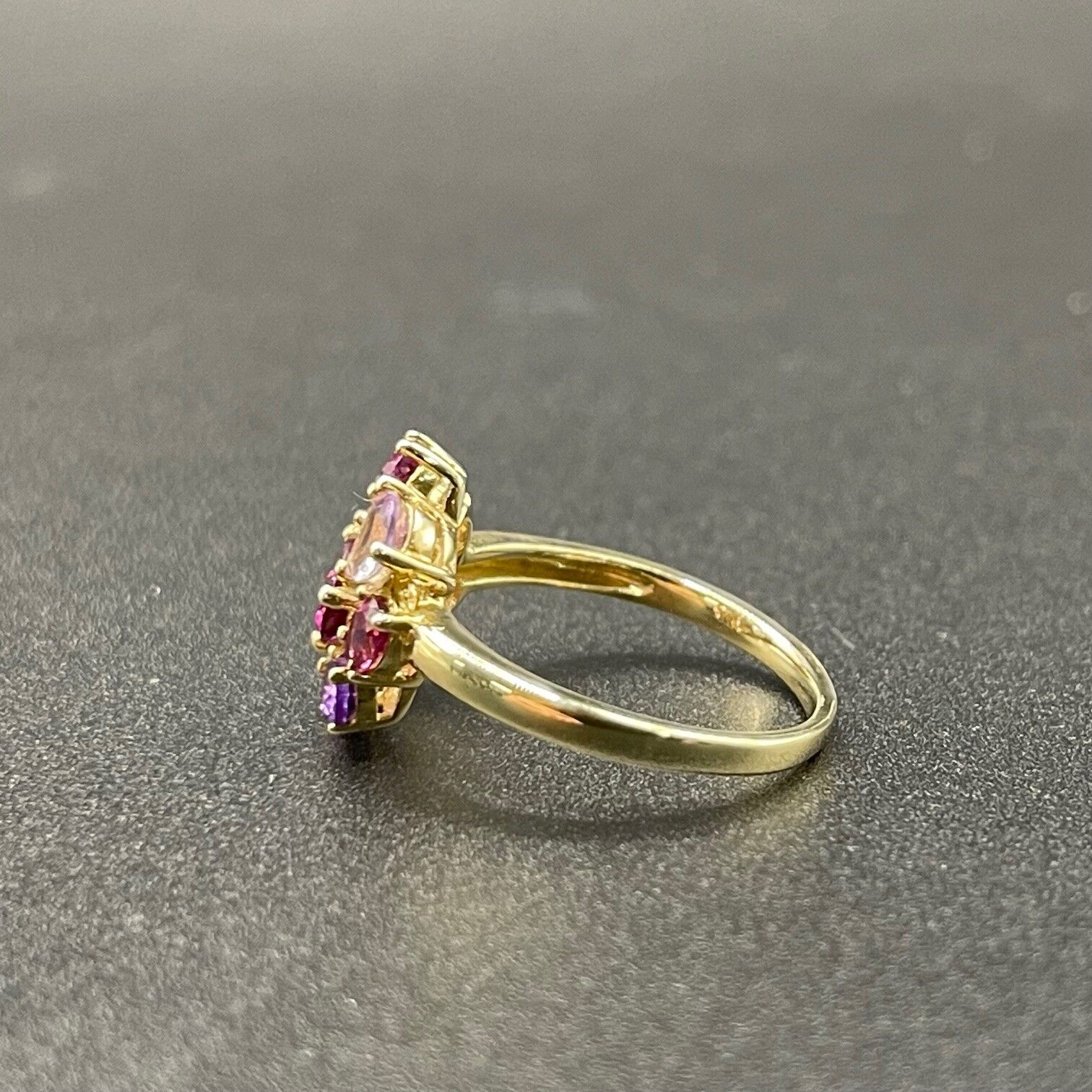 Simple and chic, this ring features a beautiful mix of different shades of purple gemstone. Ring is crafted with 9ct yellow gold. Perfect for any occasion.