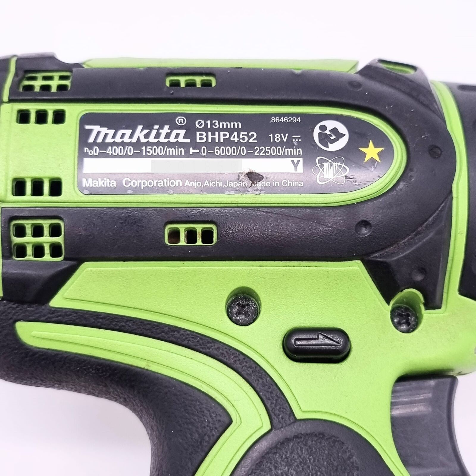 The Makita BHP452 is a professional 18V cordless hammer drill driver with a 13mm keyless chuck. It features dual speeds of 0-400 RPM (low) and 0-1500 RPM (high), plus hammer action at 0-6000 BPM (low) and 0-22500 BPM (high). This bare tool (skin only) is suitable for drilling in steel (13mm), wood (38mm), and masonry (13mm), with a compact 225mm length.