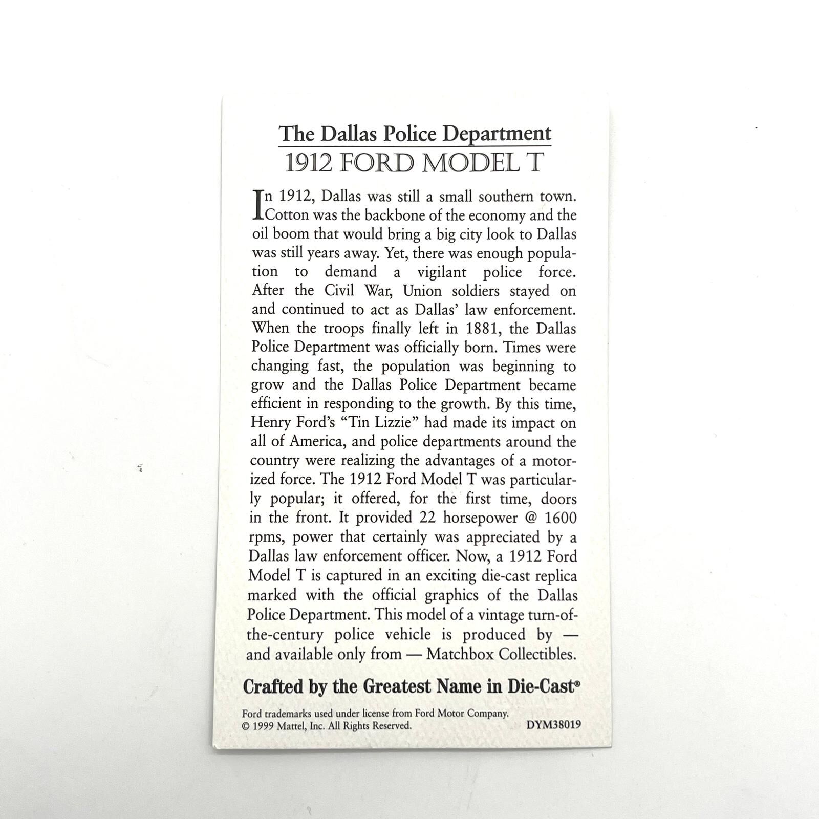 - Depicts 1912 Ford Model T - Dallas Police Department