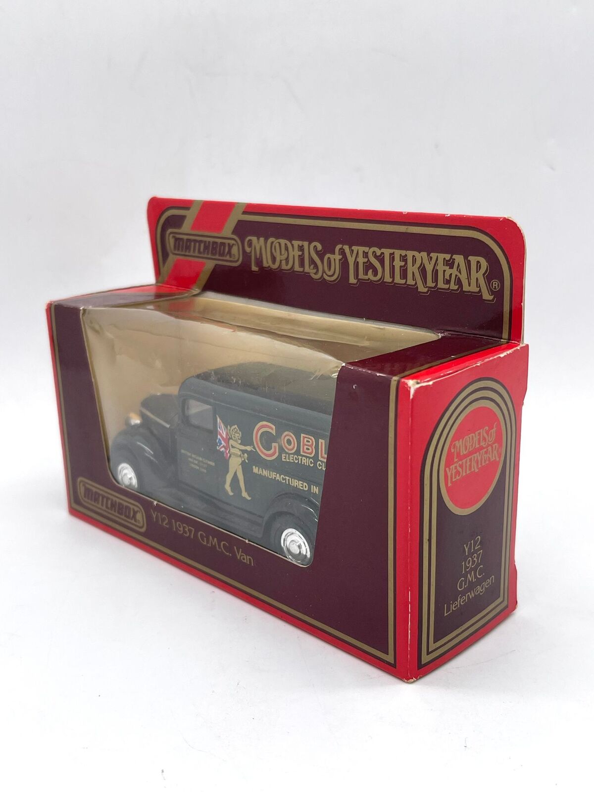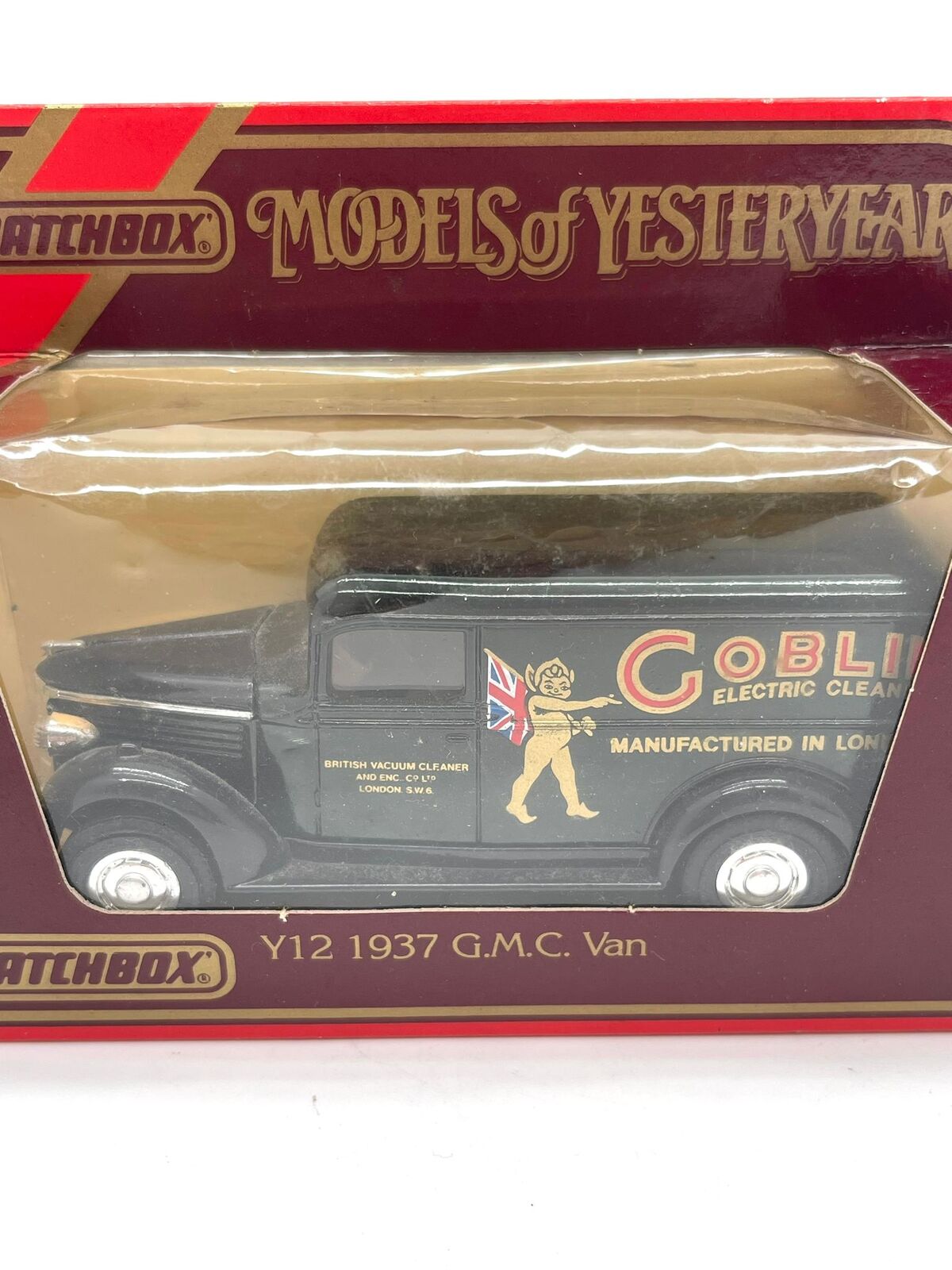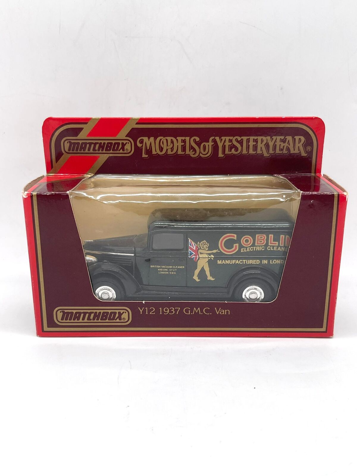 This is a vintage Matchbox Models of Yesteryear Y12 1937 G.M.C. Van featuring Goblin Electric Cleaners branding. Part of the highly collectible Models of Yesteryear series, this diecast vehicle is a faithful replica of the classic 1937 G.M.C. van.