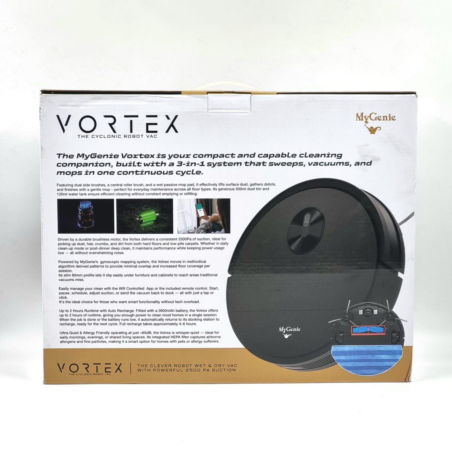 Make floor cleaning one less thing to stress about. The MyGenie Vortex Robovac Wet and Dry Robot Vacuum Cleaner delivers a full 3 in 1 clean sweeping vacuuming and mopping in one smooth cycle. It is built for homes that do not have time for high maintenance gear offering strong 2500Pa suction gyroscopic mapping and a sleek low profile body that slips under beds and cabinets without drama.