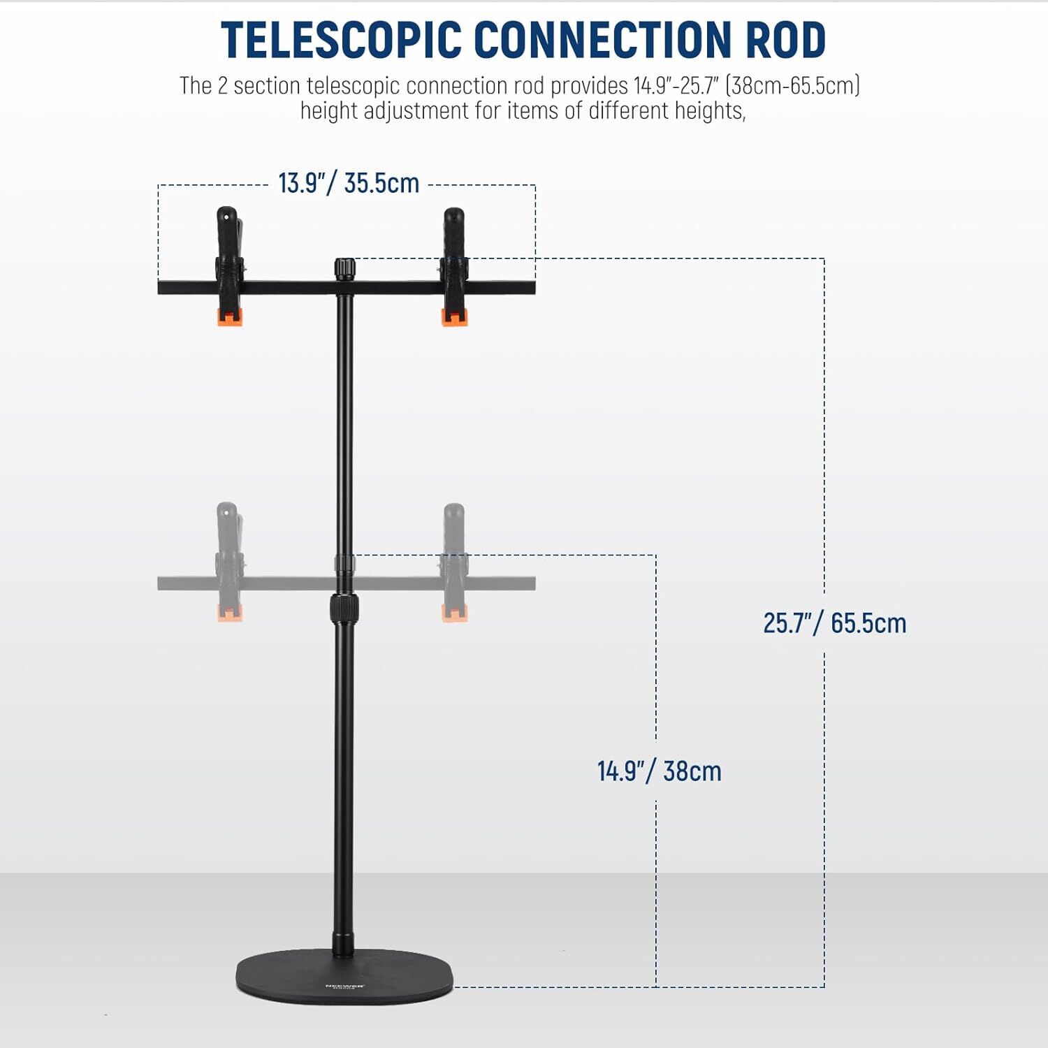 This stand's 2-section telescopic rod adjusts height from 14" to 25" to suit various shooting angles. The included phone holder fits major models from iPhone 12 to iPhone 15 Pro Max, Samsung Galaxy S22 to S23 Ultra, Huawei P60 Pro, Google Pixel 7 Pro, and more. Crafted from durable aluminum alloy and iron, the stand offers a maximum load capacity of 2.2 lbs (1 kg), making it ideal for product photography, food shoots, artist displays, and live streaming.