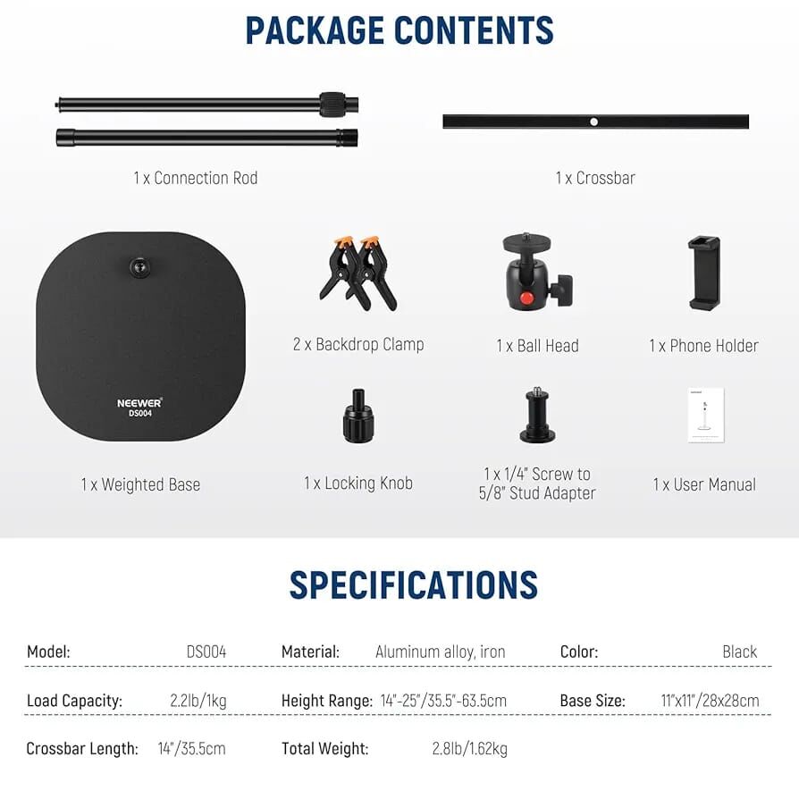 The Neewer Reflector Desktop Stand DS004 is a heavy-duty and versatile solution for photography and streaming setups. Featuring a large weighted base (11"x11") for unmatched stability without damaging your surfaces, it supports a wide variety of devices. The detachable 14" crossbar comes with backdrop clamps to hold seamless paper, canvas, green screens, and other backgrounds. Remove the crossbar to attach cameras, projectors, smartphones, or webcams to the 360° rotatable ball head mount.
