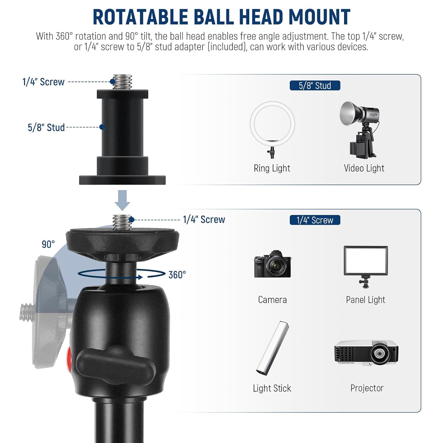 - Compatible 1/4" screw and 5/8" stud adapter for cameras, projectors, phones