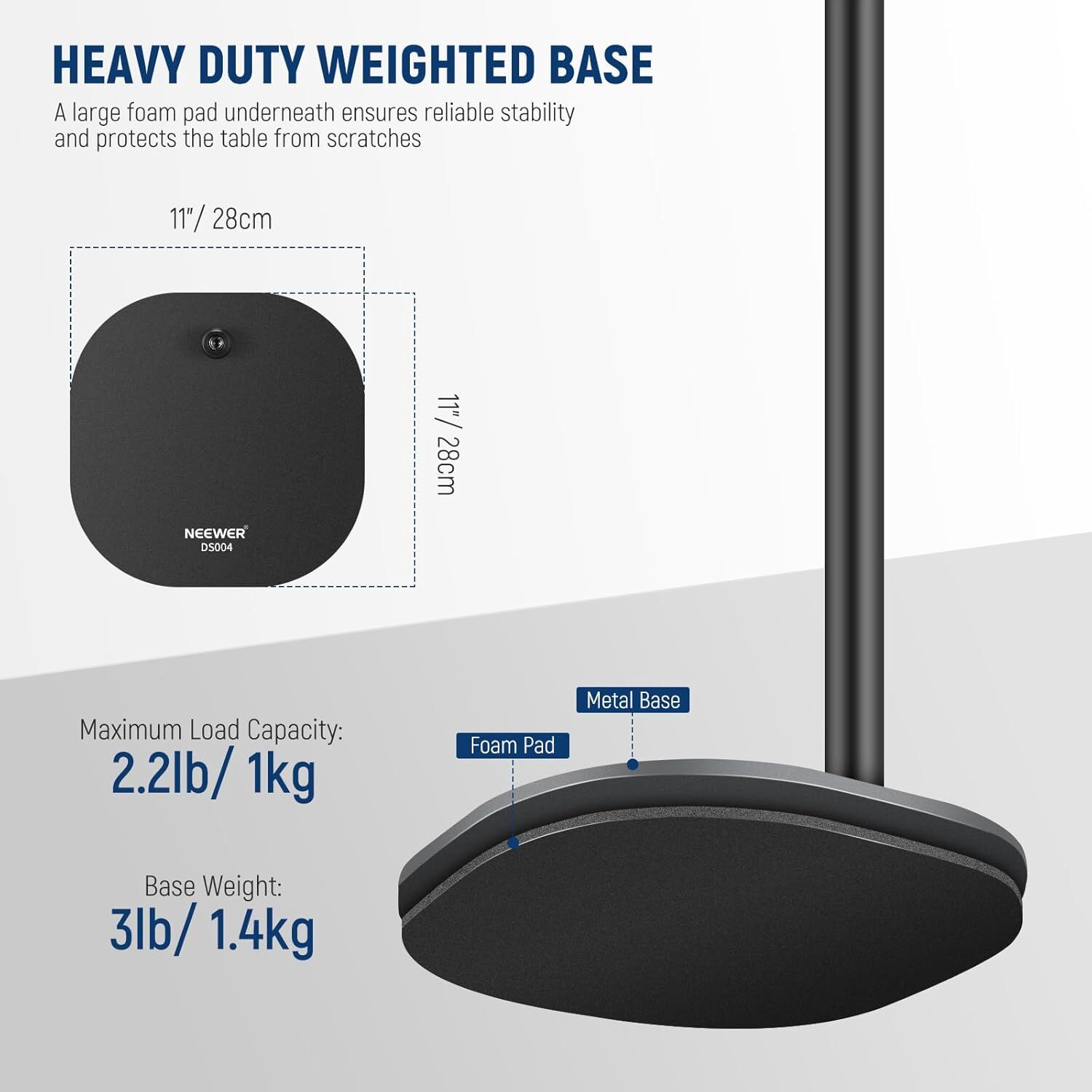 - Heavy-duty weighted base (11"x11" with foam pad) ensures stability and table protection