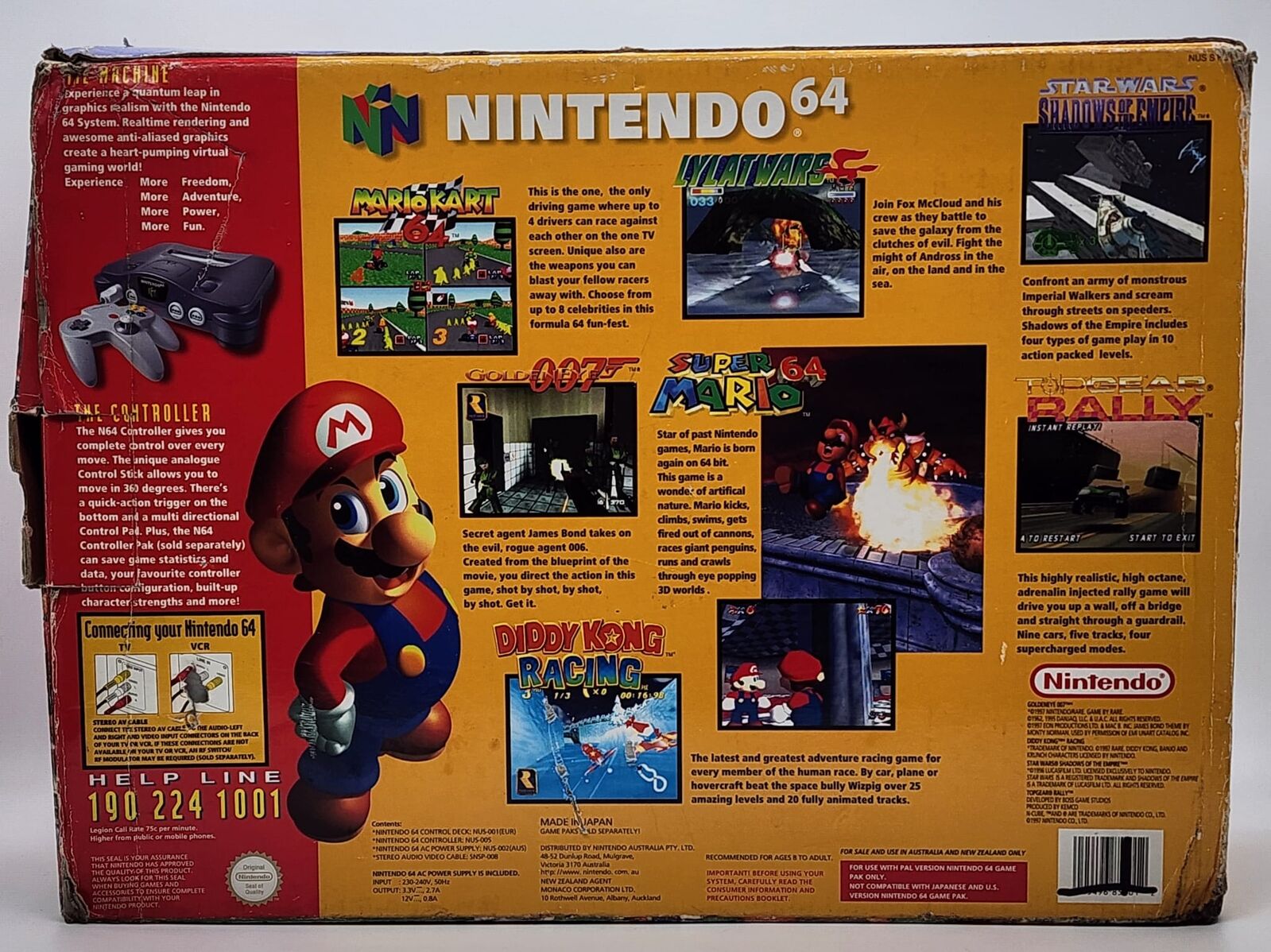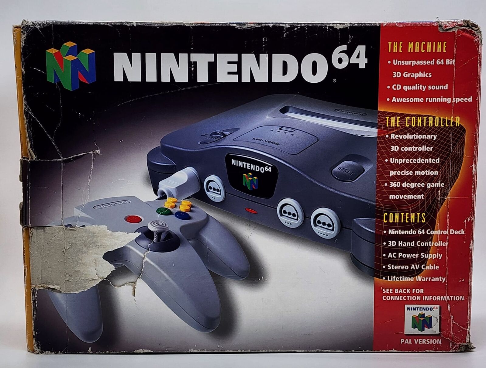 Experience classic gaming with this authentic Nintendo 64 Charcoal Grey Console AUS PAL Version NUS-001(EUR). Includes controller and leads for immediate play. This console delivers the nostalgic 64-bit gaming experience with vibrant graphics and smooth gameplay, ideal for collectors and retro gaming enthusiasts.