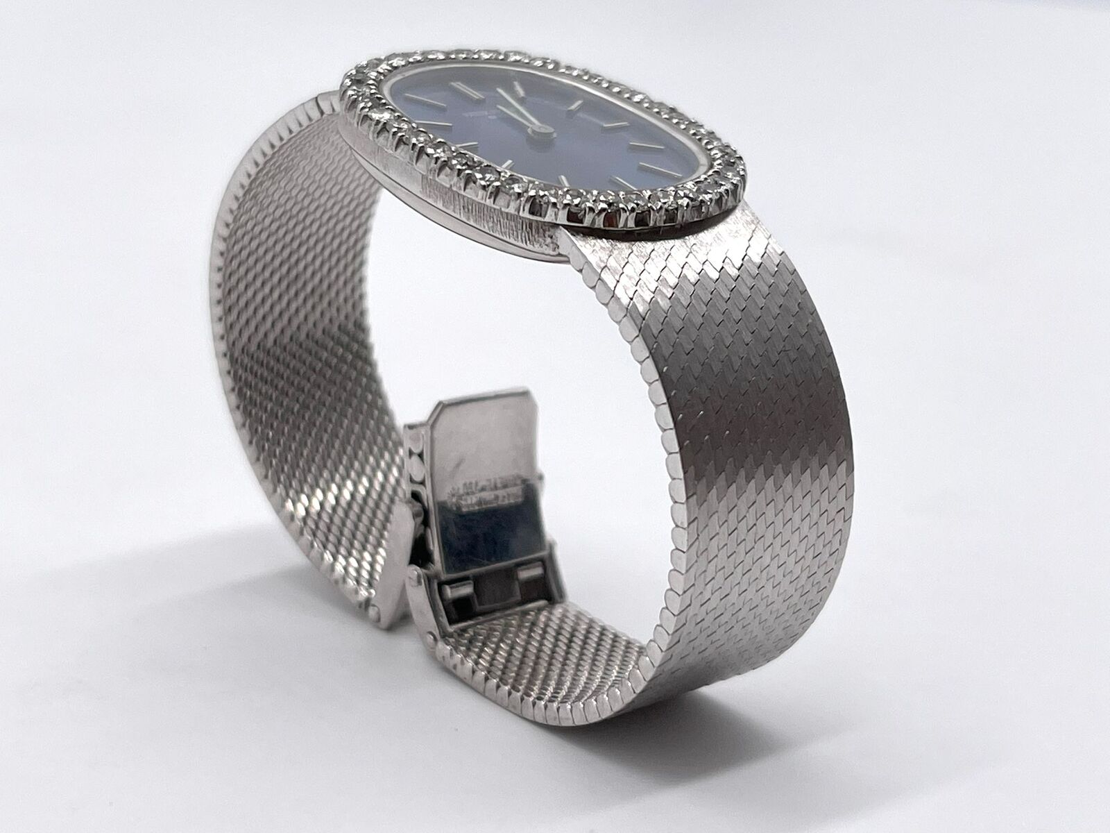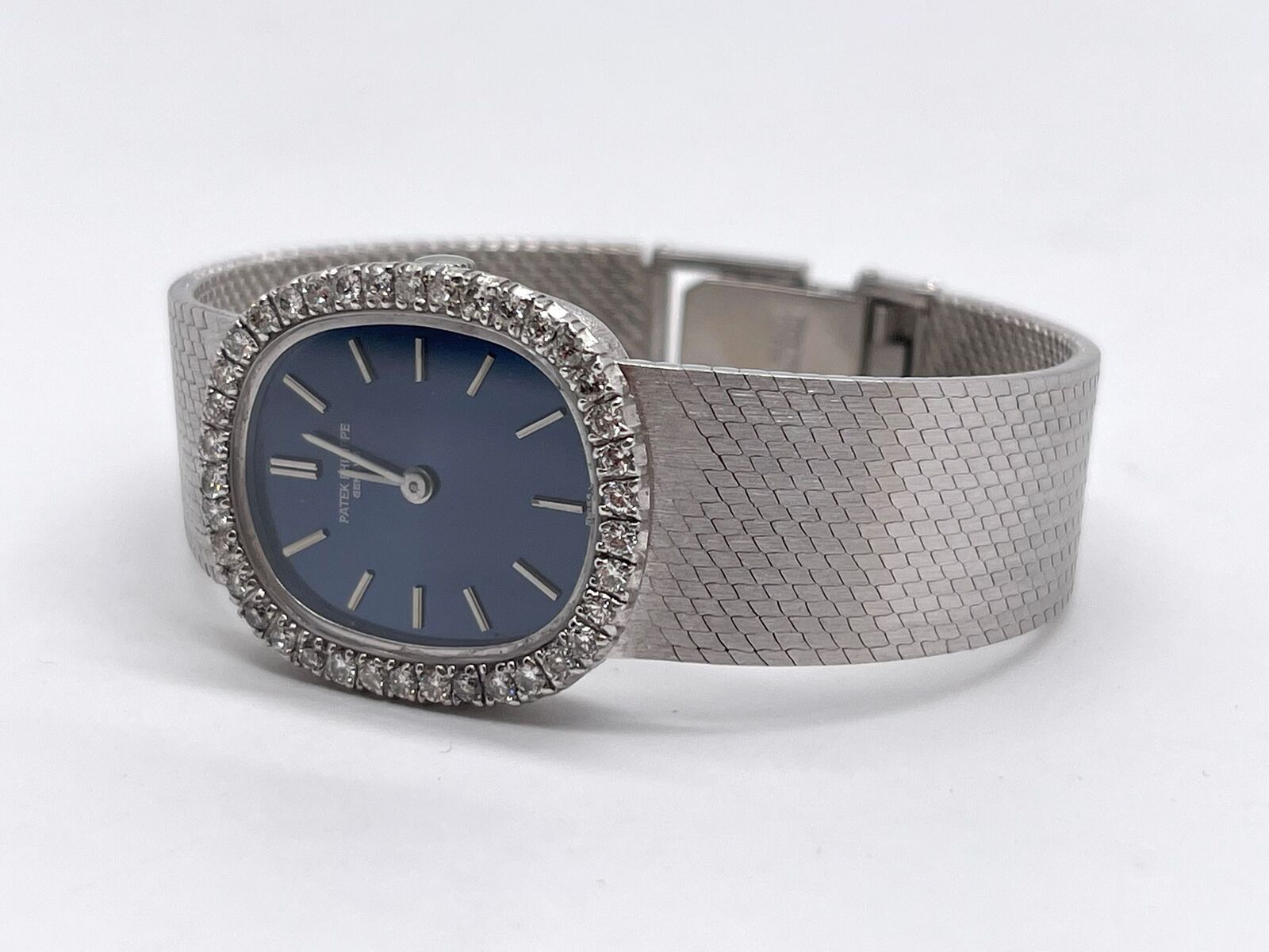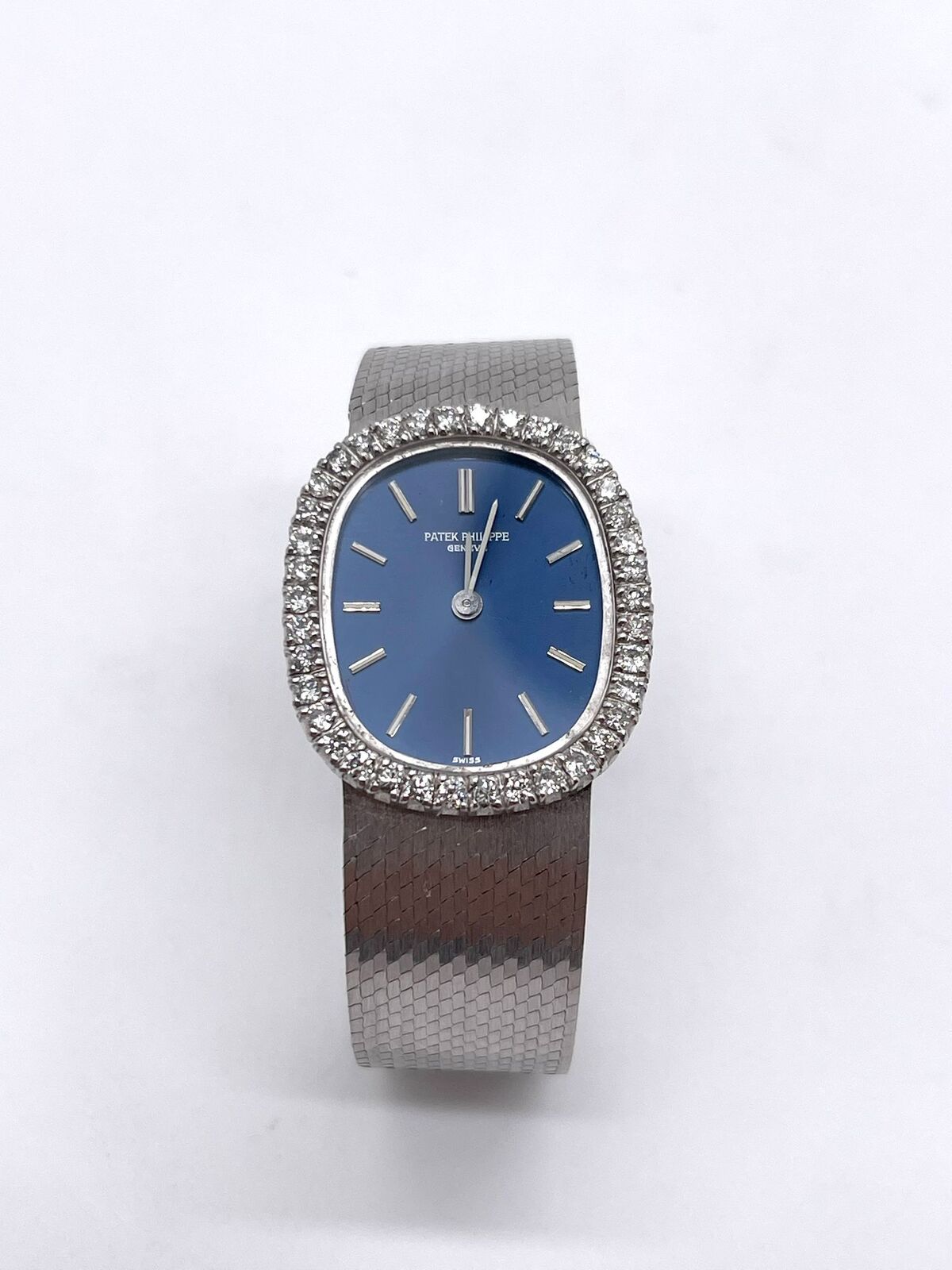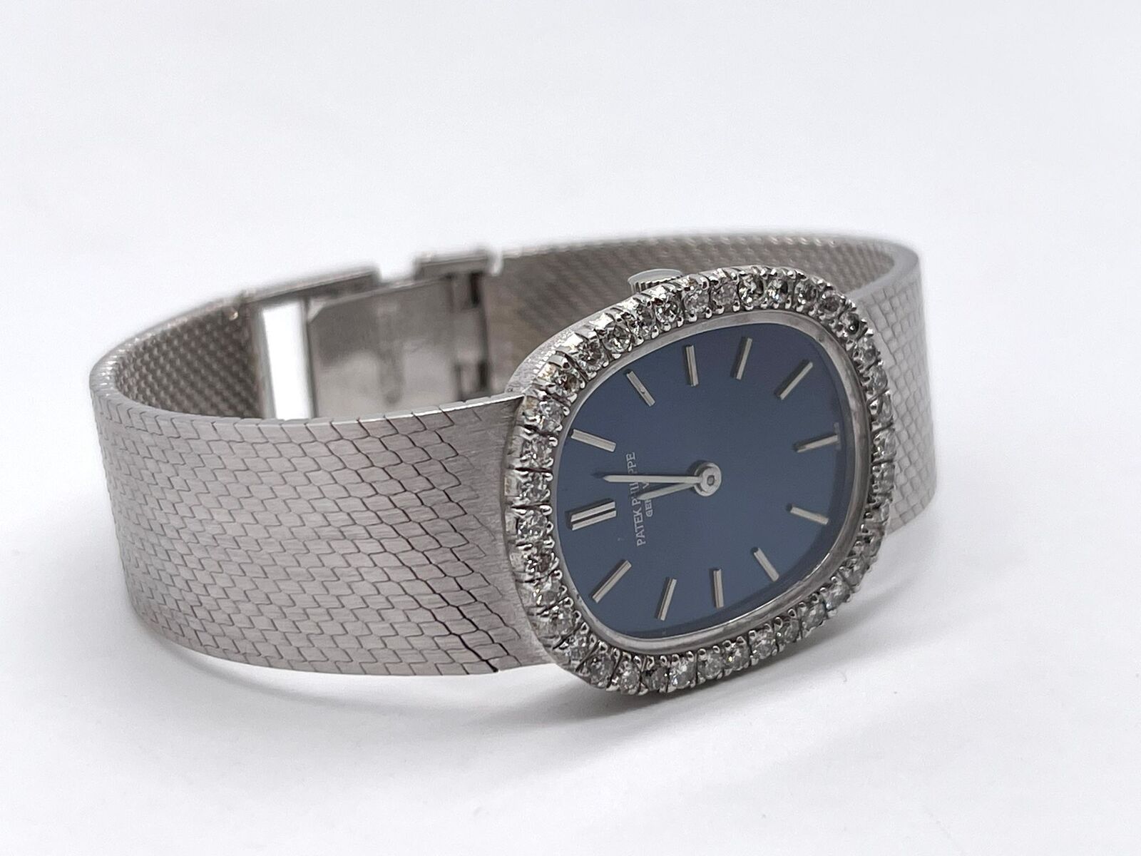 This stunning Patek Philippe Ellipse embodies timeless Swiss luxury. Crafted entirely from solid 18k white gold, it features a dazzling diamond-set bezel that frames a deep blue dial with elegant stick hour markers. The oval 21mm case flows seamlessly into an 18k white gold bracelet, secured with a matching deployant buckle for both comfort and style.