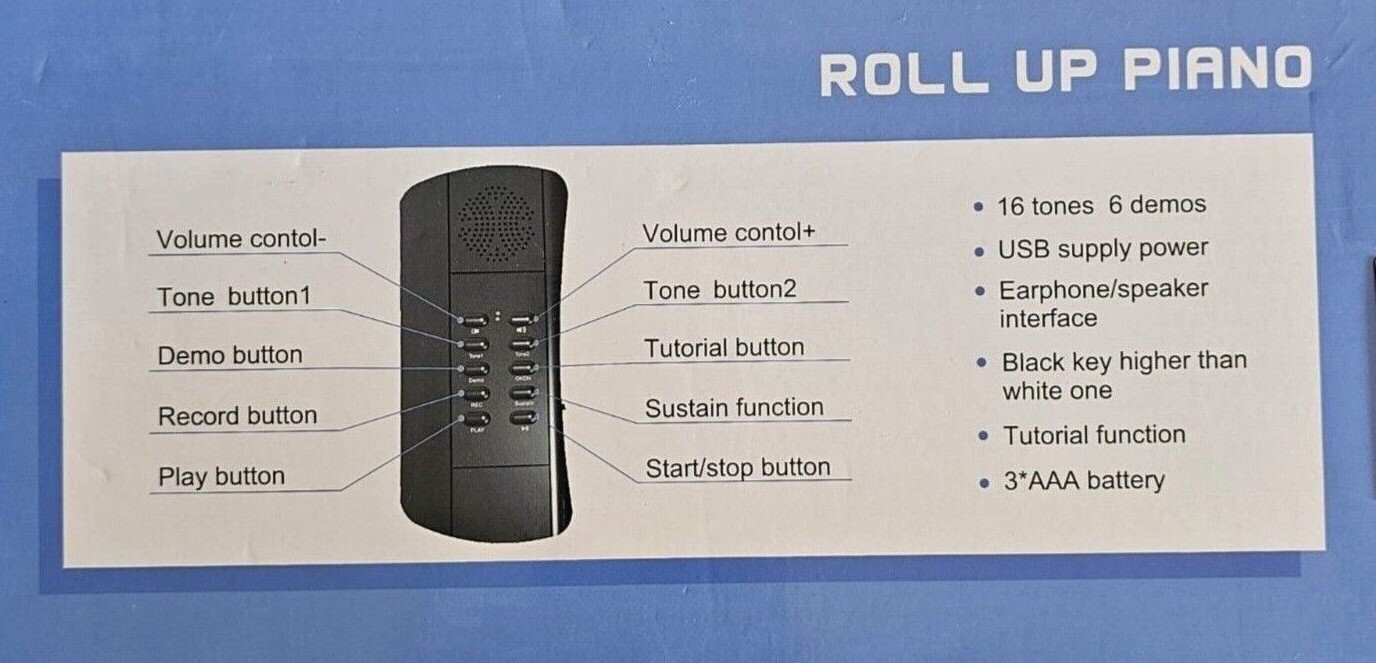 - This roll up piano has 16 tones, 6 demonstration songs, easy recording, editing, playing, sustain, vibrato, teaching, and chord functions.