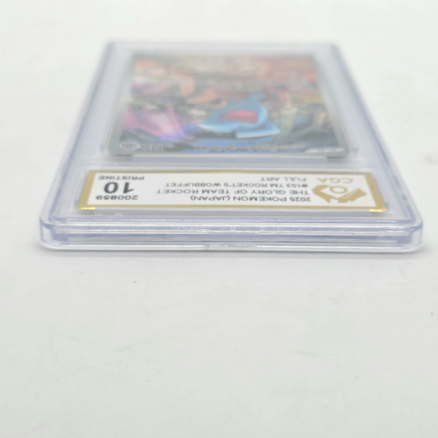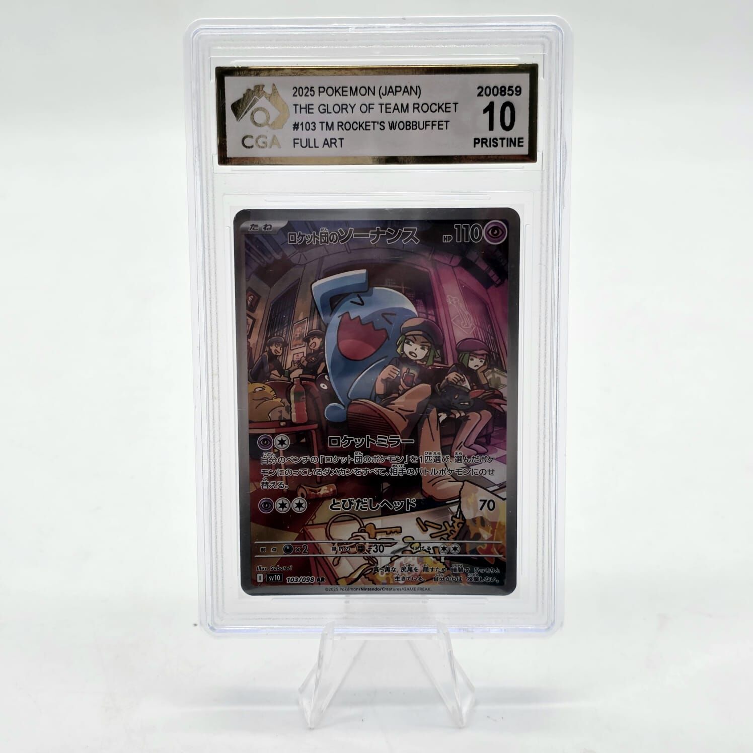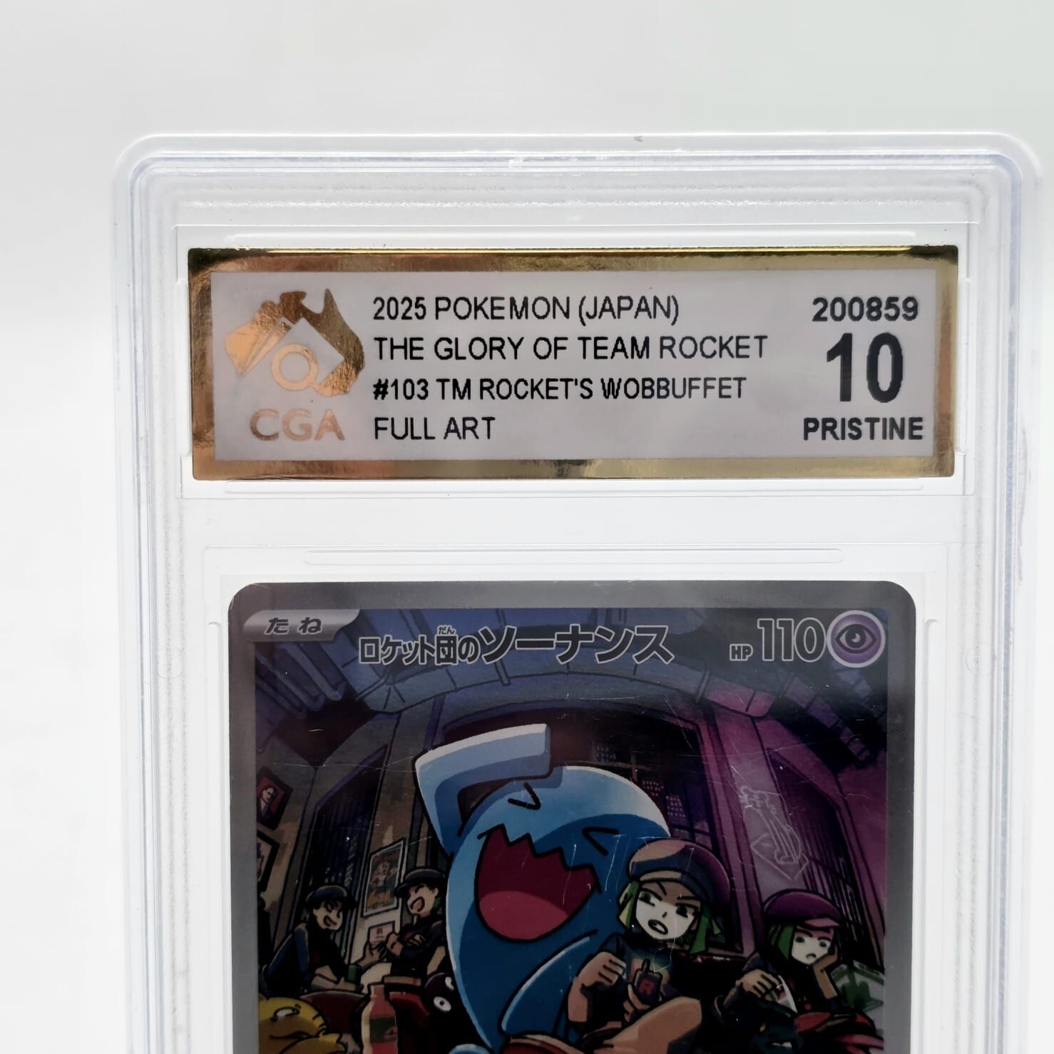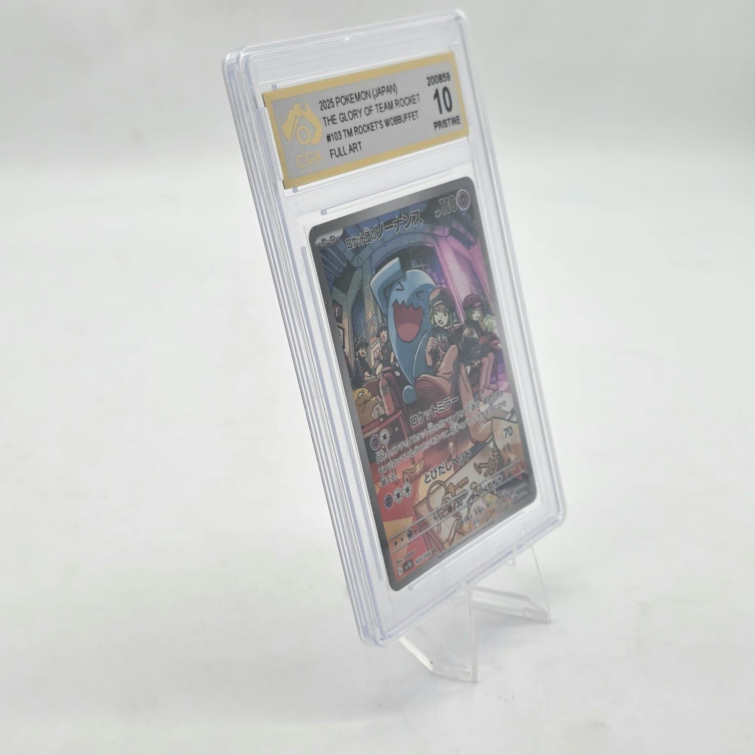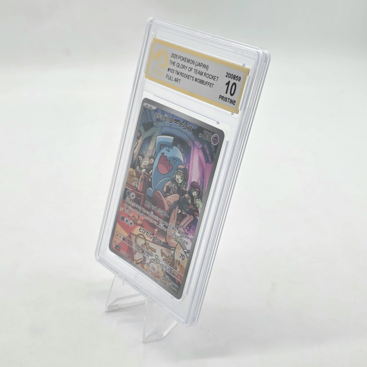 Own a premium collectible from the Pokémon Trading Card Game. This Team Rocket's Wobbuffet #103 Full Art card from The Glory of Team Rocket Japanese set has been professionally graded CGA 10 Pristine, indicating exceptional condition with near-perfect centering, corners, edges, and surface.