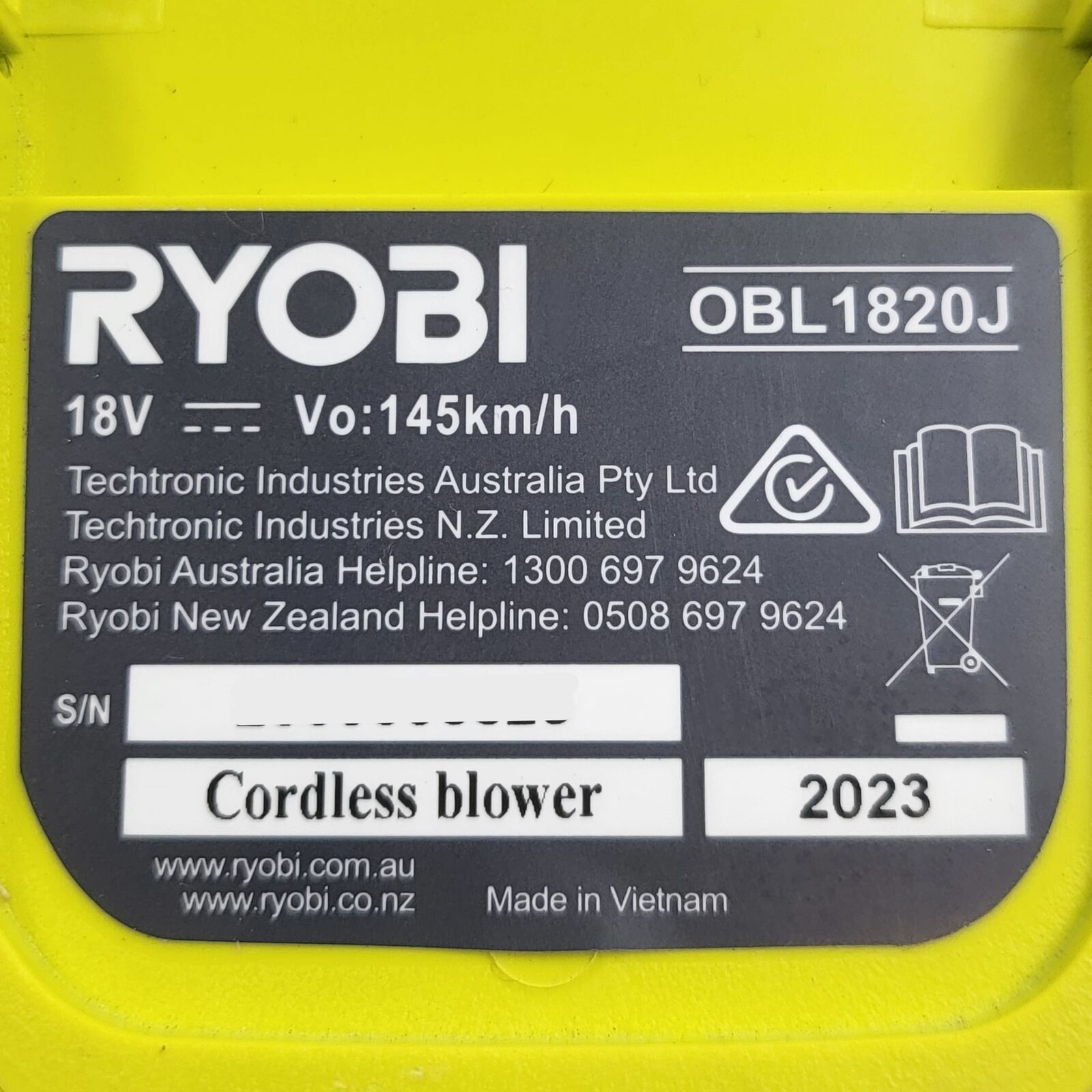 Ryobi OBL1820J 18V ONE+ Cordless Leaf Blower 145km/h with 4.0Ah Battery