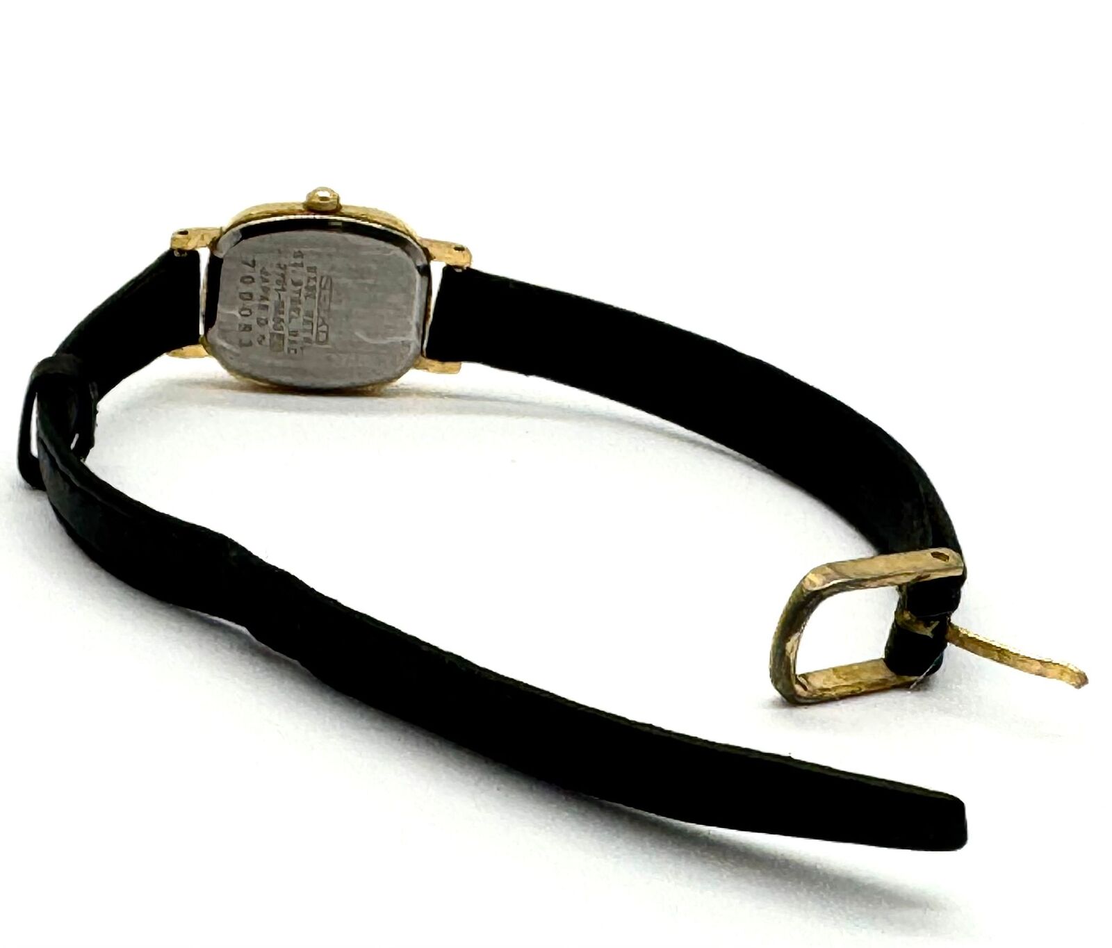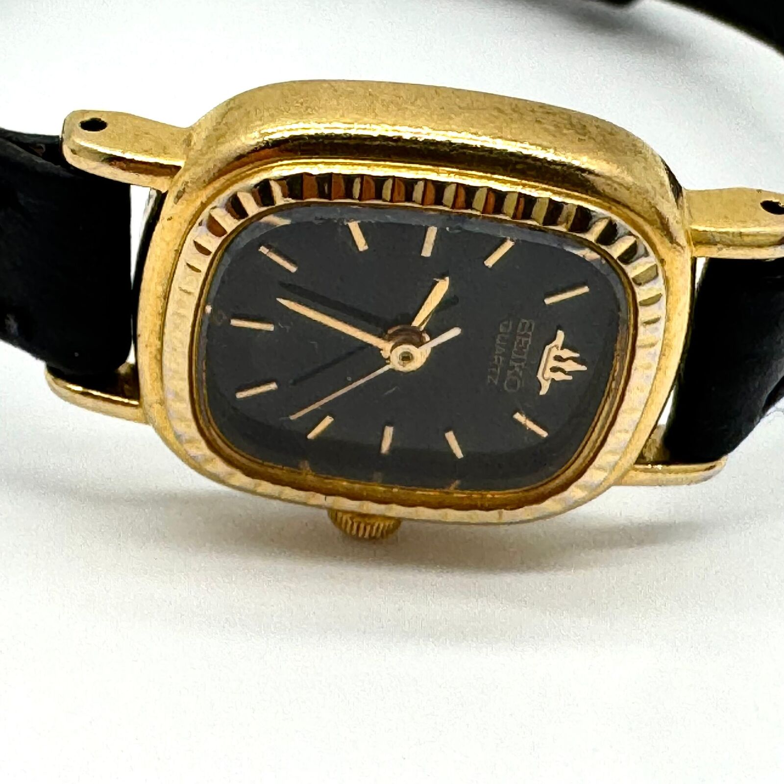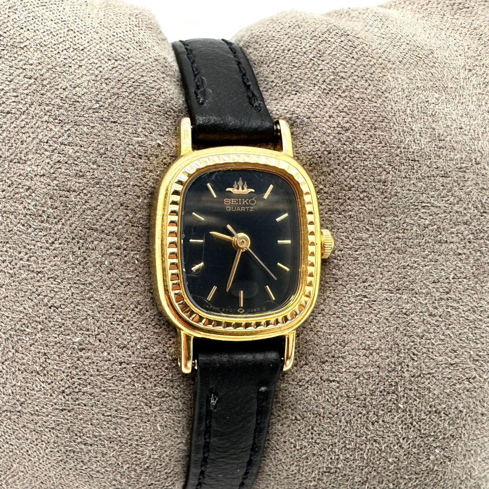 Seiko 2Y01-5A90 analog quartz ladies watch. The timepiece features a black dial with gold-tone baton indices and a three-hand movement. The gold-tone base metal case is oval/tonneau shaped with a textured fluted bezel and a stainless steel caseback. A perfect addition to any collection or a thoughtful gift for those who appreciate understated luxury and dependable timekeeping.