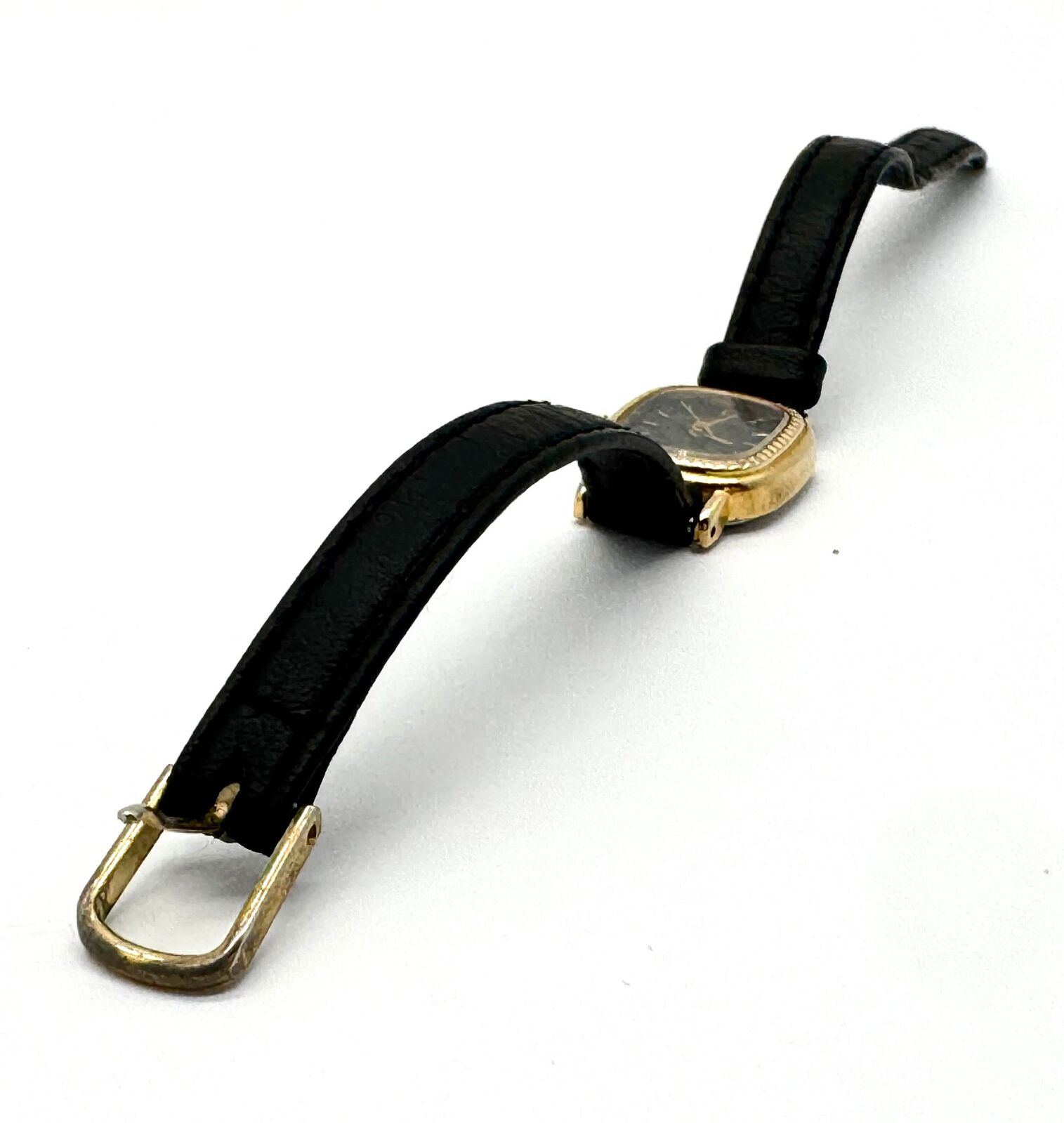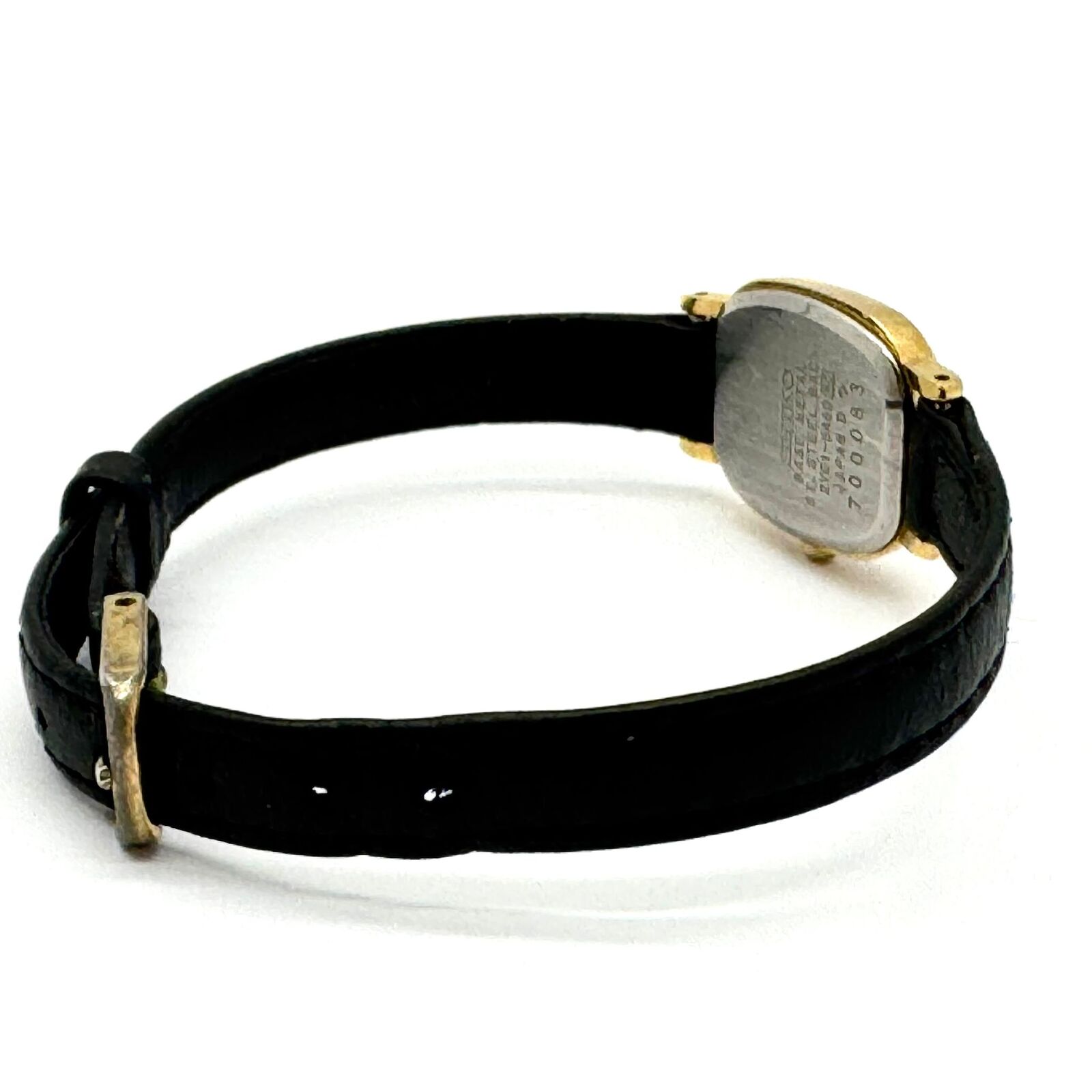- Band: Black leather strap with gold-tone pin buckle