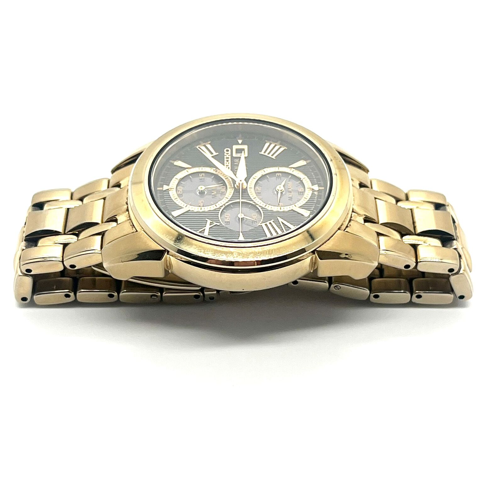This Seiko Prospex Speedtimer Solar Chronograph is a timeless piece featuring a black multi-Roman dial, solar functionality, and water resistance among other notable features. The chronograph function adds a sporty touch, while the gold-plated stainless steel bracelet and sleek design make it suitable for both casual and formal occasions.