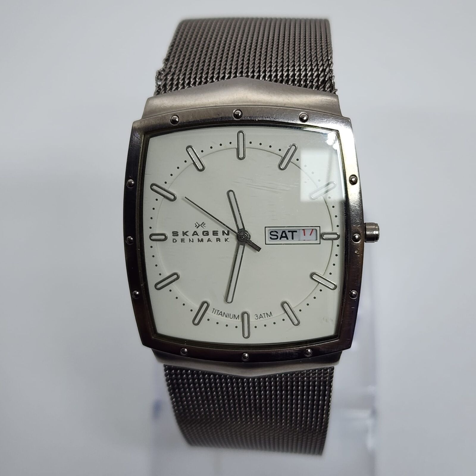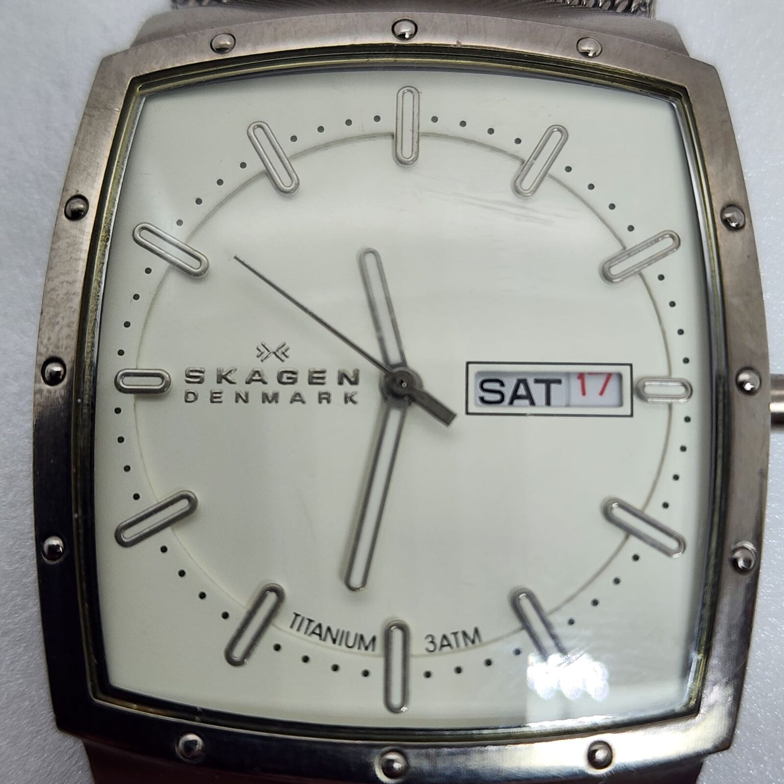 - Vintage Skagen design with a rectangular barrel-shaped case