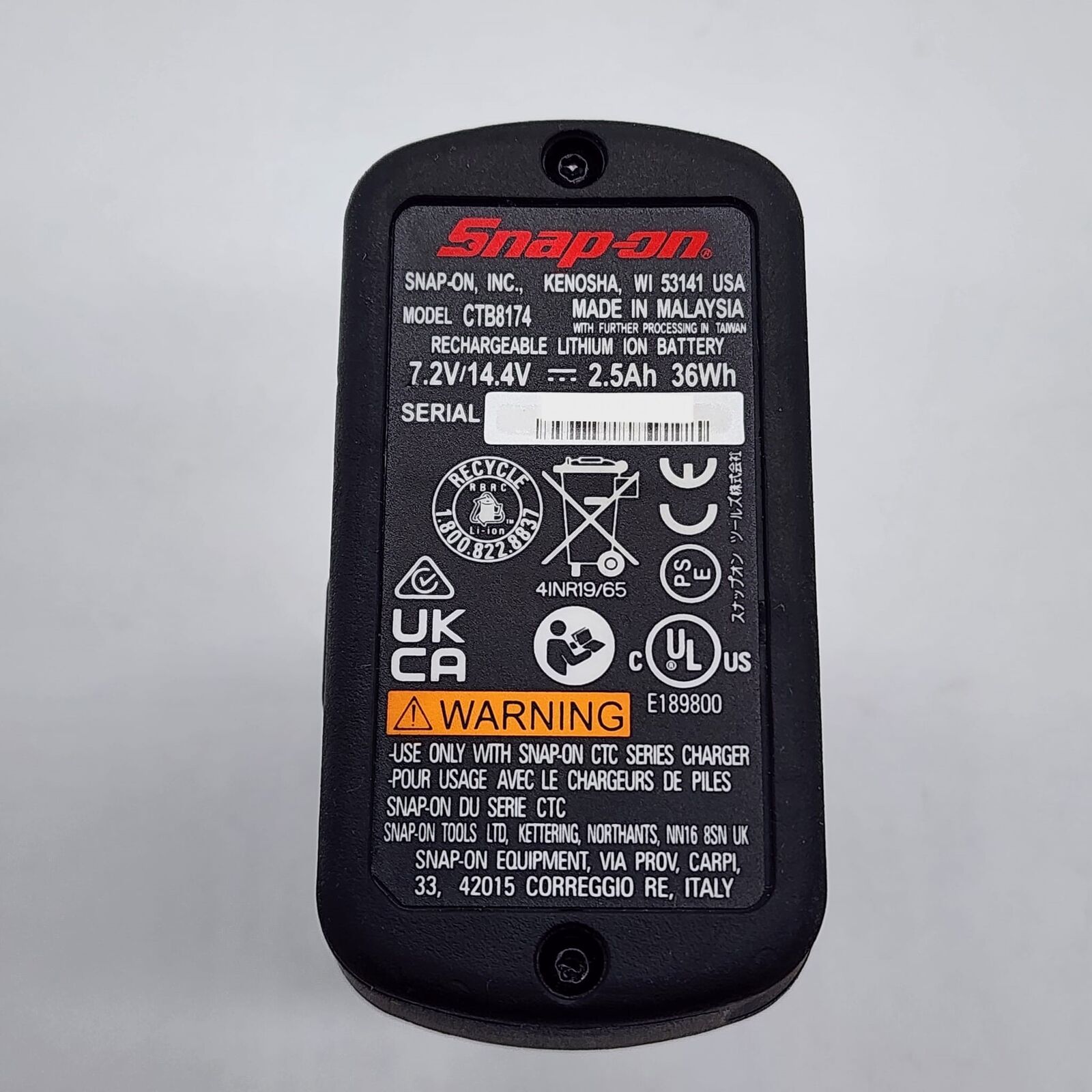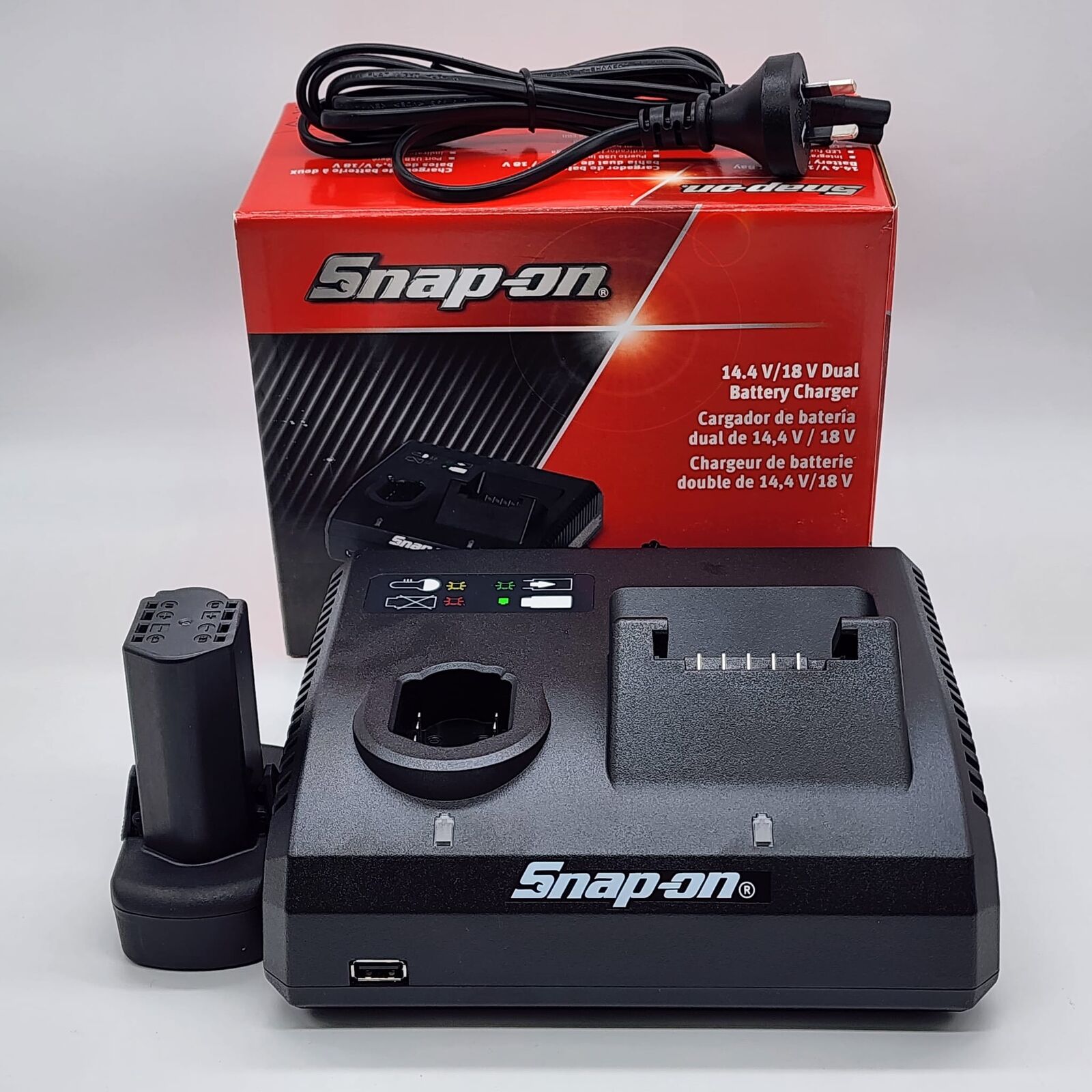 - Dual voltage charger compatible with 14.4V and 18V Snap-on batteries