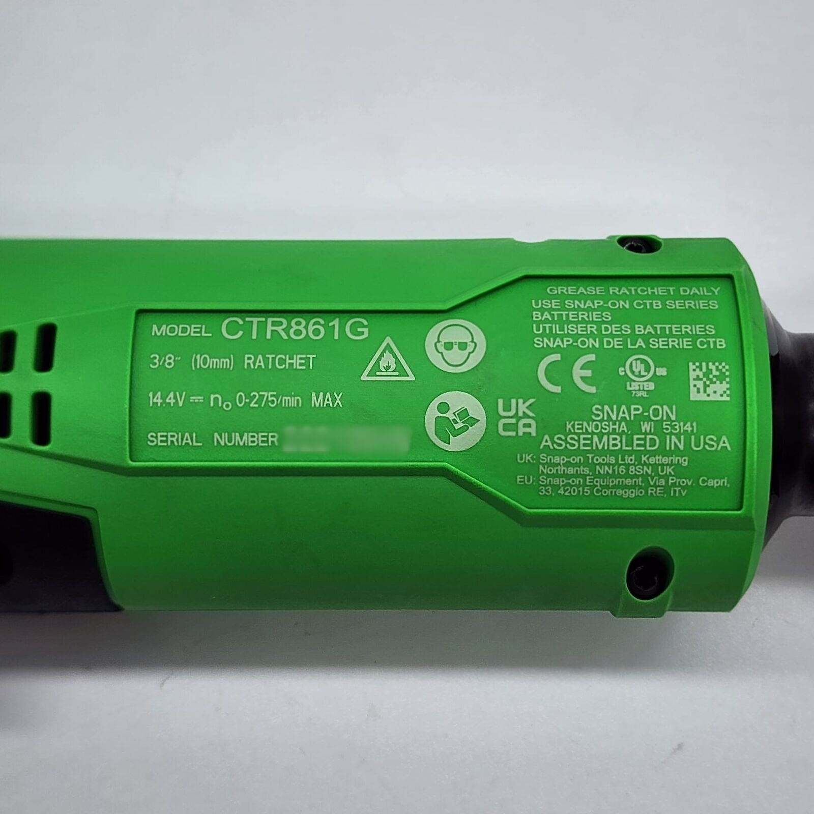 The Snap-on CTR861G 3/8" Drive Cordless Ratchet delivers professional-grade performance in a compact, ergonomic design. Powered by a 14.4V lithium-ion battery, this tool provides reliable torque and speed for automotive, mechanical, and workshop applications.