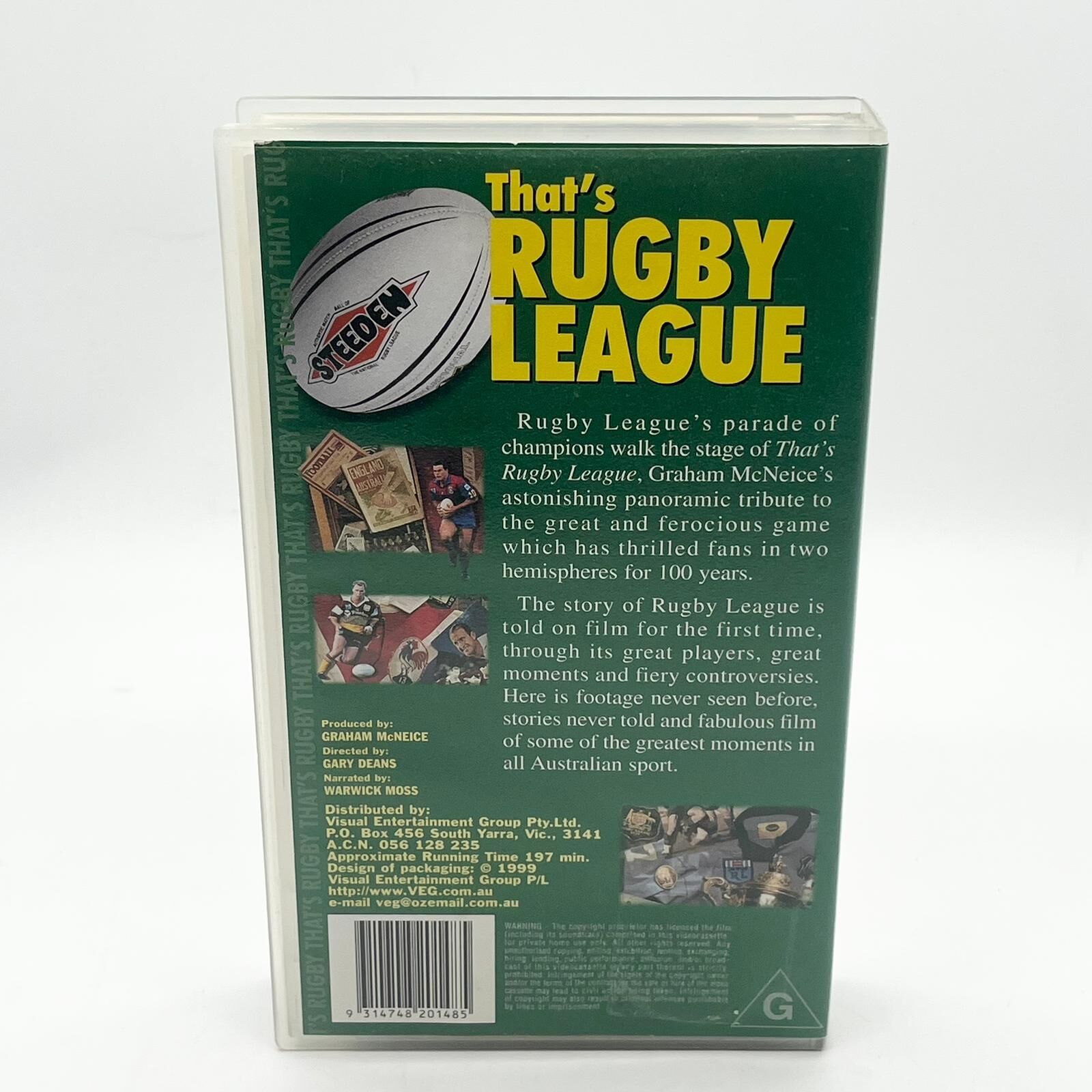 Relive 100 years of Australian Rugby League history with "That's Rugby League VEG 148" VHS by Graham McNeice. This panoramic tribute showcases champions, iconic players, unforgettable moments, and rare footage of fiery controversies never seen before. Perfect for rugby fans seeking authentic archival sports memorabilia in VHS format.