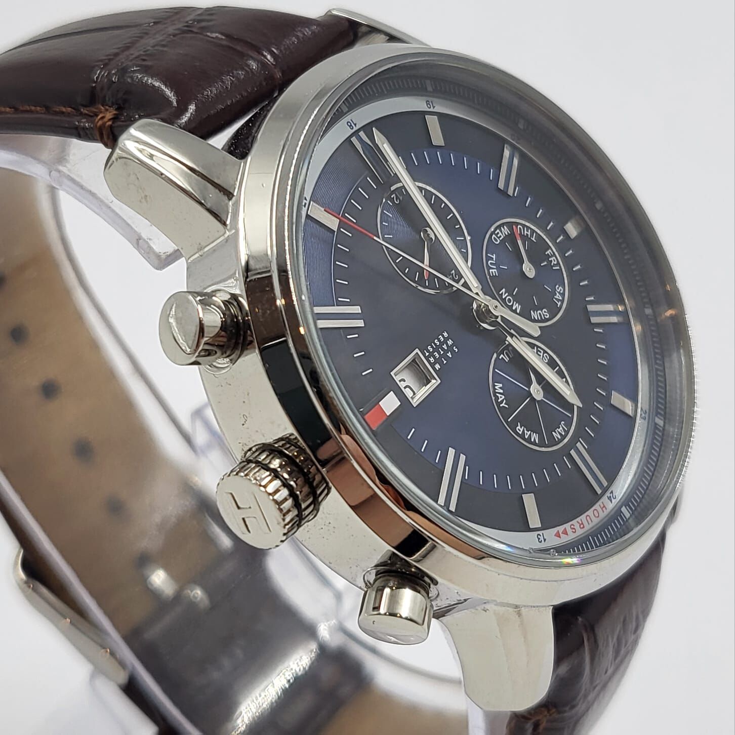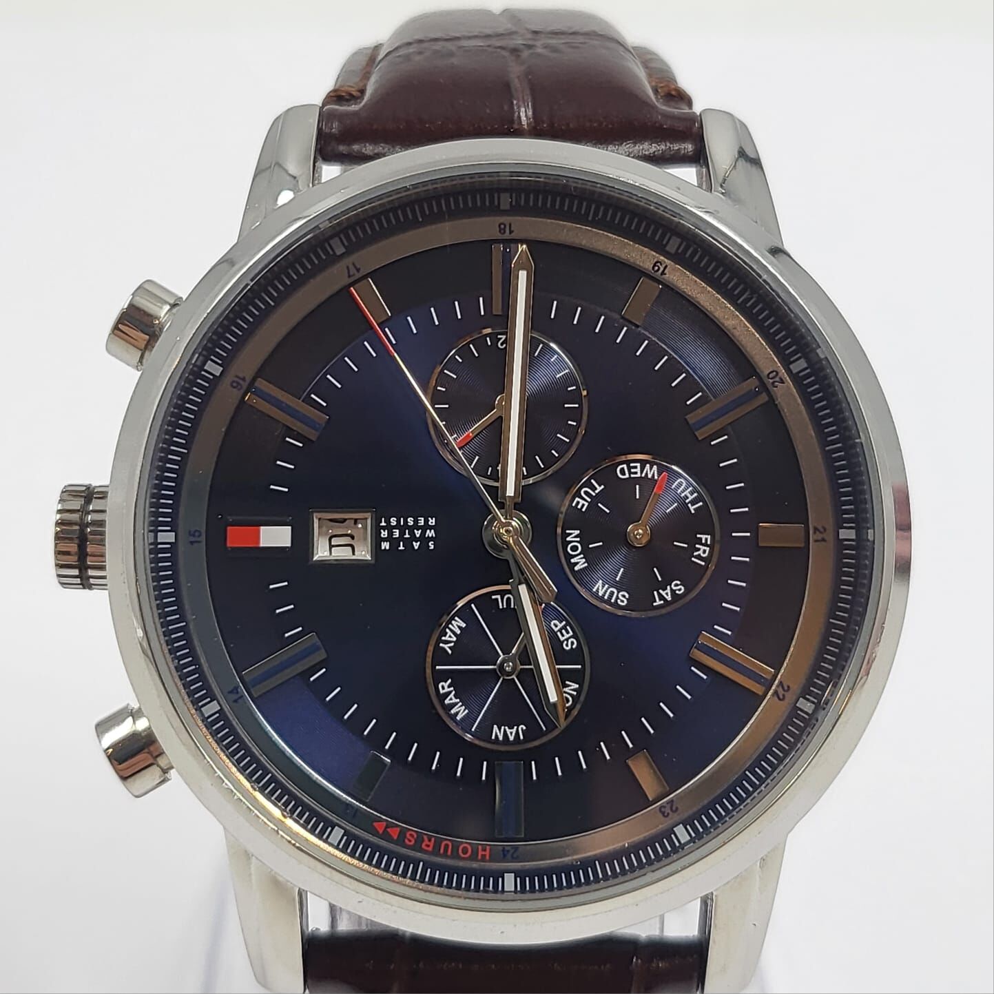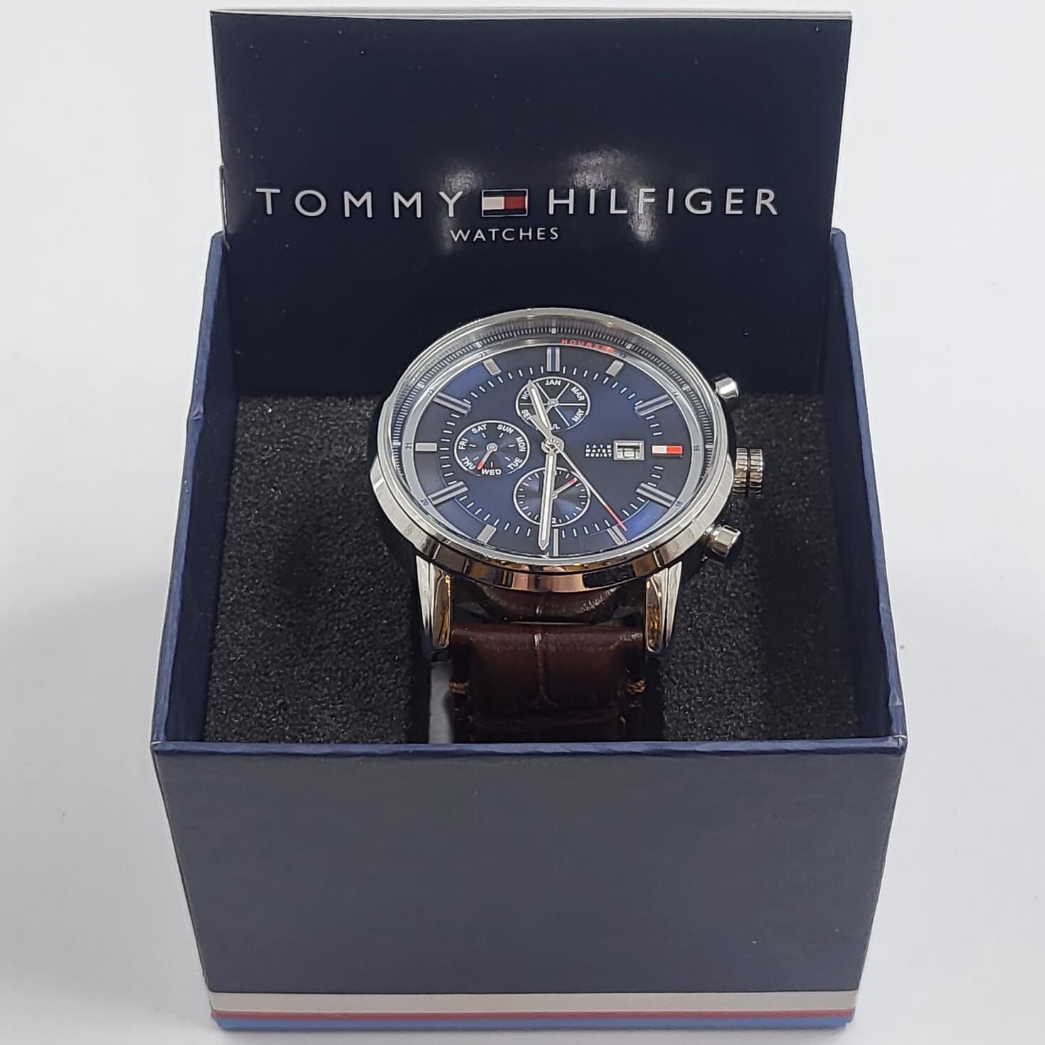The rich brown leather strap offers all-day comfort and a premium feel, perfect for business casual or weekend outings. Subtle chronograph subdials, date window, and day-of-week display add practical utility without overwhelming the clean, iconic Tommy Hilfiger aesthetic. Crafted for the discerning man, this watch combines elegance with everyday wearability. Ideal for gifting or personal collection.