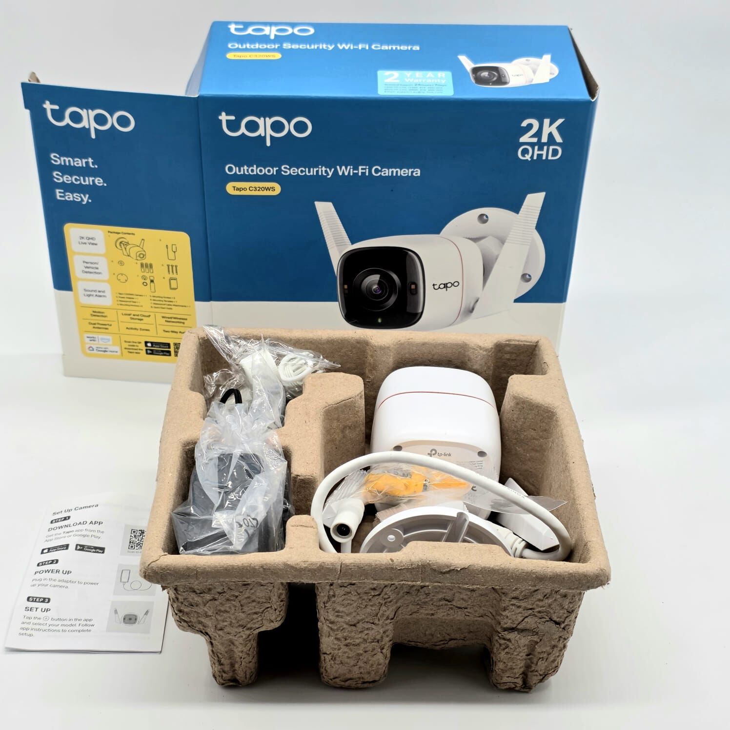 Experience reliable outdoor surveillance with the TP-Link Tapo C320WS. This 2K QHD outdoor security camera delivers crisp daytime and full-color night vision, weatherproof IP66 protection, and flexible connectivity via wired Ethernet or Wi‑Fi. Features include motion detection with real-time alerts, two-way audio, and local storage via microSD or by using Tapo Care cloud storage services for quick footage access. Supports voice control with select assistants. Easy installation, compact design, and energy-efficient operation. Ideal for yards, driveways, and entryways.