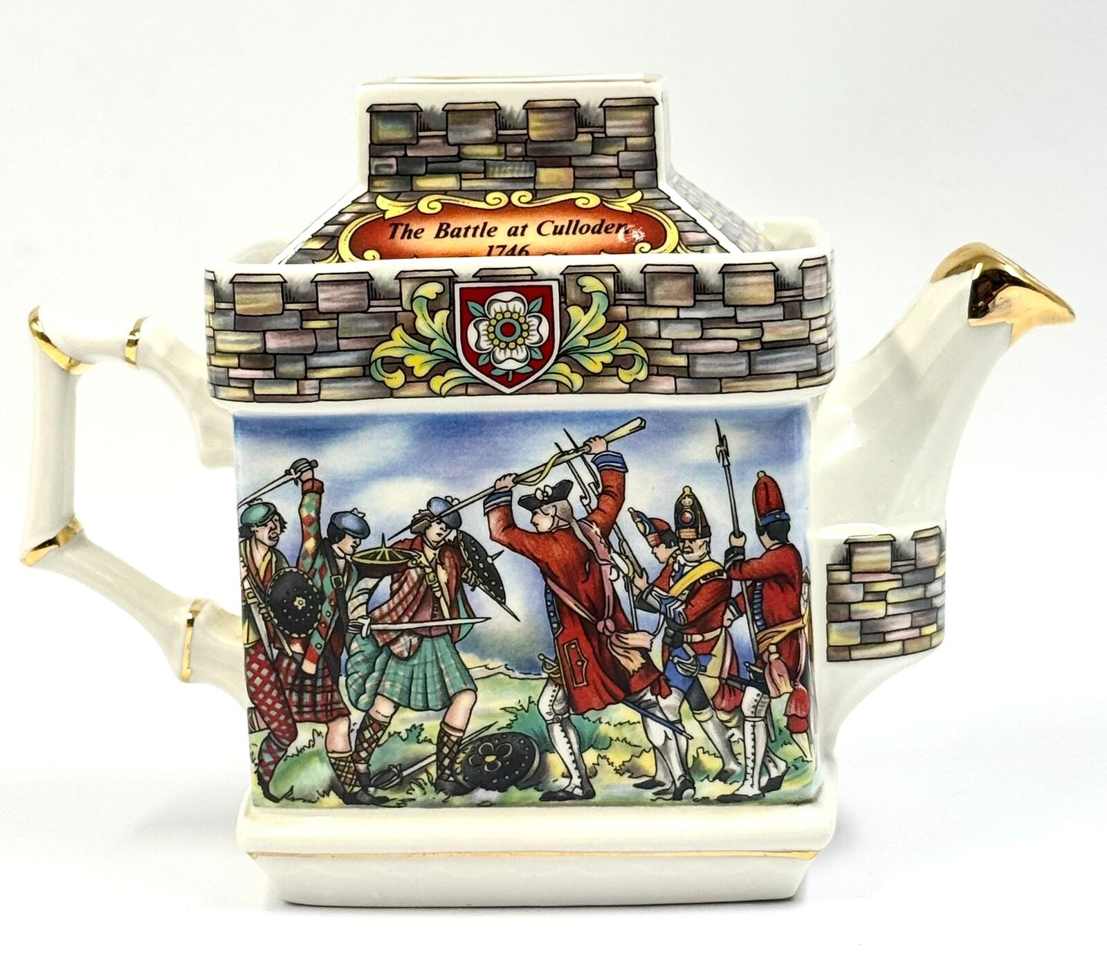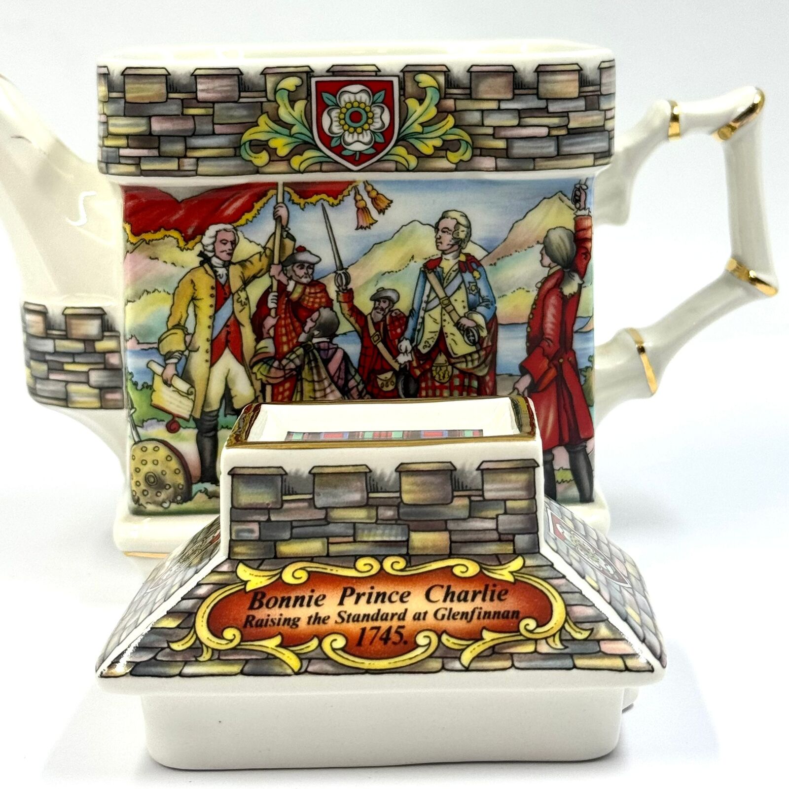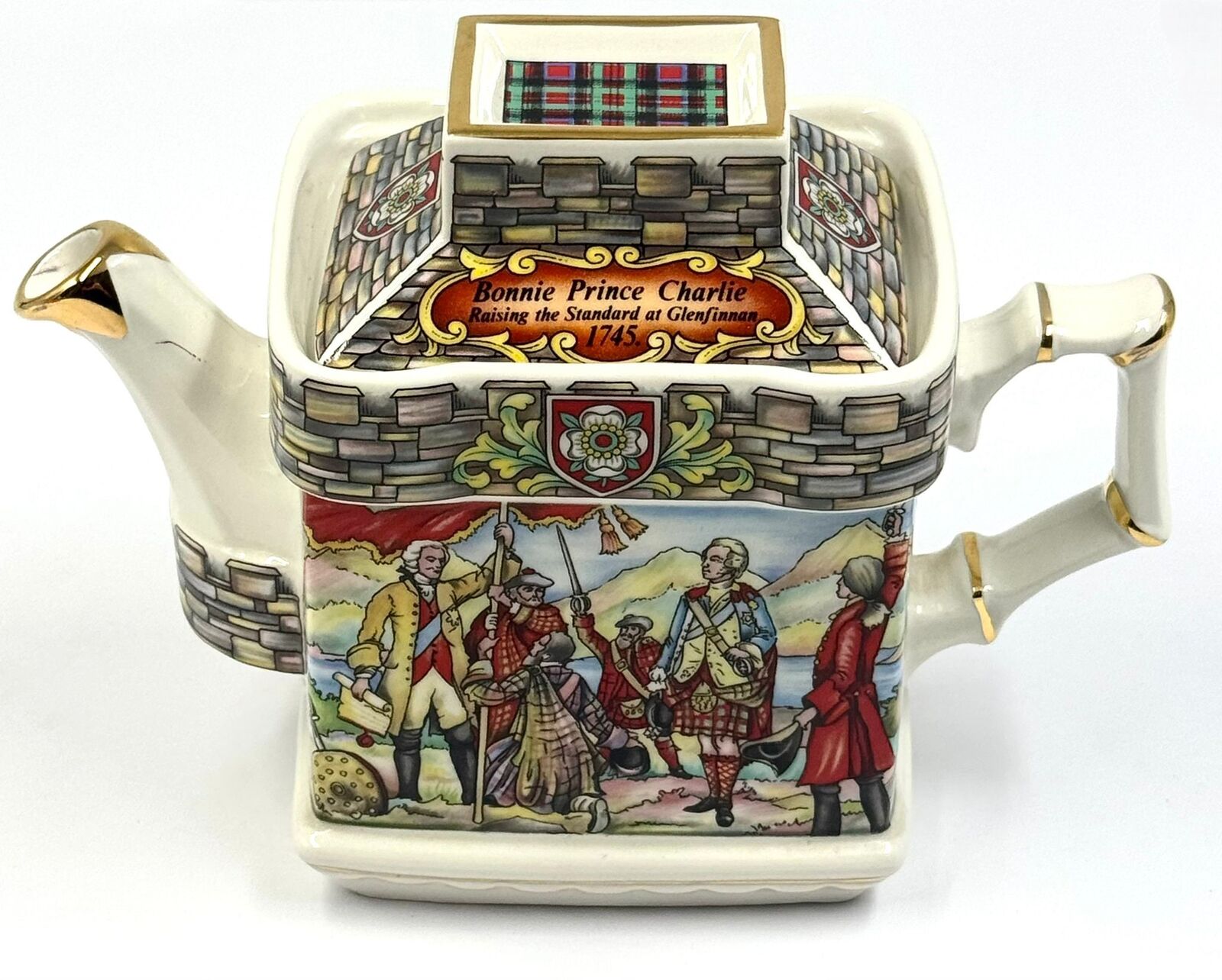 This vintage Sadler England teapot commemorates the Jacobite Rising of 1745 and the campaign of Prince Charles Edward Stuart, known as Bonnie Prince Charlie. The ceramic body features a rectangular architectural shape with a castle-inspired aesthetic, including a tiered turret-style lid topped with a tartan-patterned finial. The front panel depicts the scene "Bonnie Prince Charlie Raising the Standard at Glenfinnan, 1745," while the reverse illustrates "The Battle at Culloden, 1746."