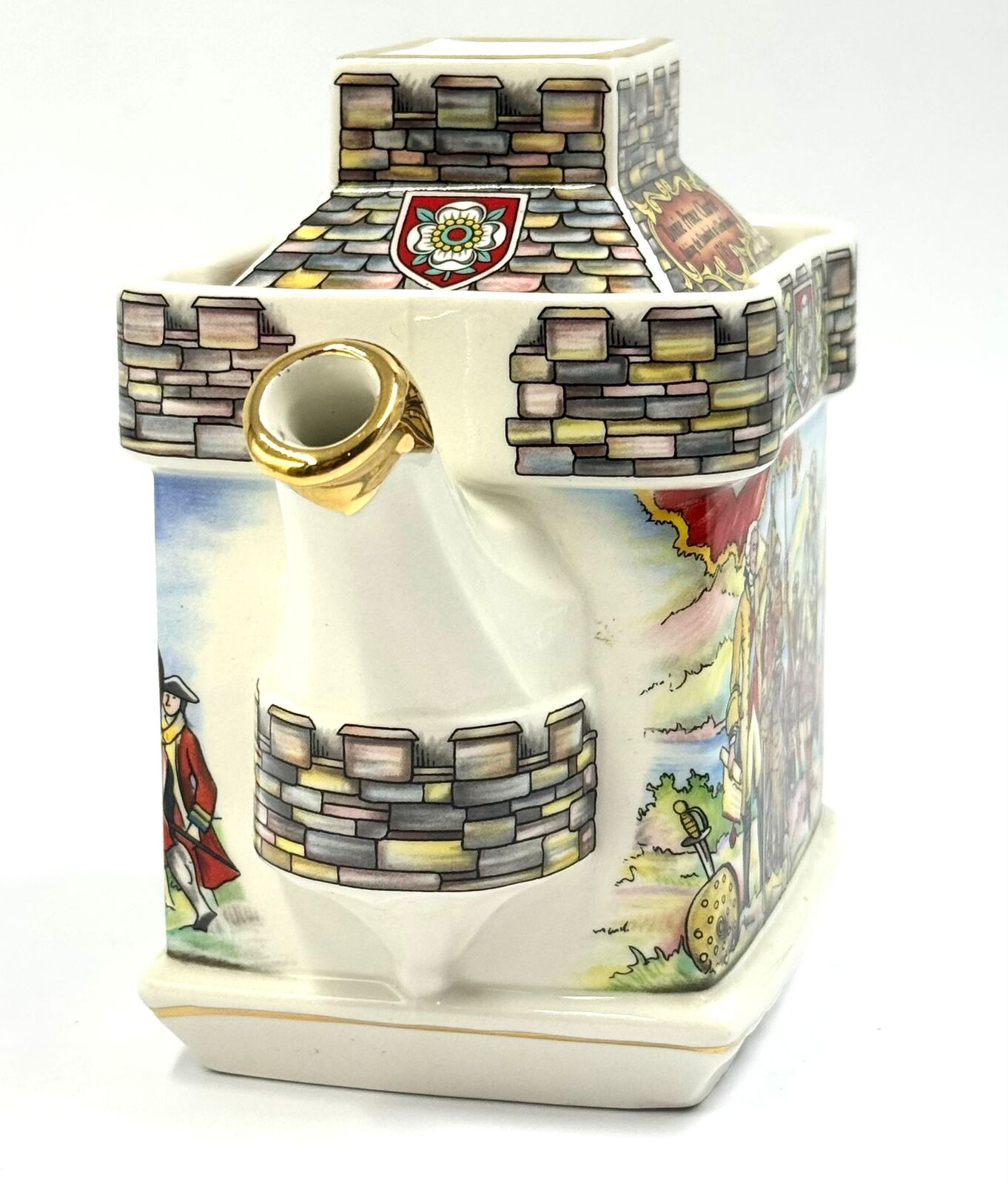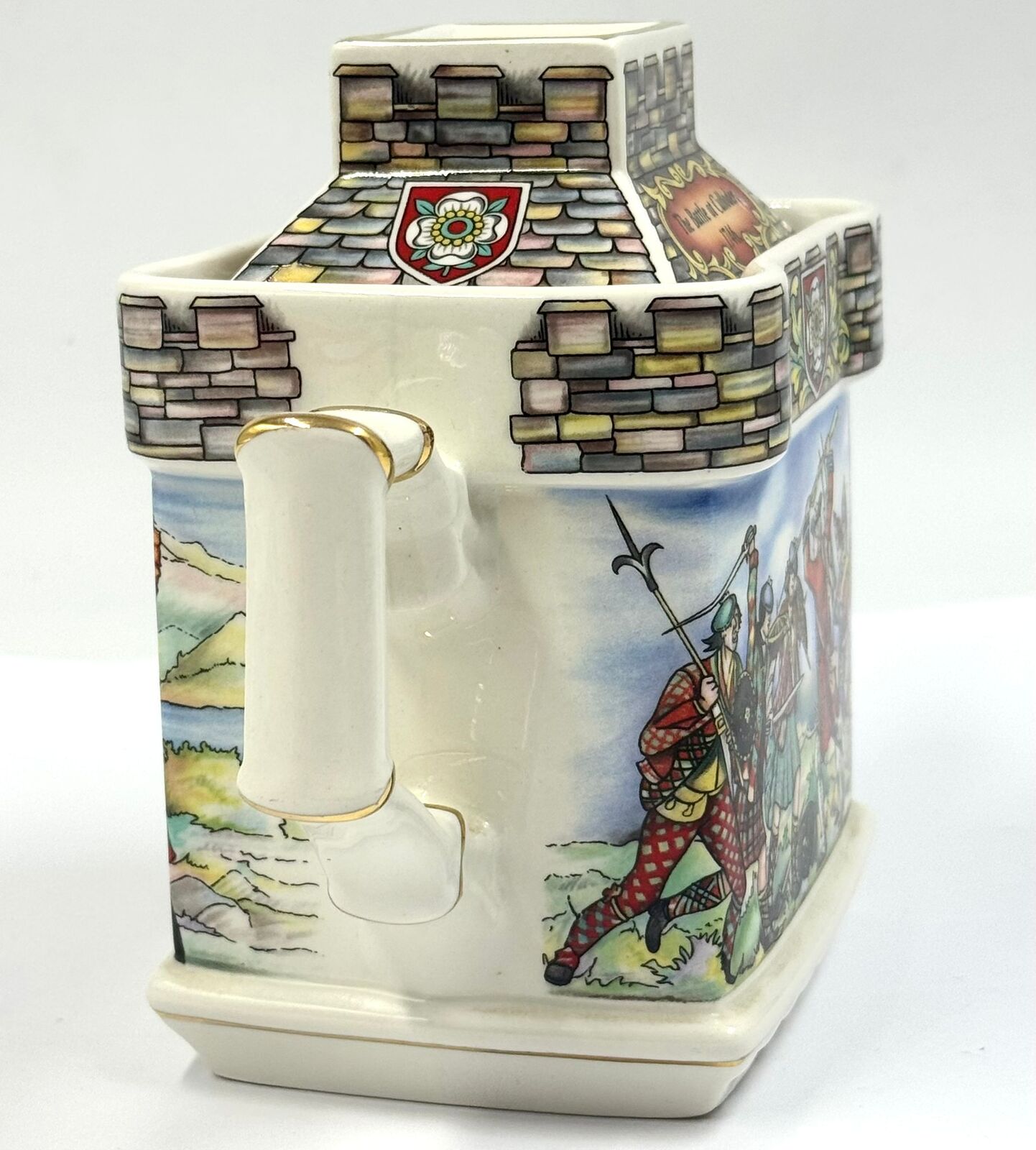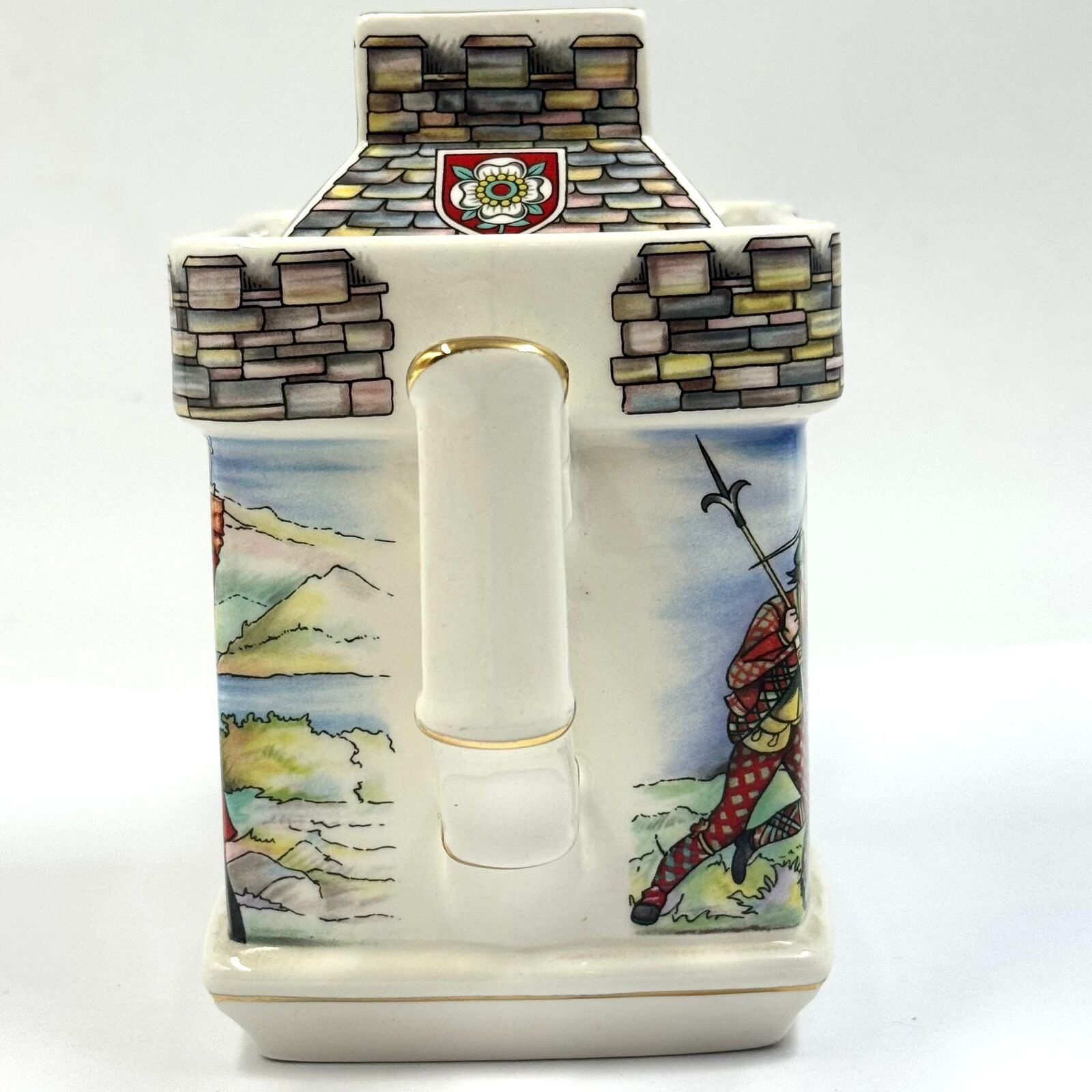 - Lid: Castle turret-style lid with a tartan-patterned finial